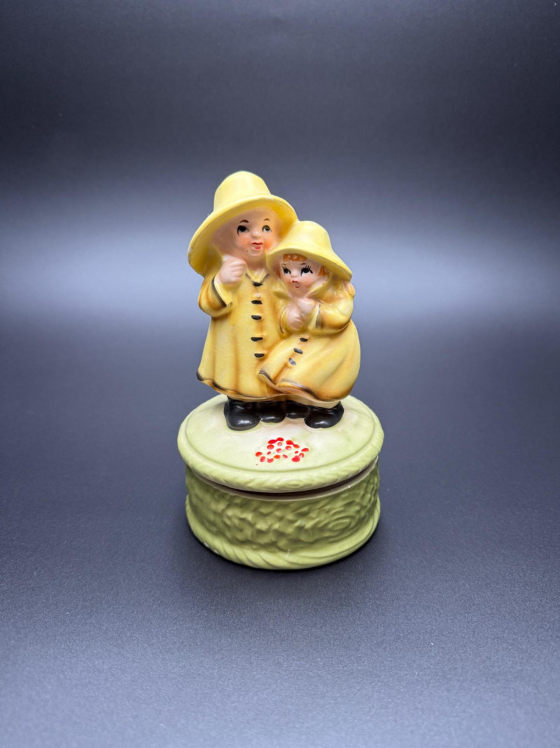 Vintage Japan Music Box Boy and Girl Raincoat Figurine. 7 x 4