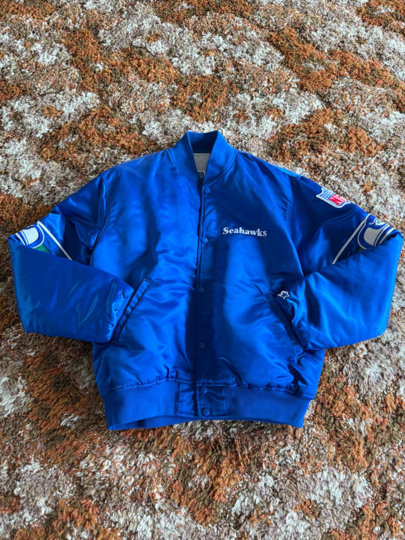 Classic Seattle Seahawks NFL Starter jacket in vibrant royal blue with embroidered logo on the chest and bold sleeve graphics. Features quilted white interior lining, front snap buttons, ribbed cuffs and hem, and side pockets. Measurements: Pit to pit: 21.5" Neck to hem: 22"