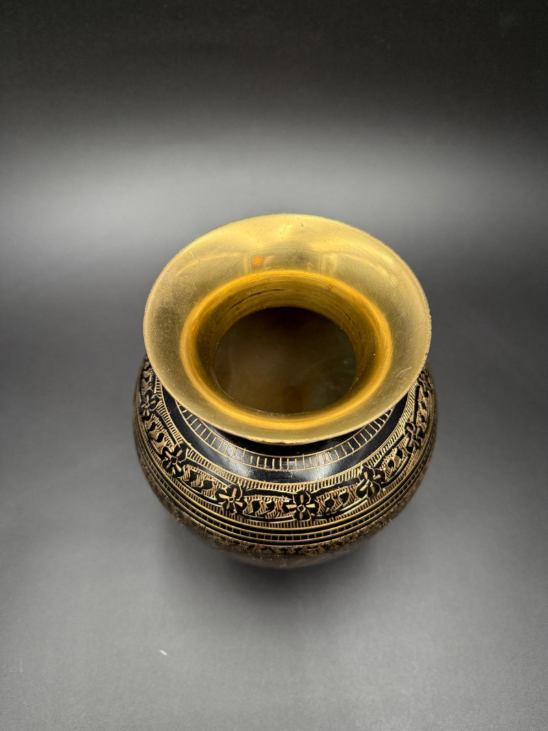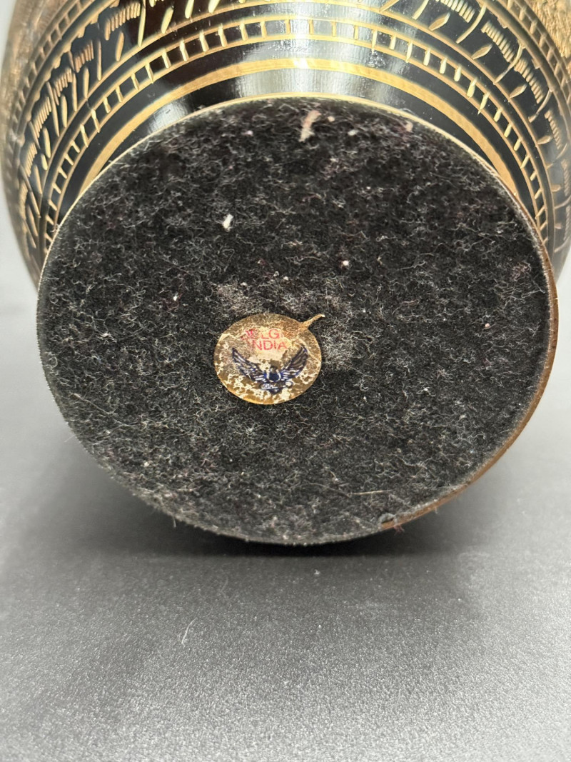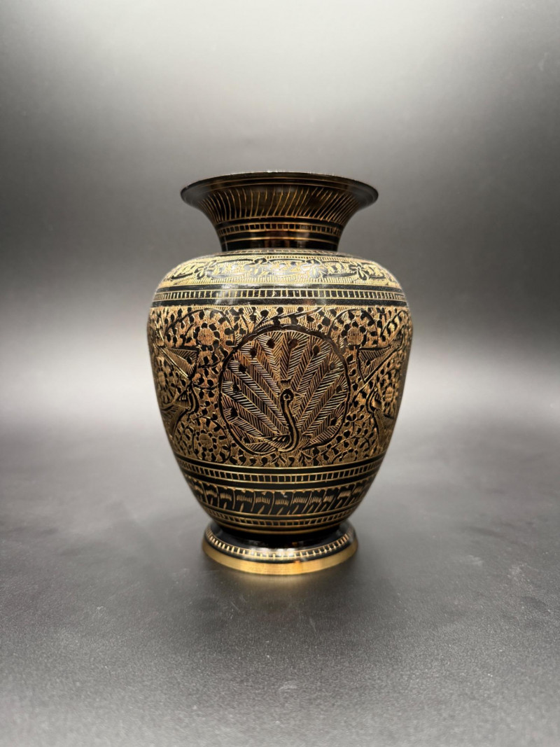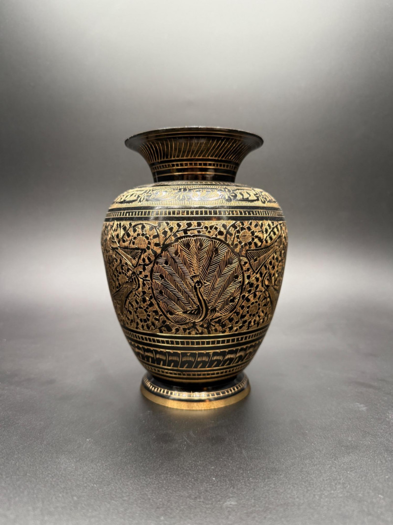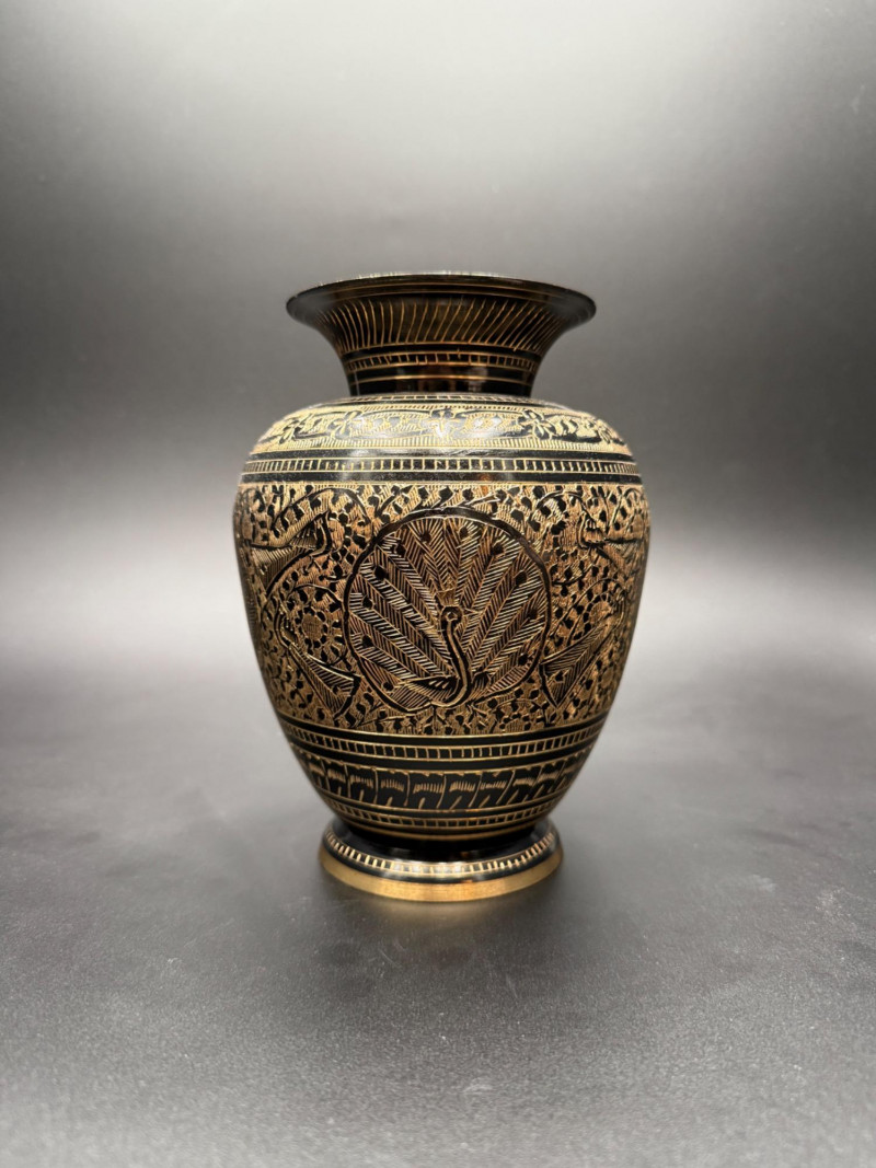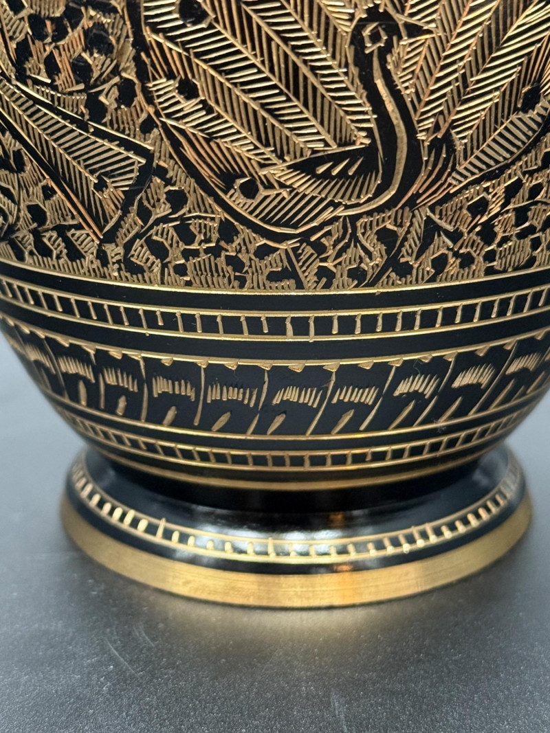 Hand Etched Peacock India Brass Vase. 3.75" D x 7" H