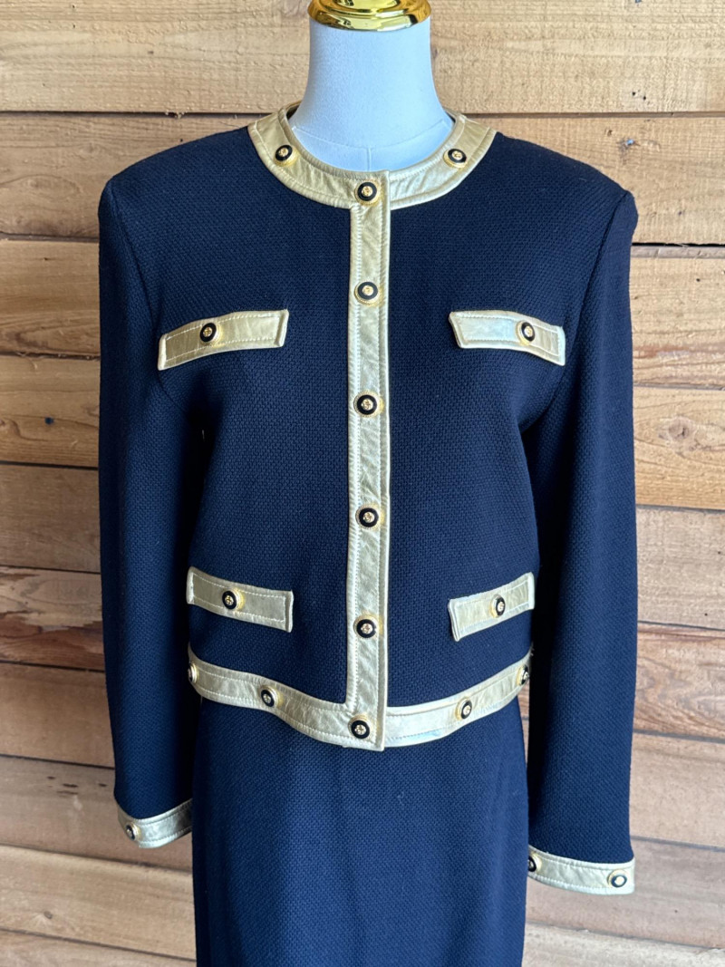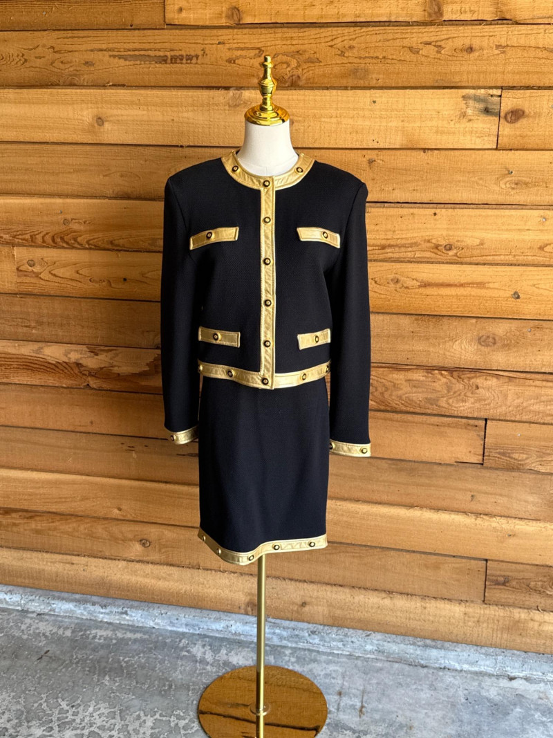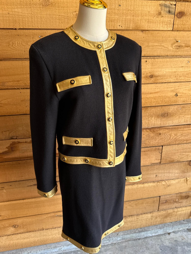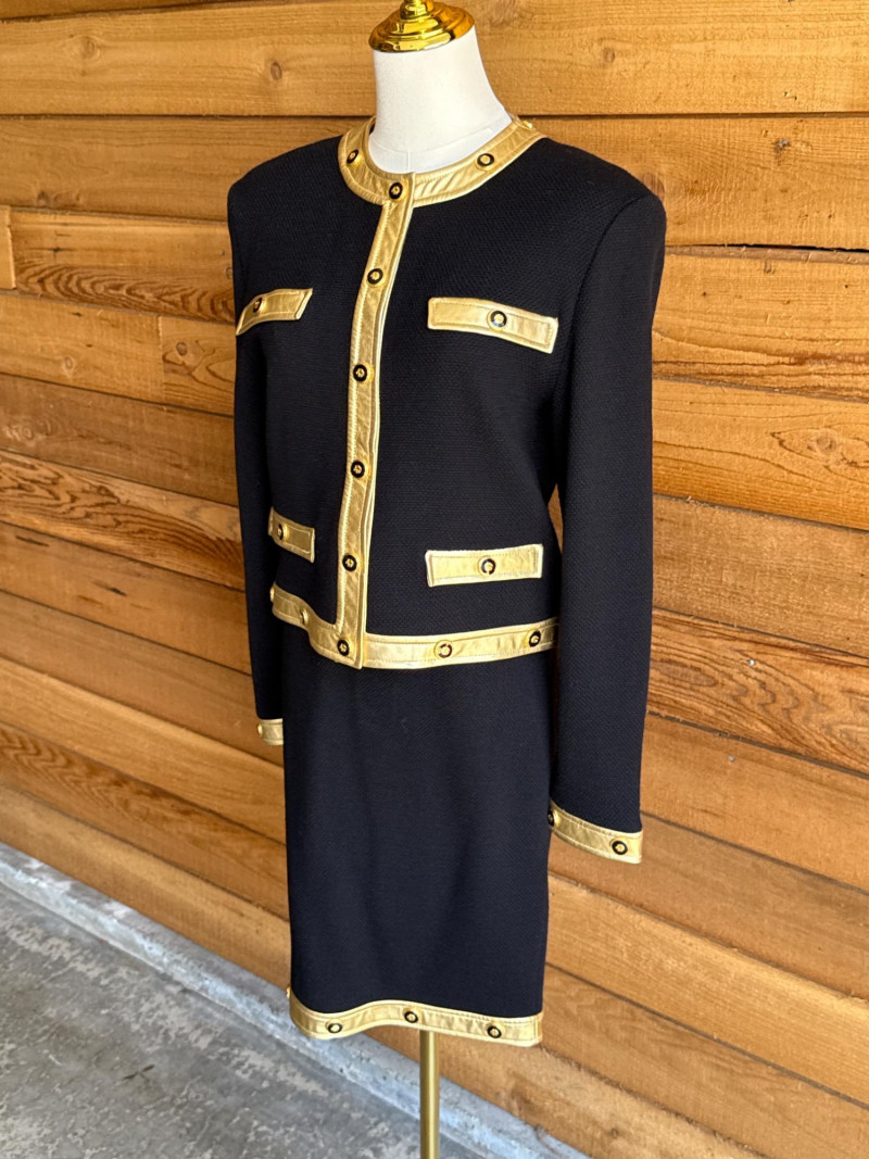 Lot # 48 - ST JOHN Black & Gold Skirt Suit w/ Leather Trim- Sz 8