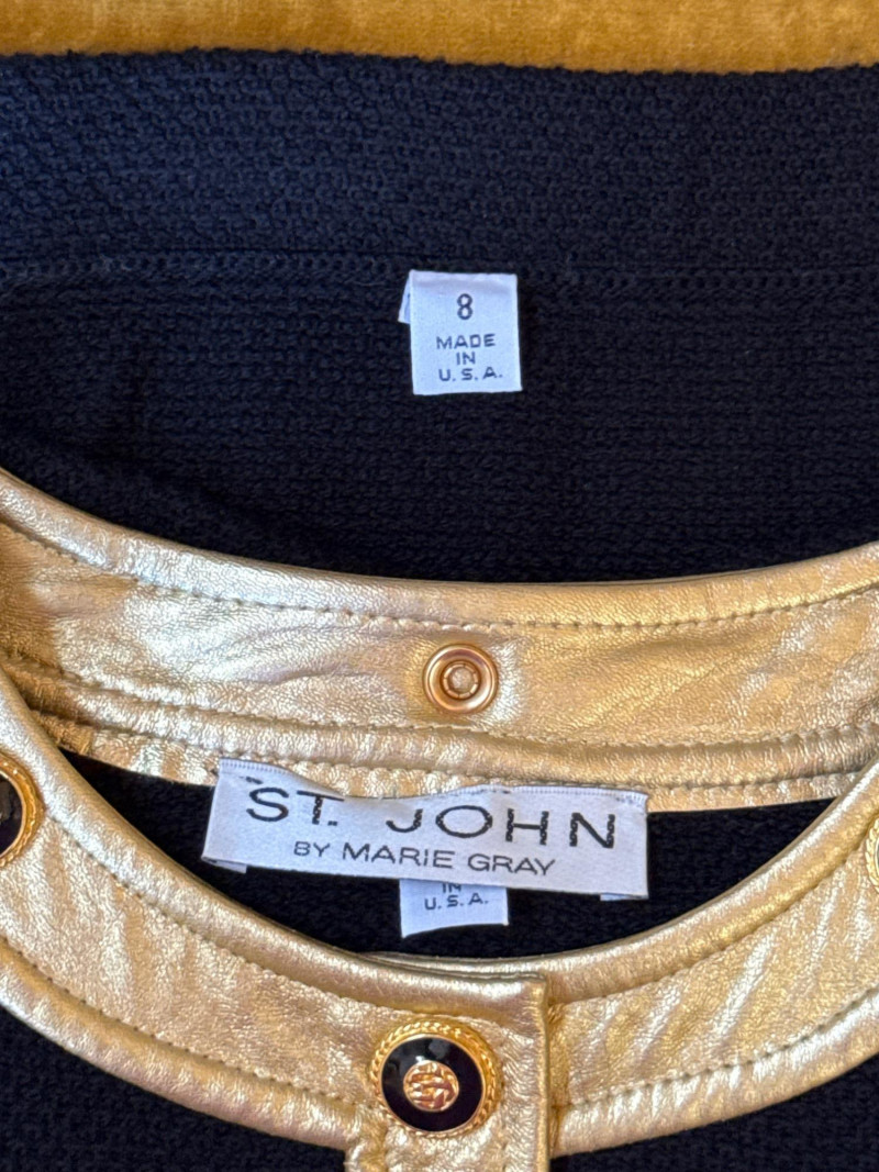 ST JOHN Black & Gold Skirt Suit w/ Leather Trim- Sz 8 PLEASE NOTE DIFFERENT PICKUP TIMES THAN TYPICAL FOR SOUND ESTATE AUCTIONS Pickups will be Wednesday, July 30th and Thursday, July 31st, Saturday, August 2nd from 4-6pm (firm by 6pm on Thursday) If you can not make these times, PLEASE ask for alternate available times or shipping. Shipping times will be up to 2 weeks after auction closes. Please call/text Jessica 253-350-0864 *All items will need to be collected by August 15