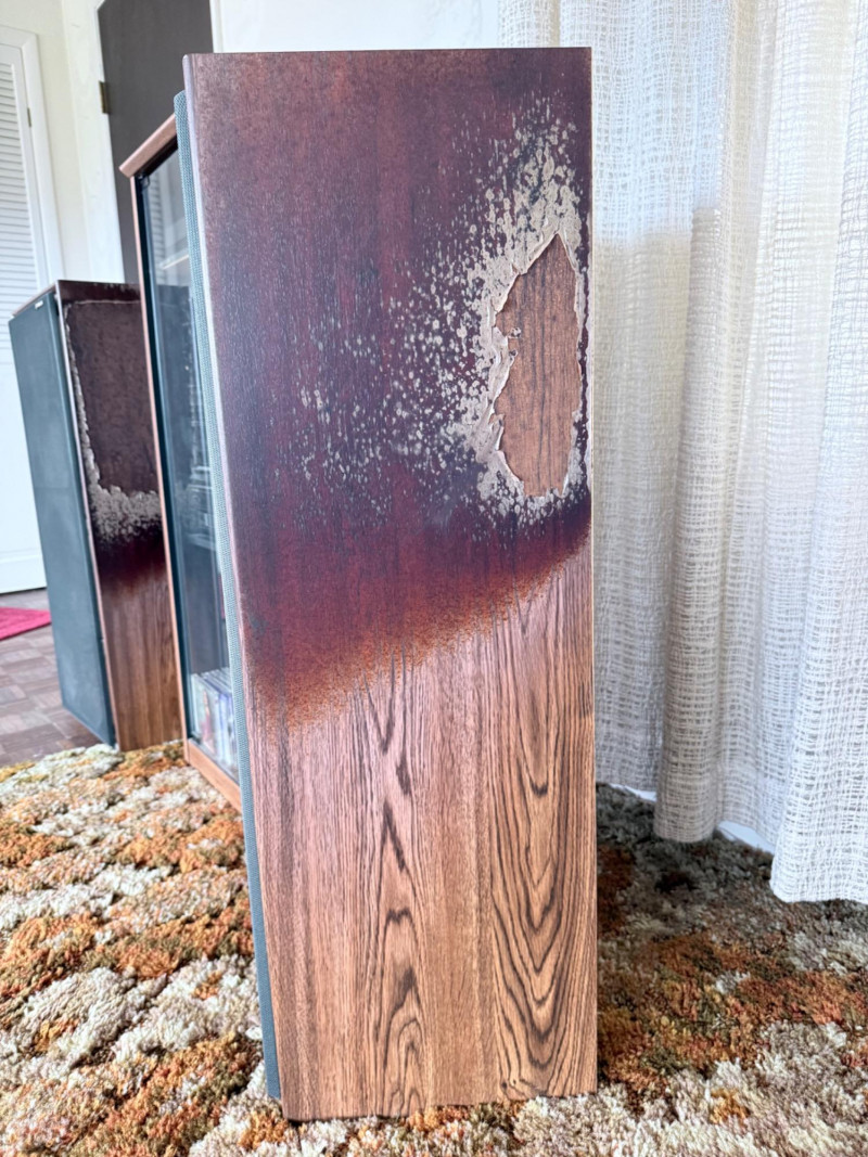 speakers measure- 15" W x 35.5 T x 12" D Stereo cabinet measures- 42" T x 15.5 D x 18" D (see side damage in photos) does not compromise stereo. Please note turntable does not work