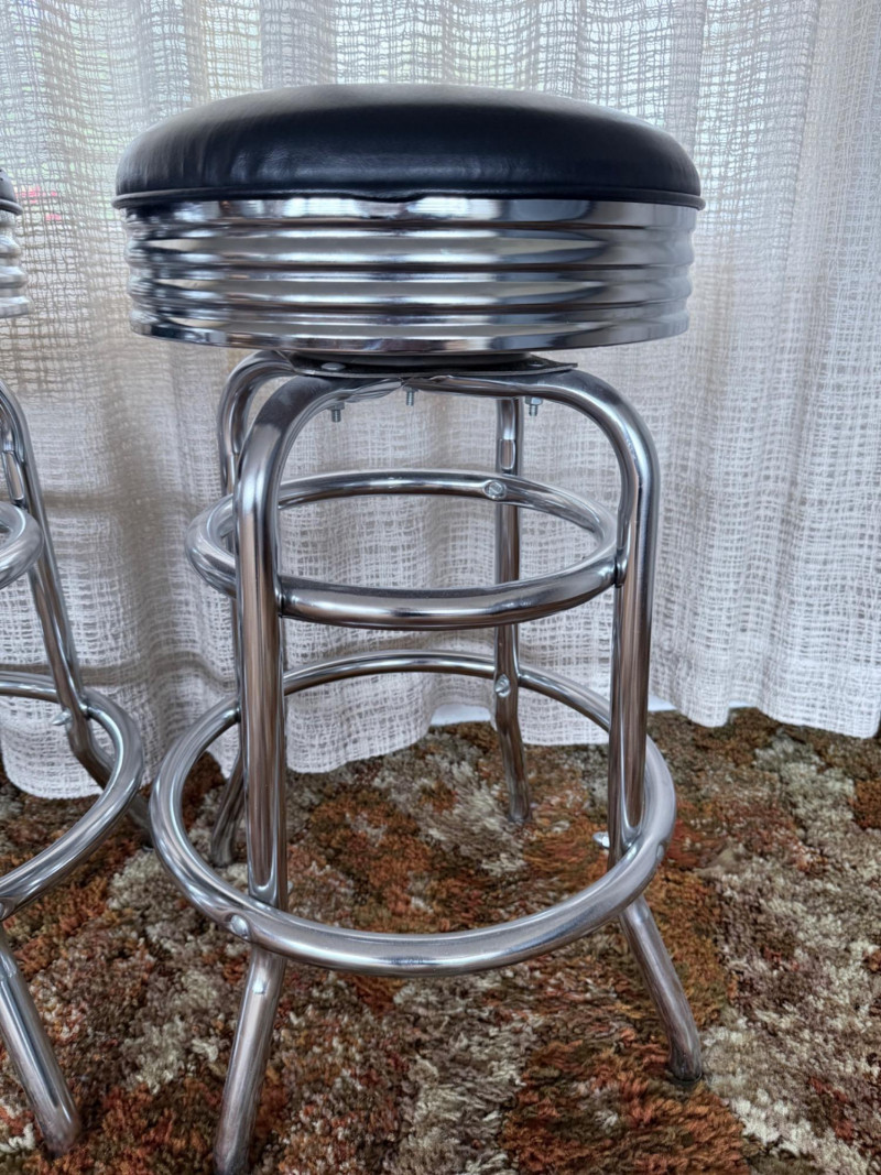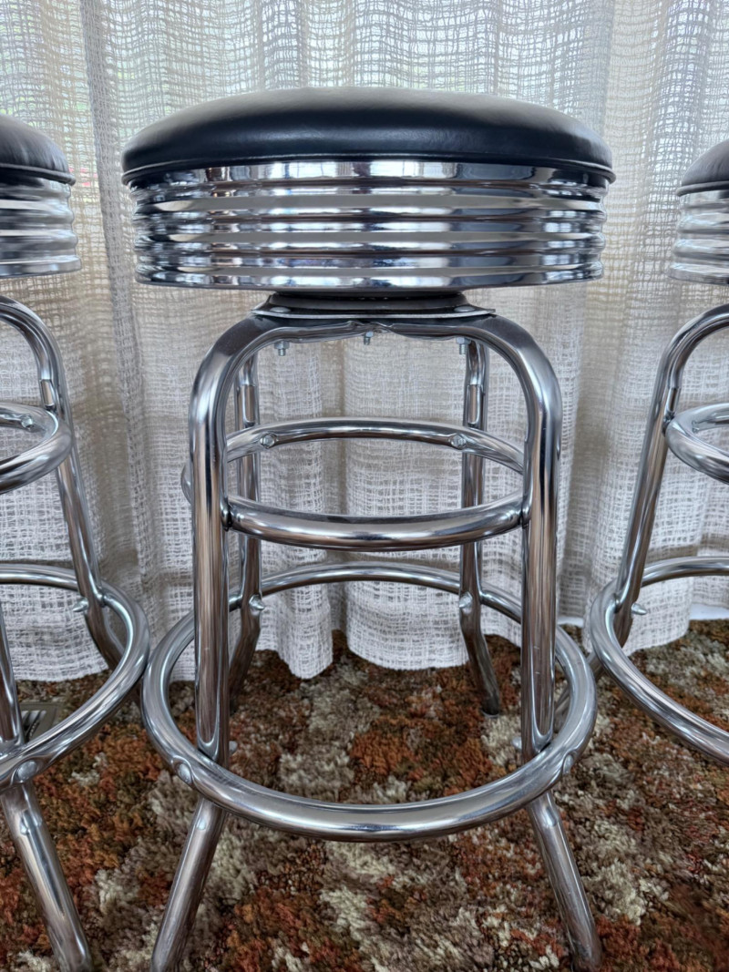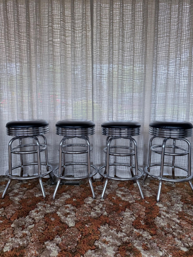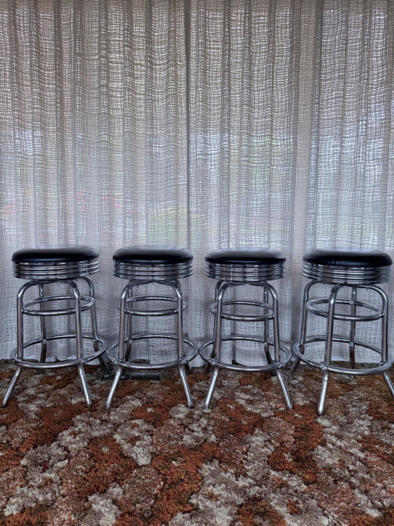 Set of four vintage-style barstools featuring polished chrome frames and black cushioned seats with ribbed chrome detailing around the sides. Each stool measures approximately 26.5" high by 16" wide. These stools are stationary and do not swivel. Solid and stylish, perfect for a retro kitchen or bar setup.