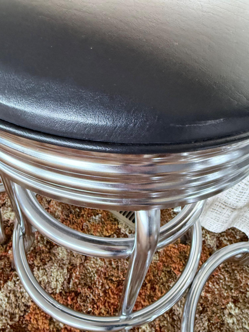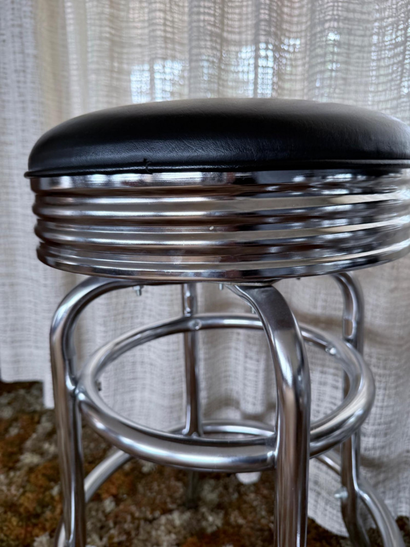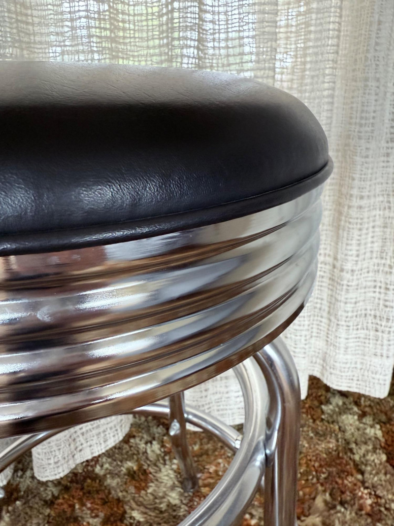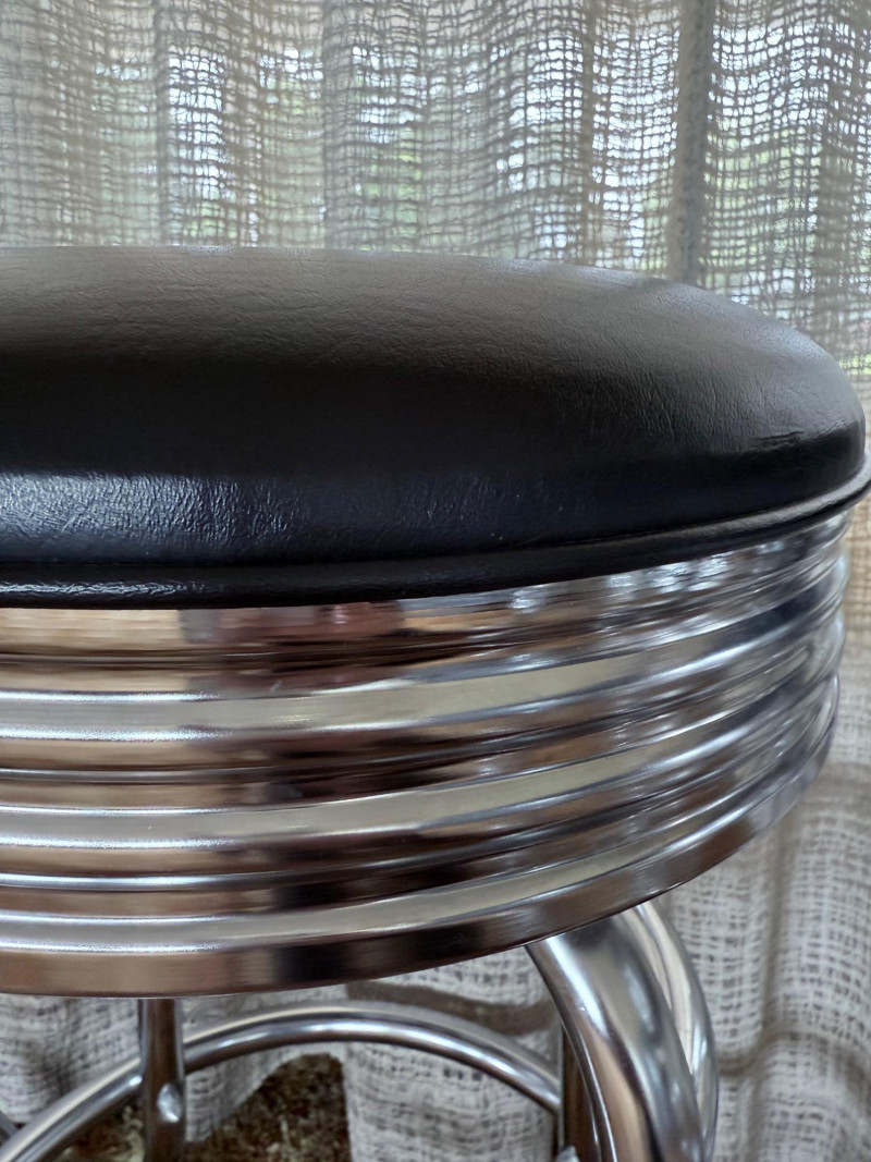 Set of four vintage-style barstools featuring polished chrome frames and black cushioned seats with ribbed chrome detailing around the sides. Each stool measures approximately 26.5" high by 16" wide. These stools are stationary and do not swivel. Solid and stylish, perfect for a retro kitchen or bar setup.