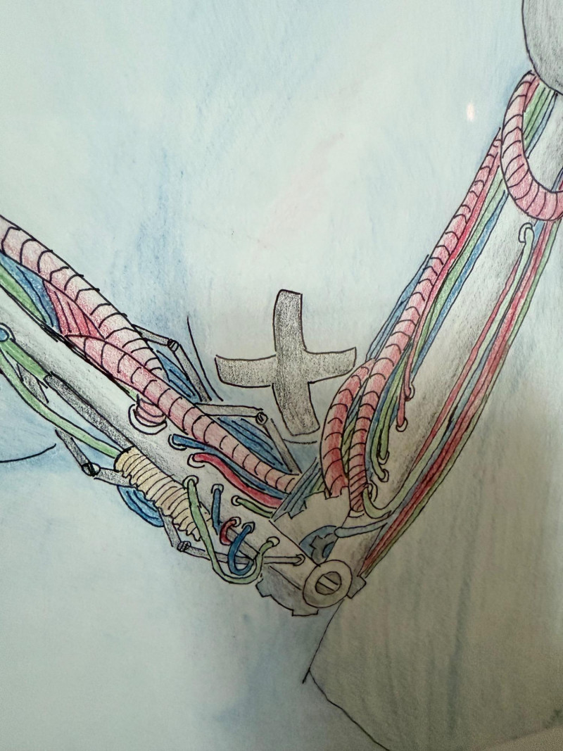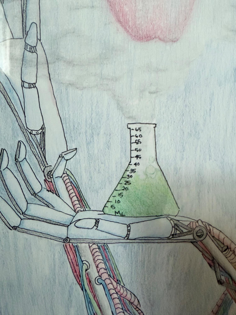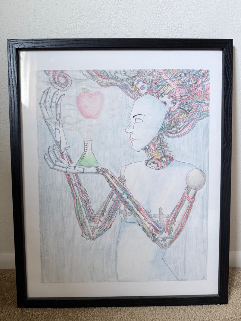 A captivating original pencil drawing by Amanda Franz, this 17" x 21" framed work intricately blends anatomical precision with imaginative surrealism. The piece features a stylized human profile interwoven with mechanical and organic elements—robotic hands, vibrant wiring, an apple, and scientific glassware—symbolizing the fusion of humanity, technology, and knowledge. Fine linework and subtle coloring bring depth and complexity to the composition. Signed by the artist and professionally framed.