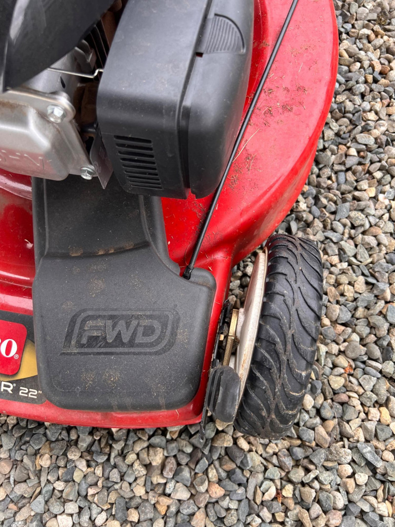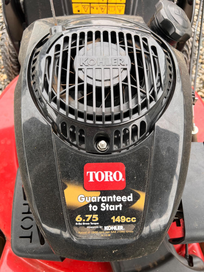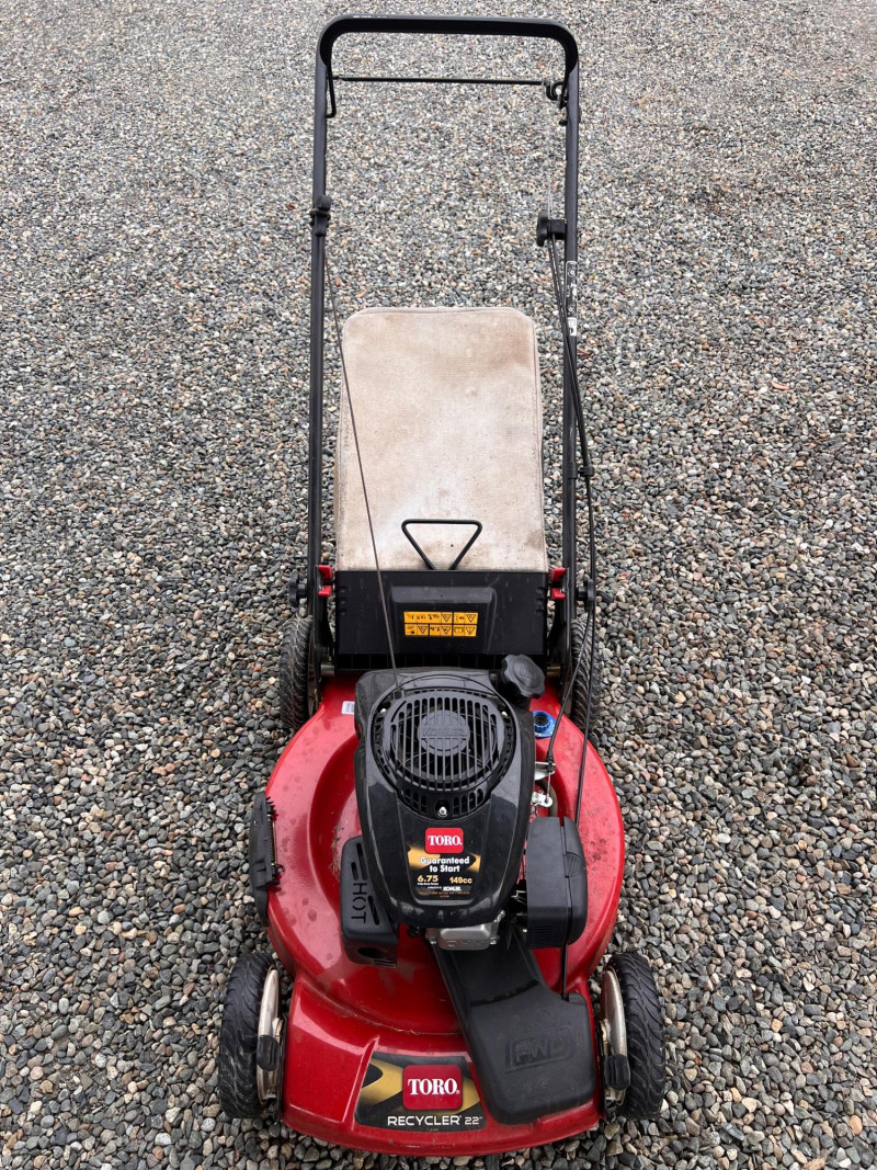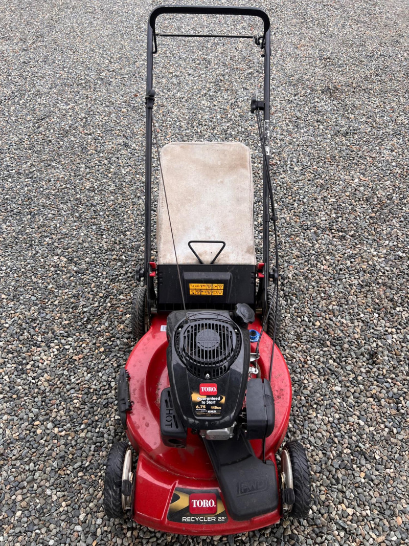 Toro Recycler 22" front-wheel drive gas lawn mower powered by a 6.75 ft-lb gross torque Kohler engine (149cc). Features include a fabric grass bag, adjustable cutting height, Quick-Wash port for easy cleaning, and a FWD system for enhanced maneuverability. Previously used; signs of wear and grass residue visible, but overall in working condition.