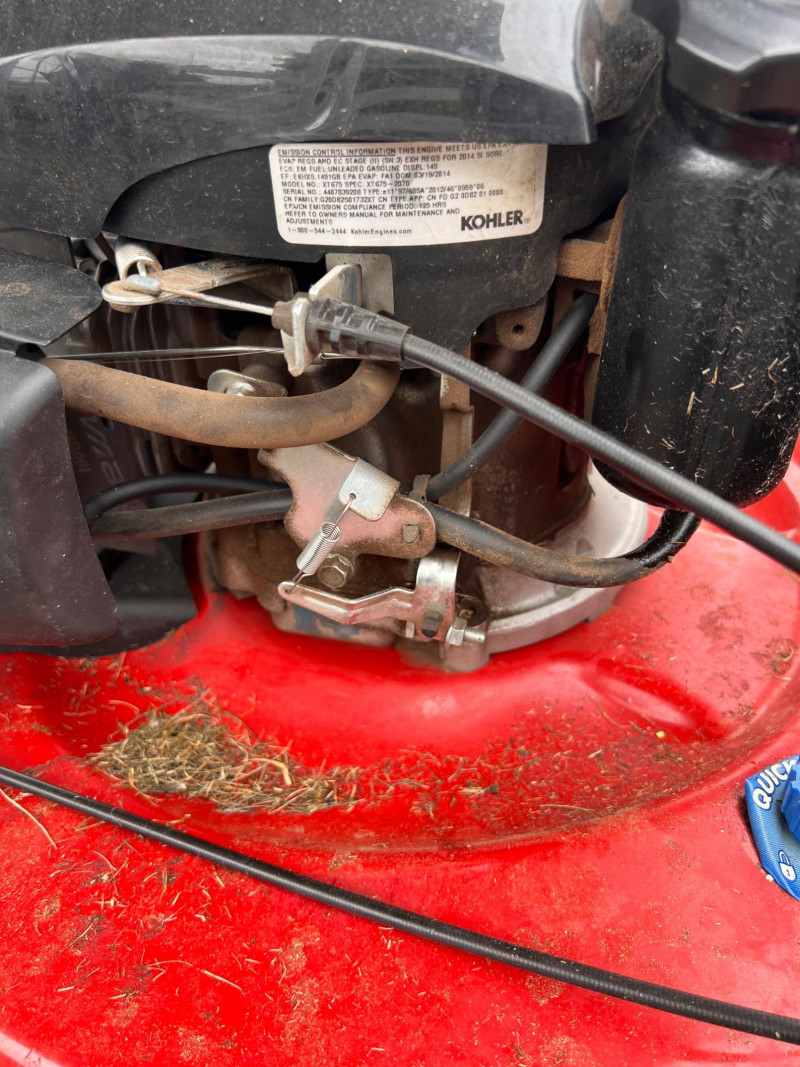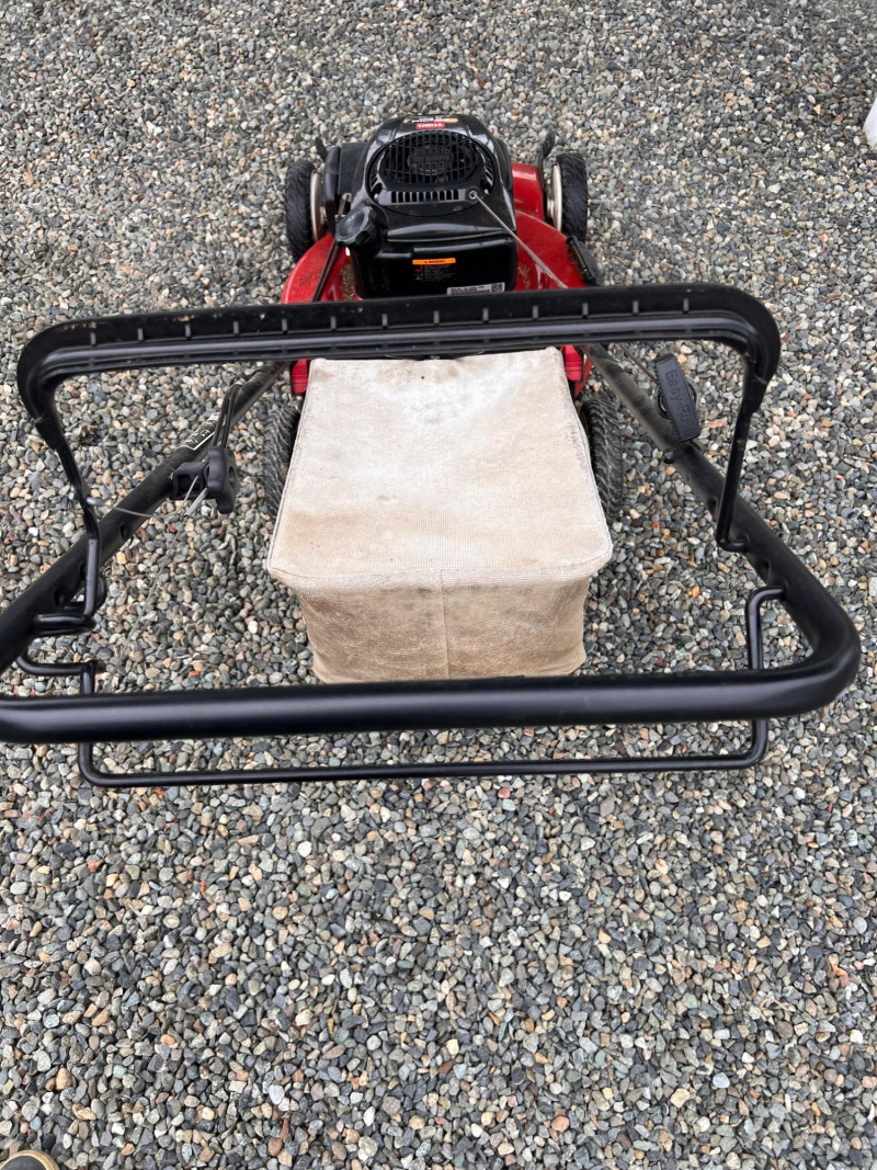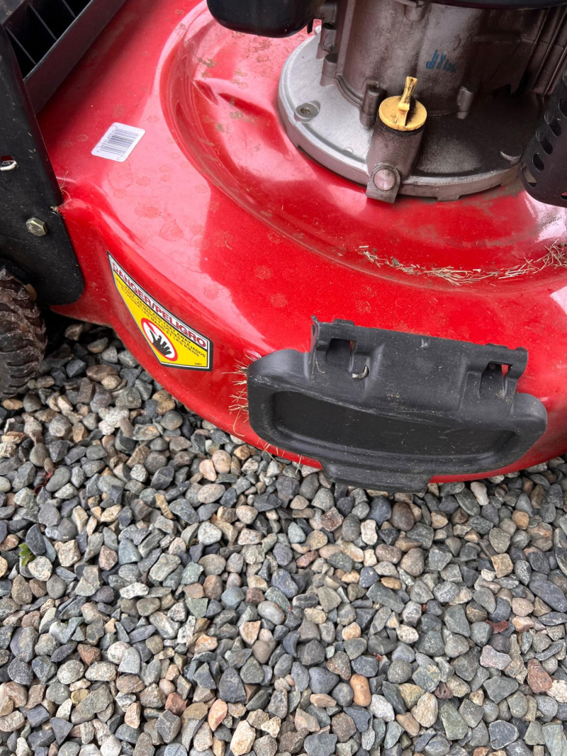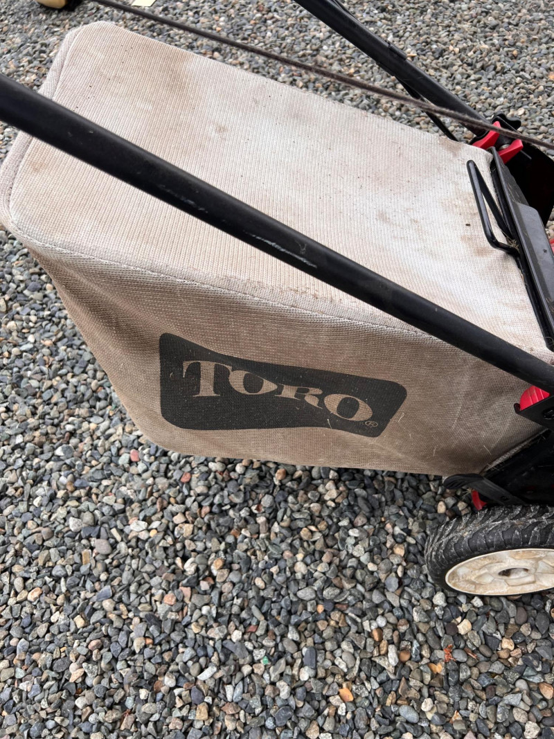 Toro Recycler 22" front-wheel drive gas lawn mower powered by a 6.75 ft-lb gross torque Kohler engine (149cc). Features include a fabric grass bag, adjustable cutting height, Quick-Wash port for easy cleaning, and a FWD system for enhanced maneuverability. Previously used; signs of wear and grass residue visible, but overall in working condition.
