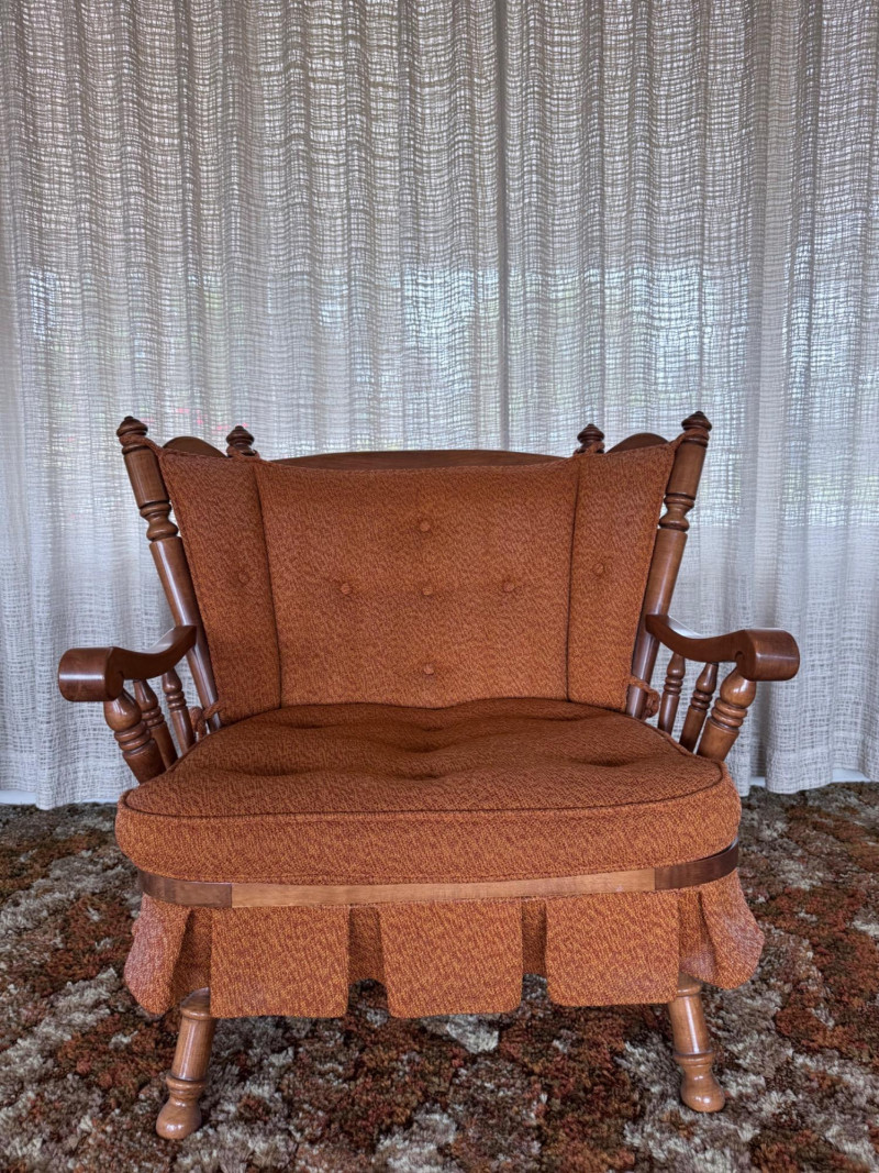 Vintage 1940s Upholstered Rocking Chair – Button-Tufted with Wood Spindles This charming 1940s-era rocking chair offers timeless comfort and classic American style, featuring a wide button-tufted seat and backrest in a retro burnt orange woven fabric. Crafted with solid wood arms and turned spindle supports, this piece is both functional and decorative. Details: Era: Circa 1940s Dimensions: Approx. 38" W x 23" D x 37" H Seat Height: 16" Features: Wide, cushioned seat with button tufting Wooden frame with turned spindles and curved armrests Decorative skirted fabric detail around base Smooth gliding/rocking motion Condition: vintage condition. Upholstery is intact with no major stains or tears. Wood shows minor surface wear consistent with age. A comfortable and stylish piece for a cozy reading nook, nursery, or vintage-inspired living space.