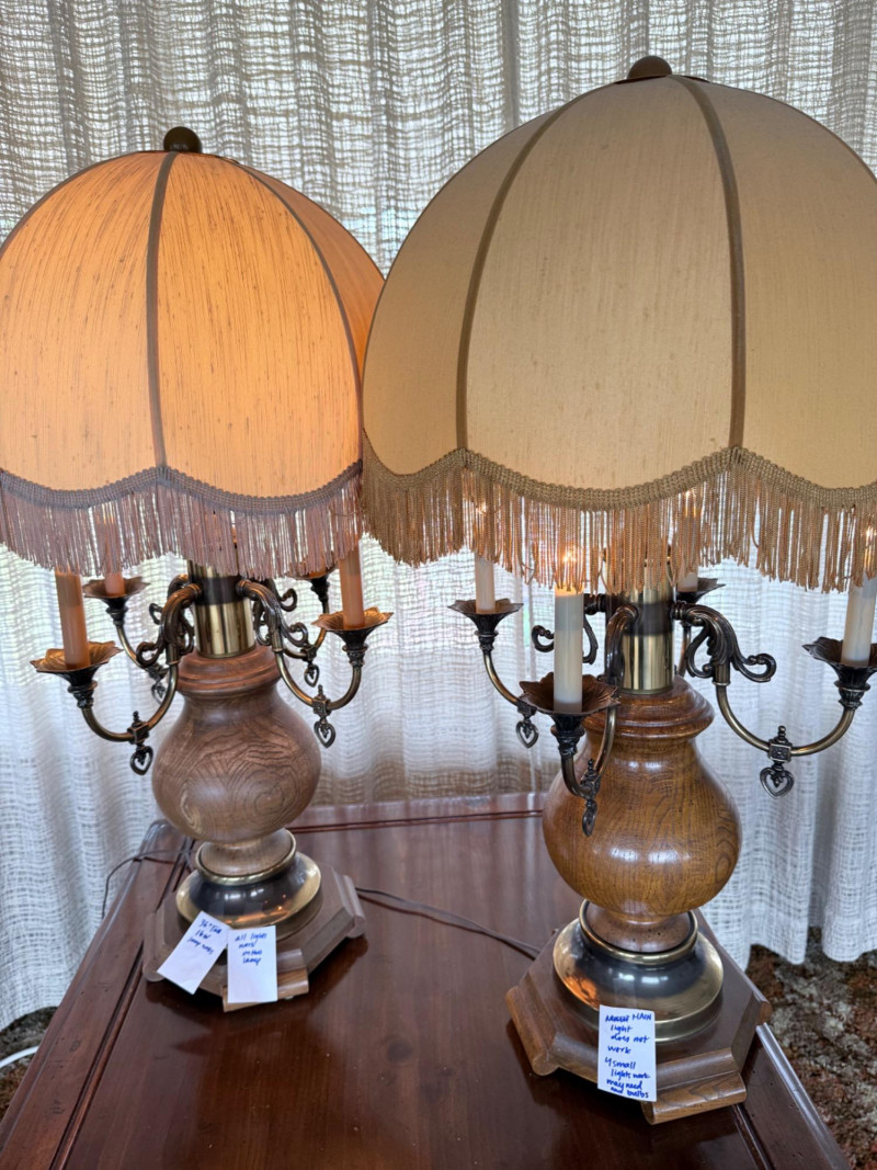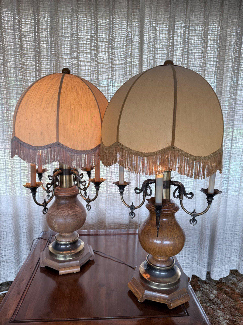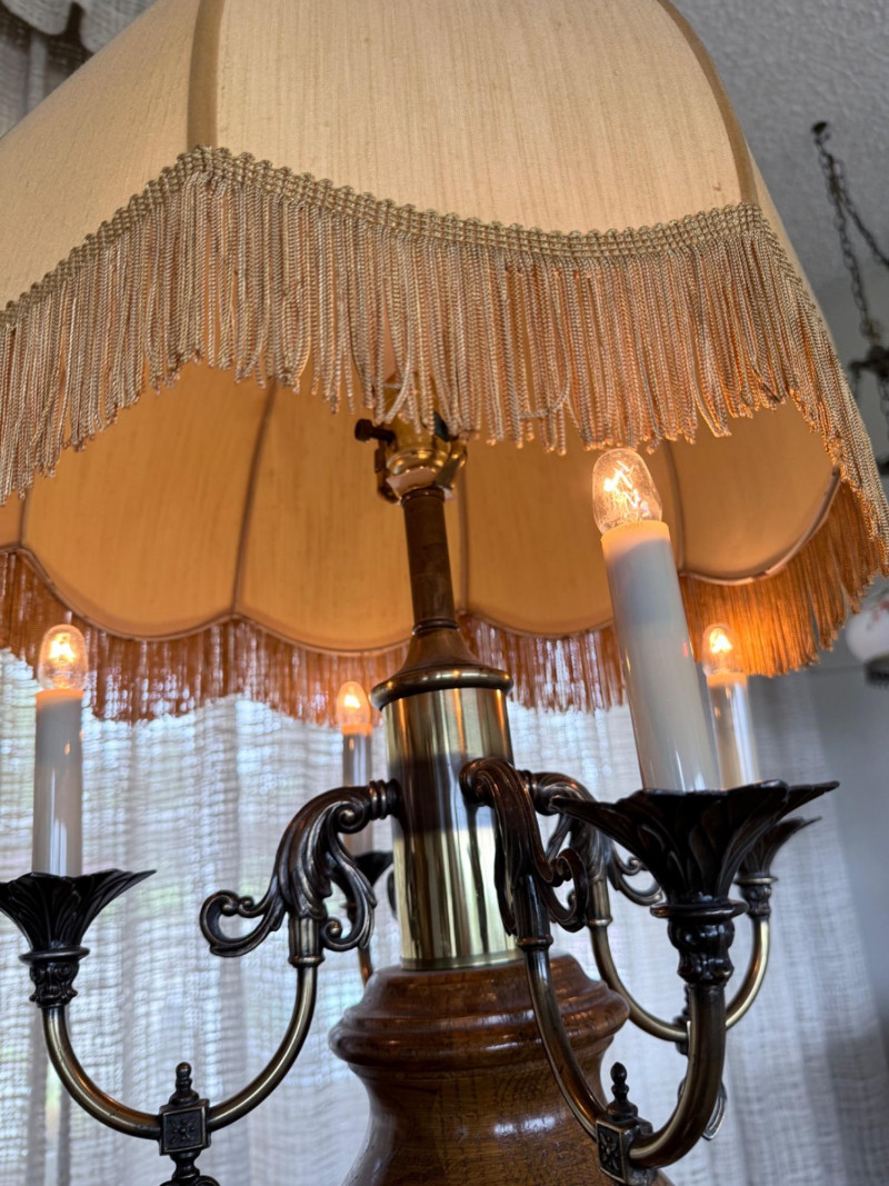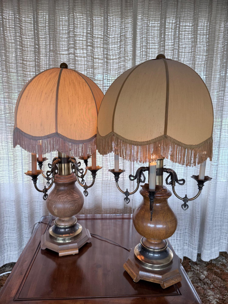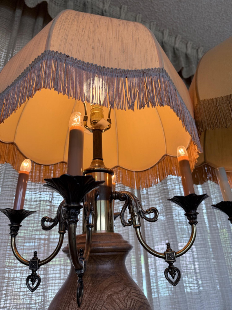 Charming pair of vintage table lamps featuring ornate wood and metal bases, scalloped fabric shades with fringe, and four candle-style accent bulbs per lamp. Each lamp measures approximately 36" tall and 16" wide. May require new bulbs. Note: The main light in one lamp does not work, but the four smaller bulbs do light up. The second lamp is fully functional.