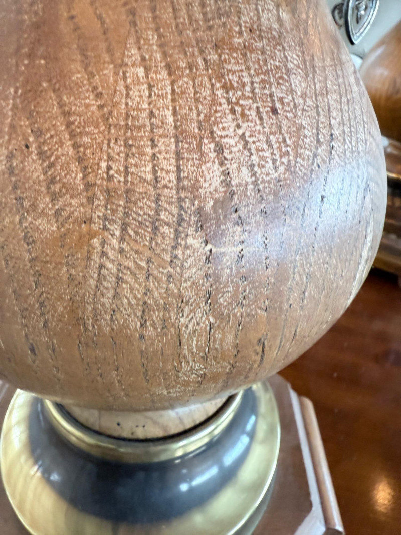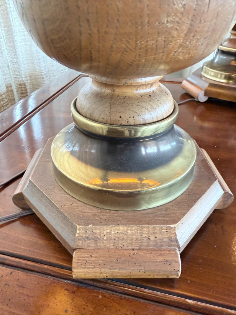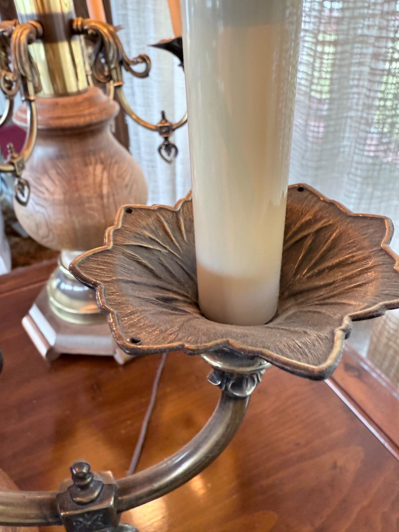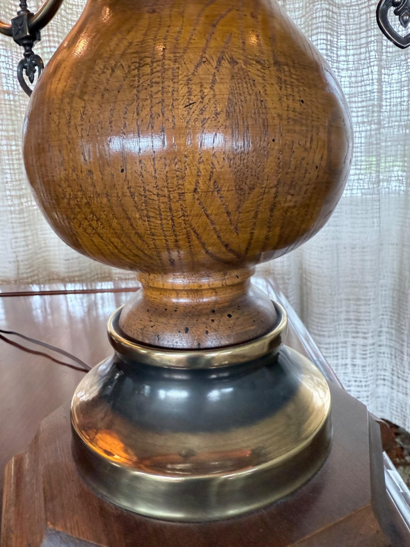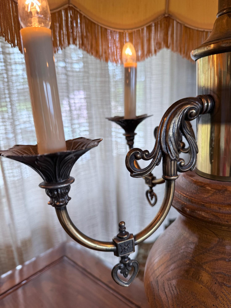 Charming pair of vintage table lamps featuring ornate wood and metal bases, scalloped fabric shades with fringe, and four candle-style accent bulbs per lamp. Each lamp measures approximately 36" tall and 16" wide. May require new bulbs. Note: The main light in one lamp does not work, but the four smaller bulbs do light up. The second lamp is fully functional.