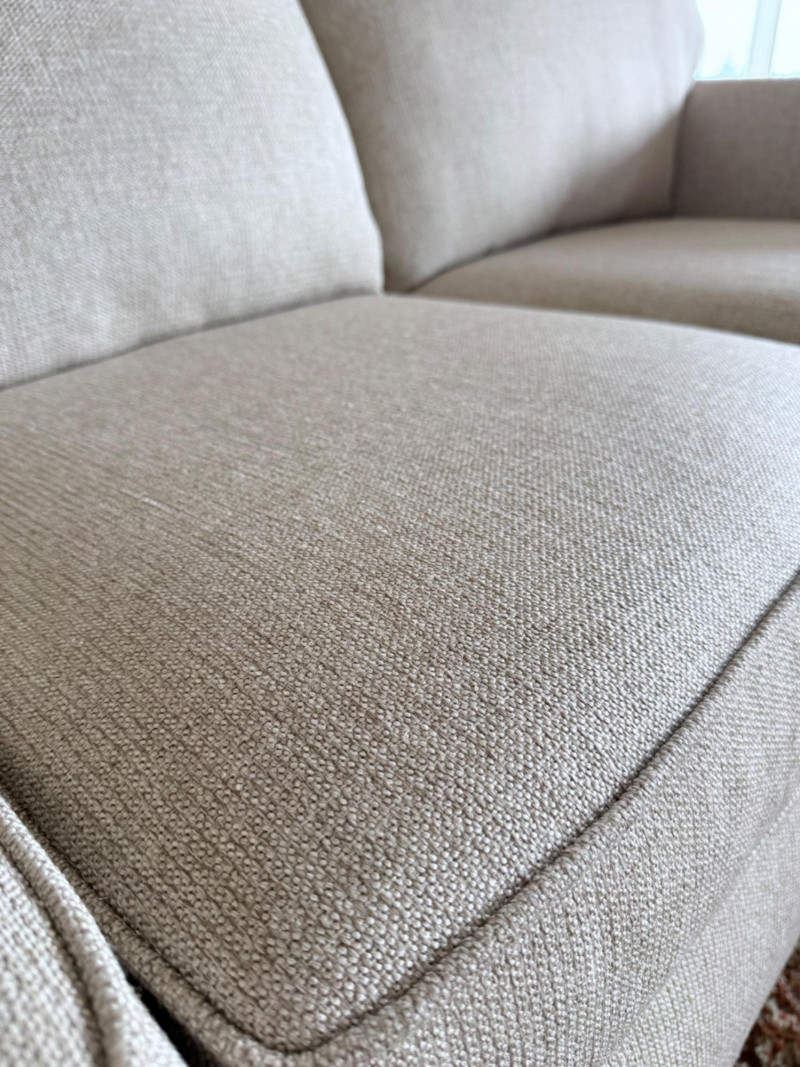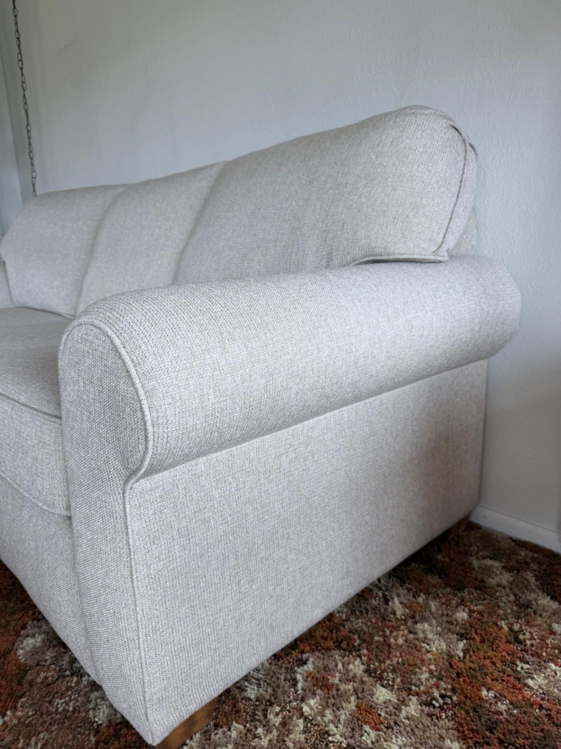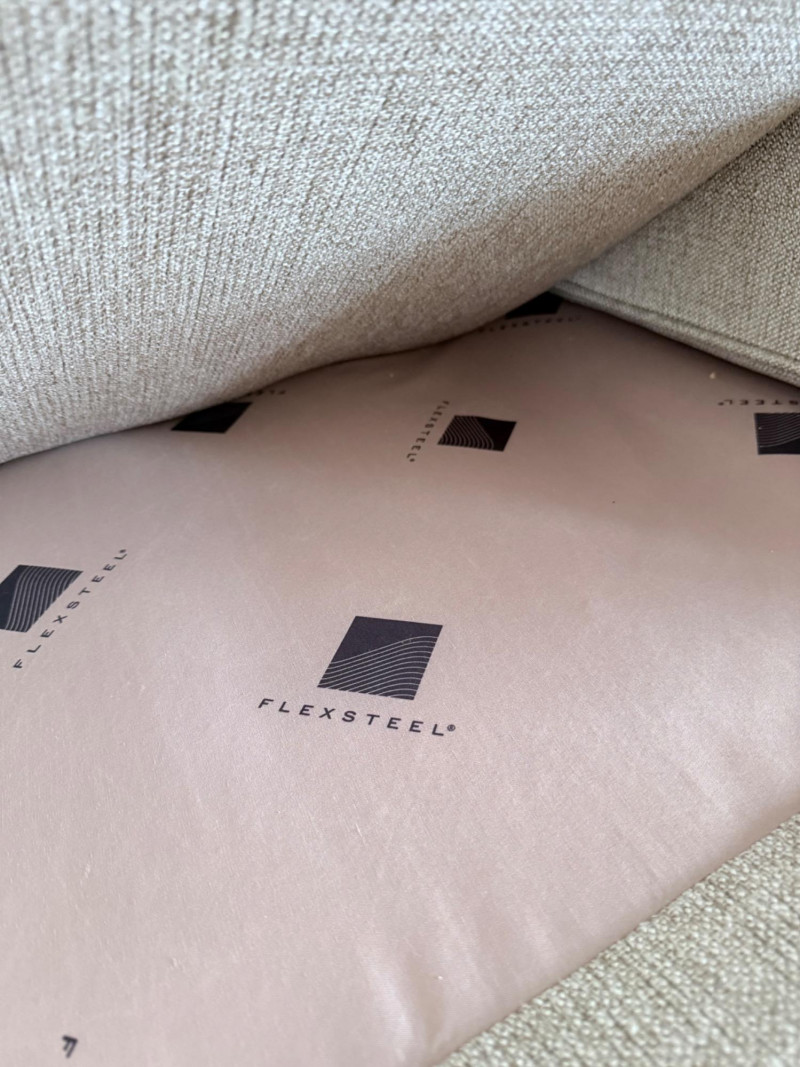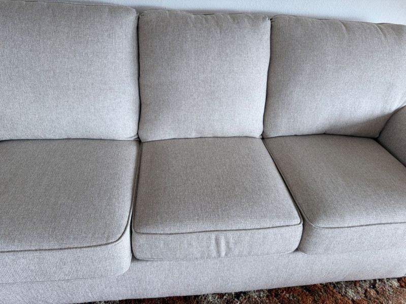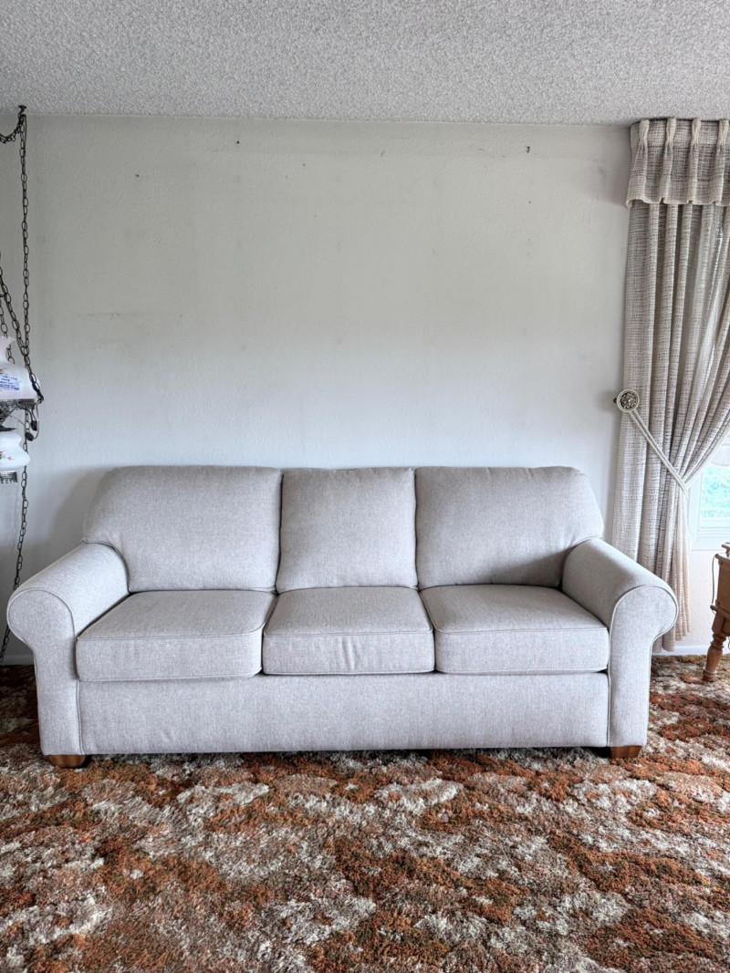 This Flexsteel sofa features a clean, classic design in a neutral beige upholstery. This sofa has been covered up and barely used. It measures 77" wide x 34" deep x 37" tall, with a seat height of 20". The back cushions are attached, while the seat cushions are removable with zippered covers for easy maintenance.