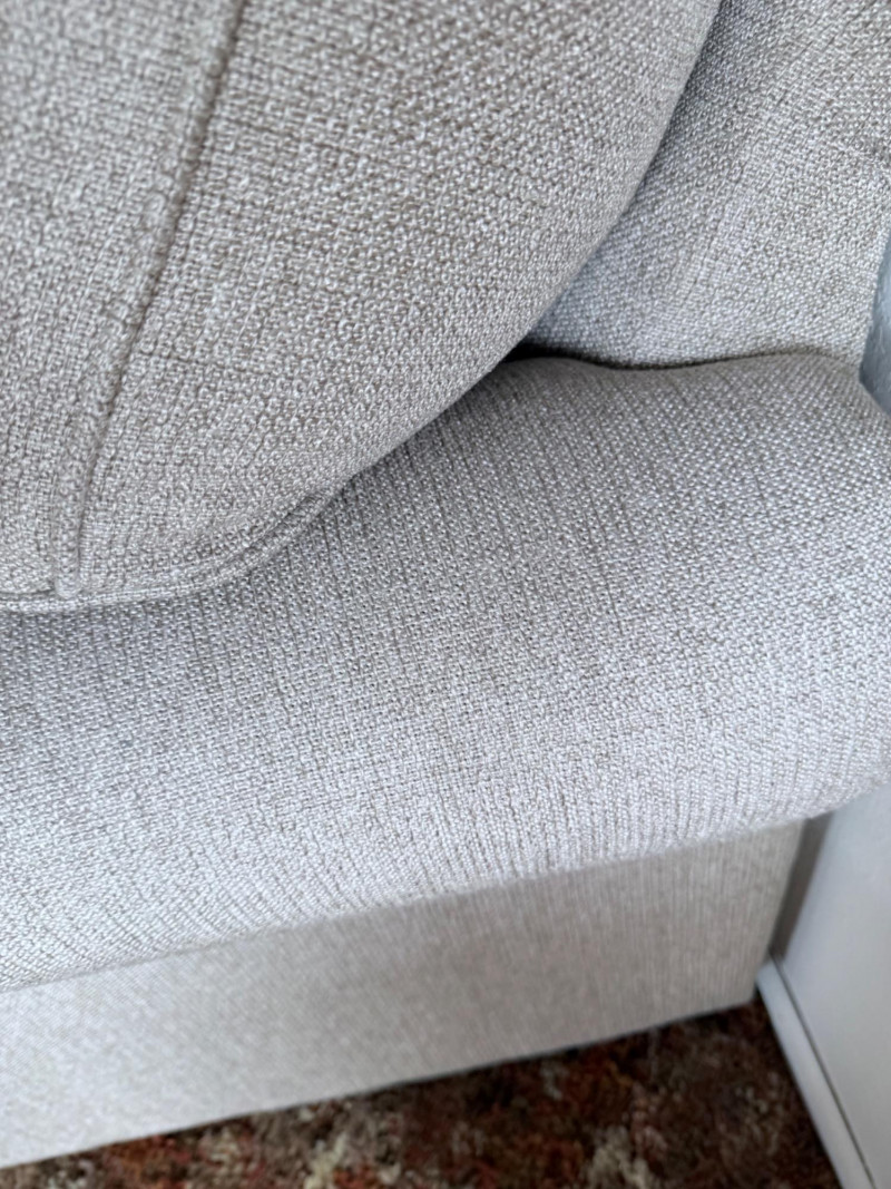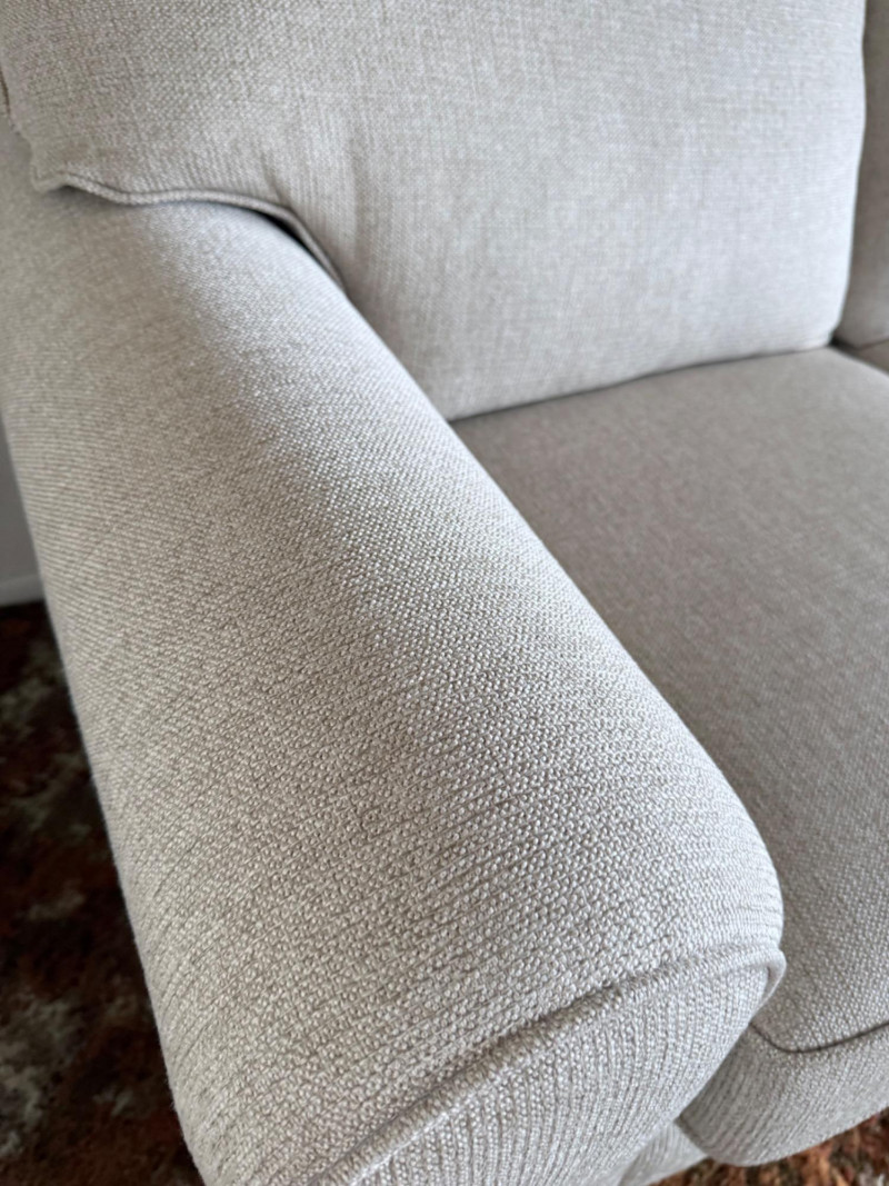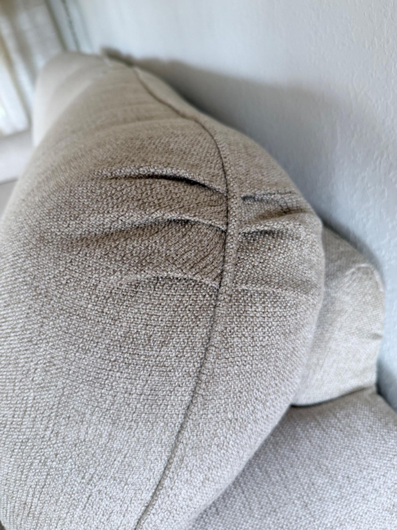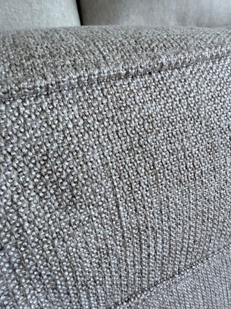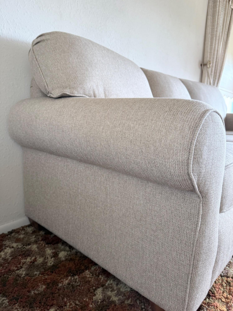 This Flexsteel sofa features a clean, classic design in a neutral beige upholstery. This sofa has been covered up and barely used. It measures 77" wide x 34" deep x 37" tall, with a seat height of 20". The back cushions are attached, while the seat cushions are removable with zippered covers for easy maintenance.