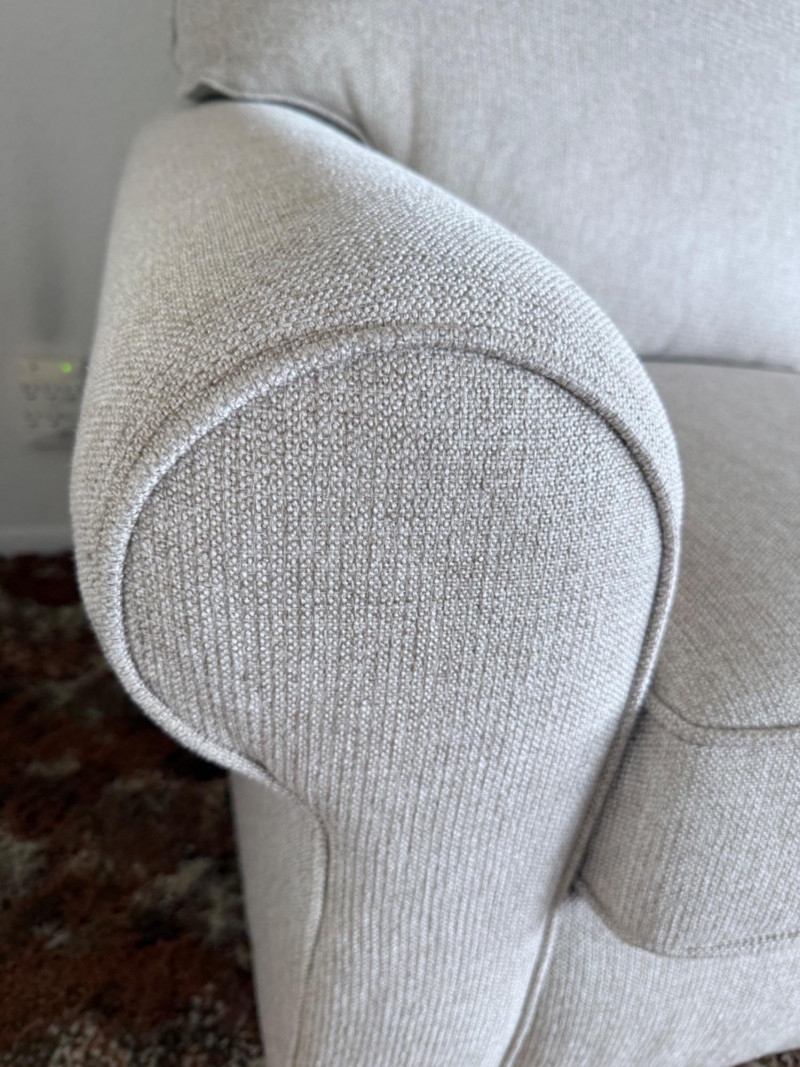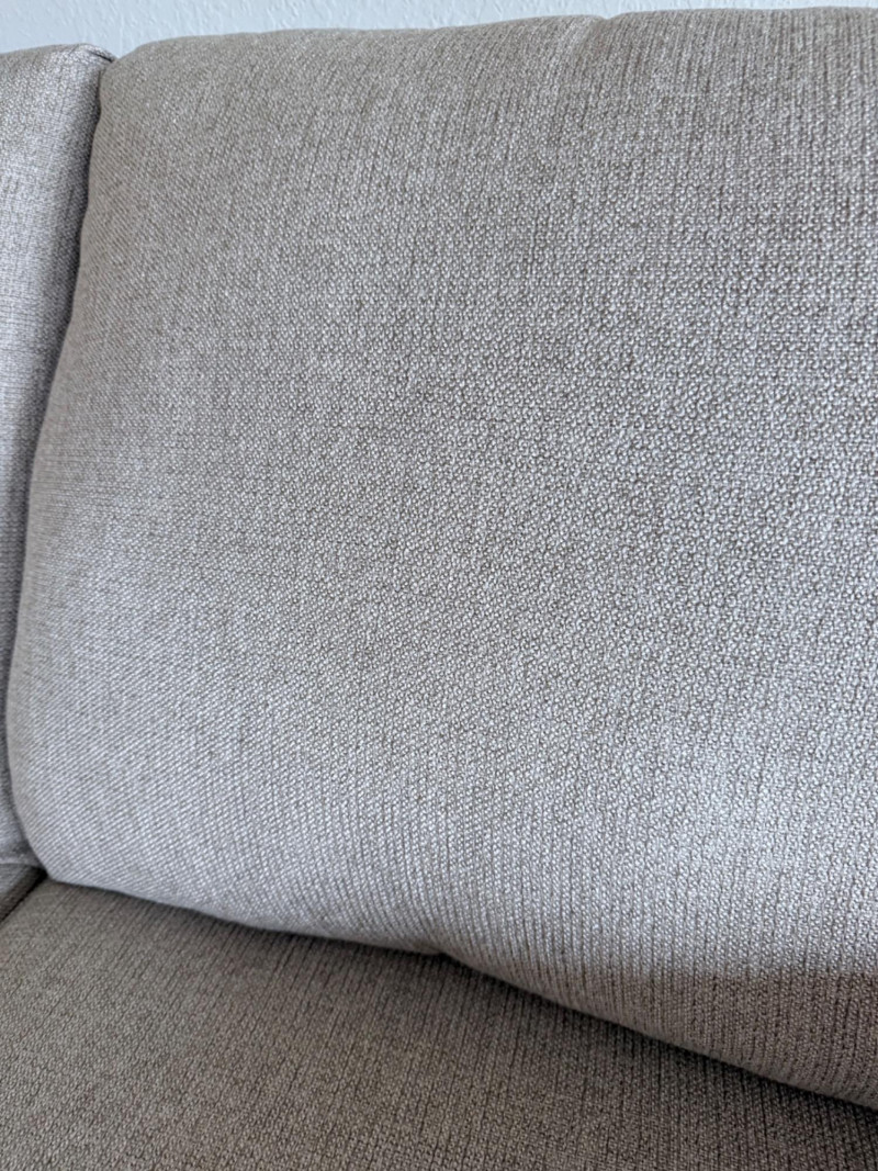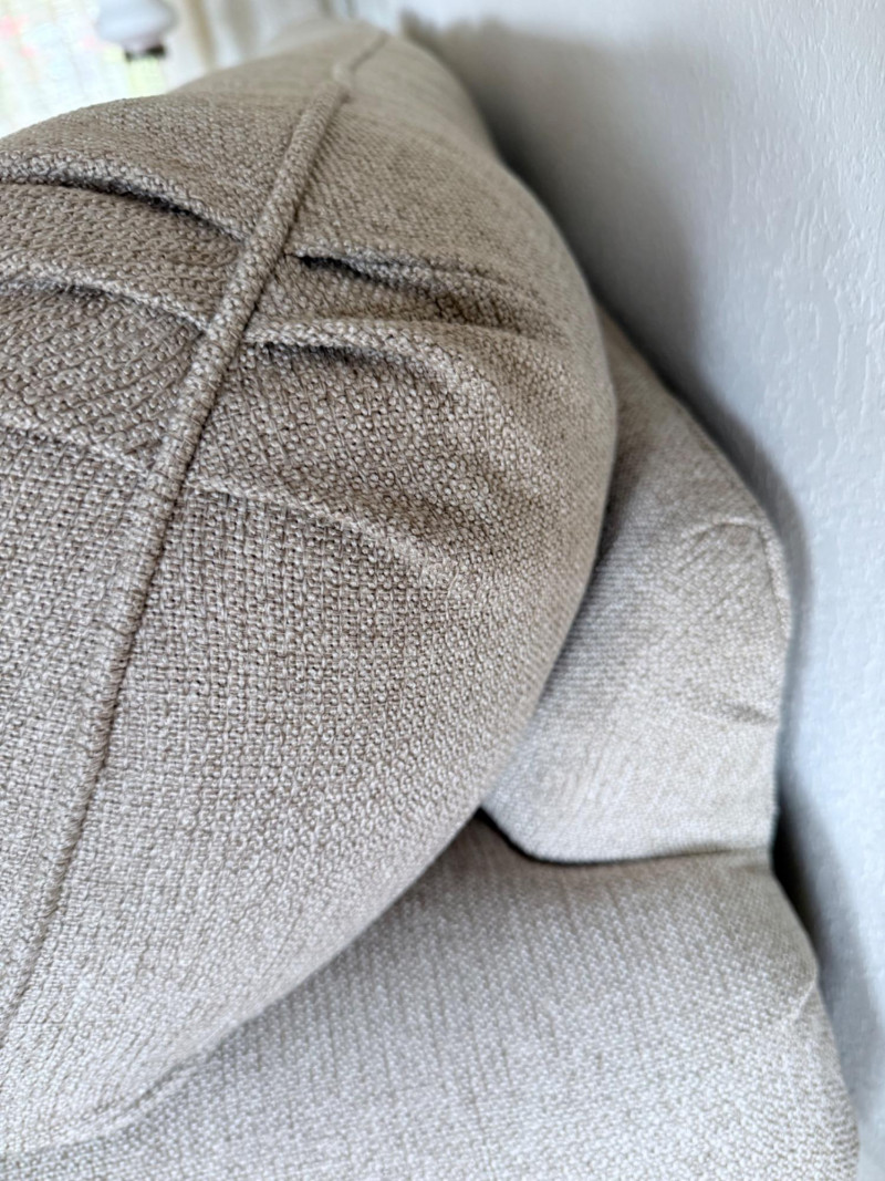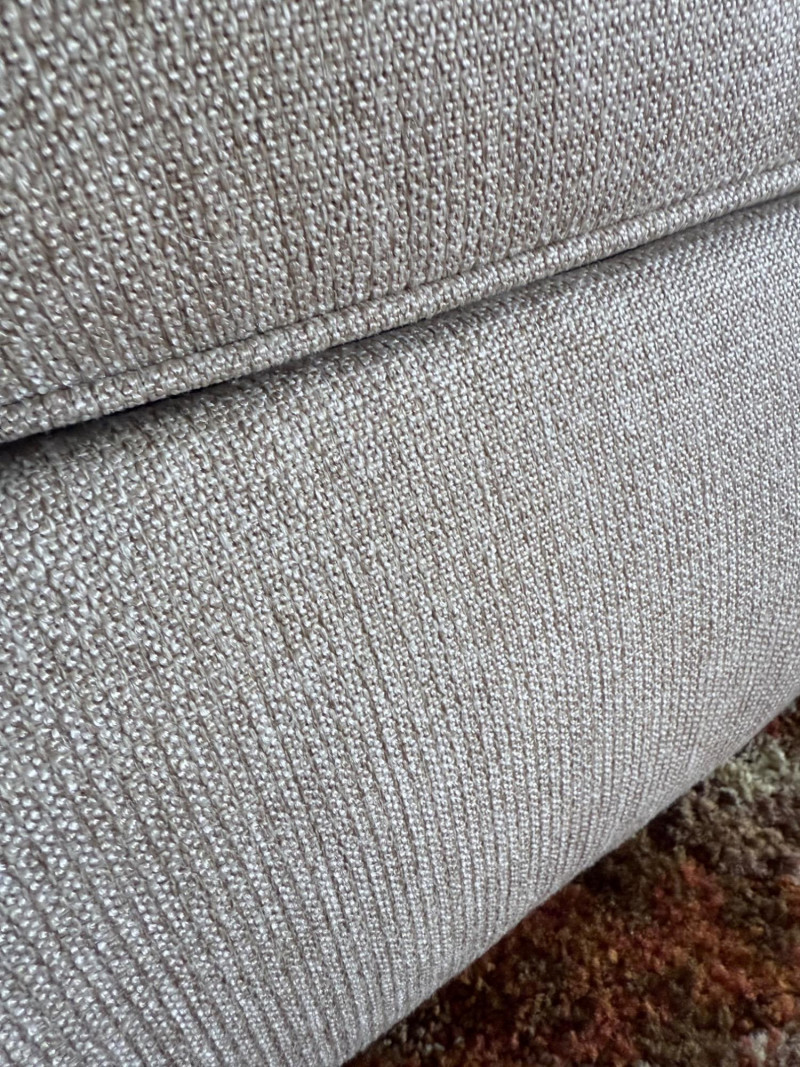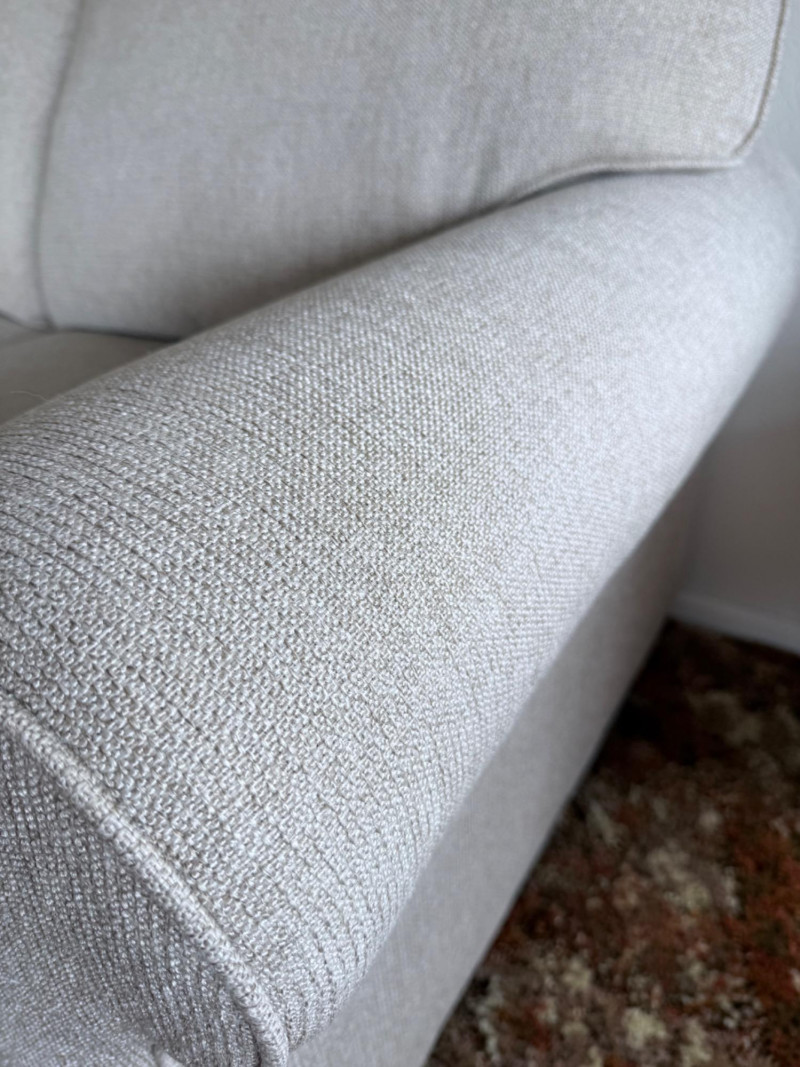 This Flexsteel sofa features a clean, classic design in a neutral beige upholstery. This sofa has been covered up and barely used. It measures 77" wide x 34" deep x 37" tall, with a seat height of 20". The back cushions are attached, while the seat cushions are removable with zippered covers for easy maintenance.