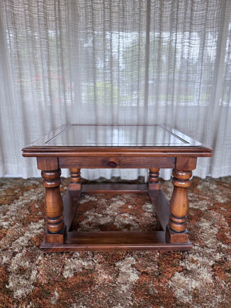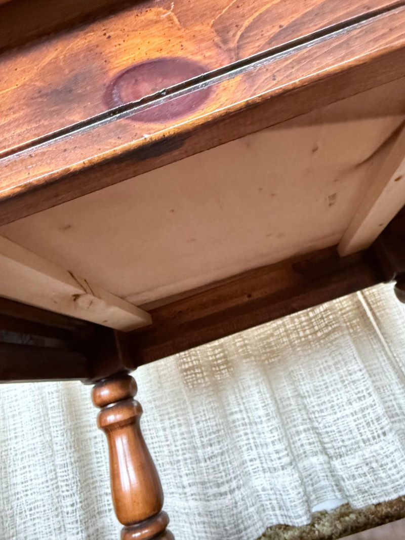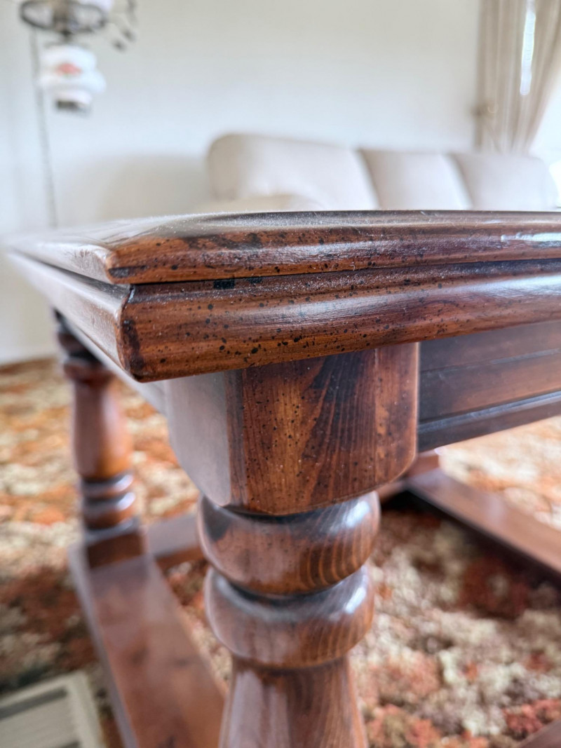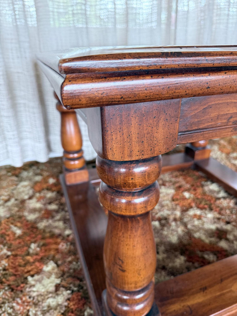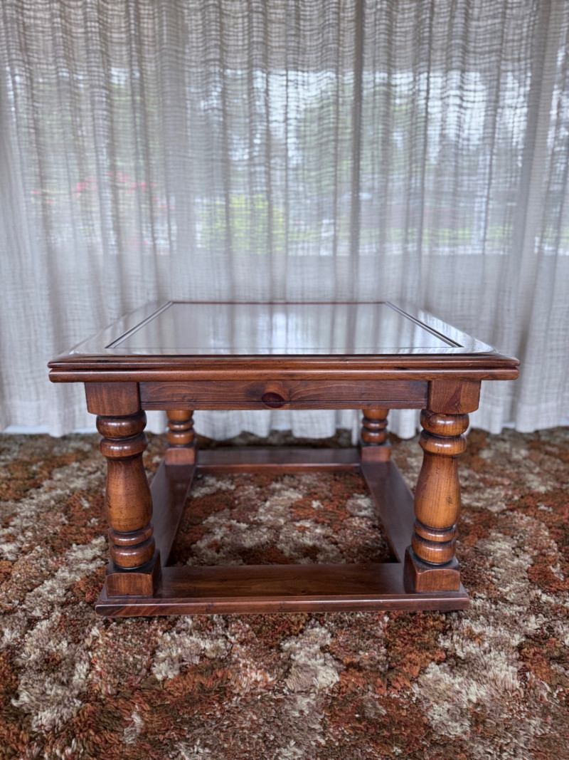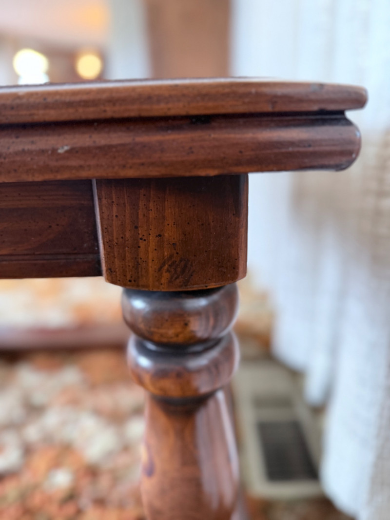 Crafted from solid wood, this square side table features a rich, warm finish and a sturdy frame supported by turned legs. The tabletop includes a framed design and shows some visible scratches and wear consistent with use. Base design provides added stability and a classic touch. Overall size: 30" W x 30" D x 20.5" H.