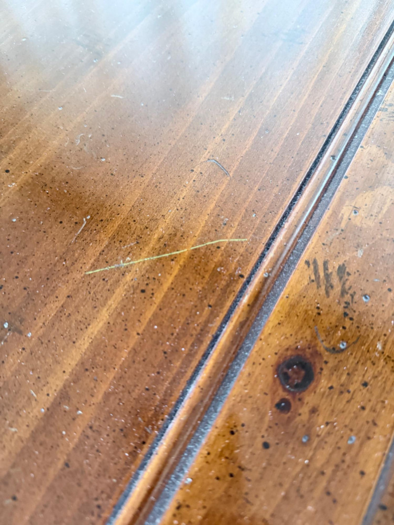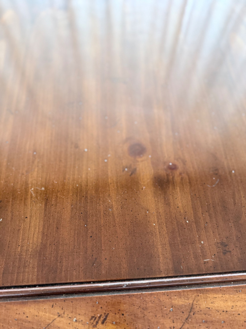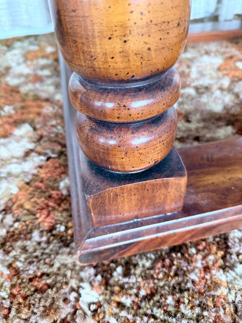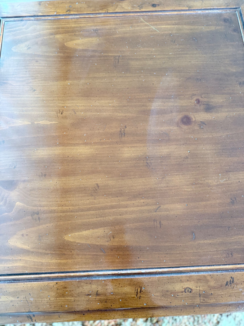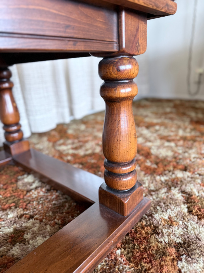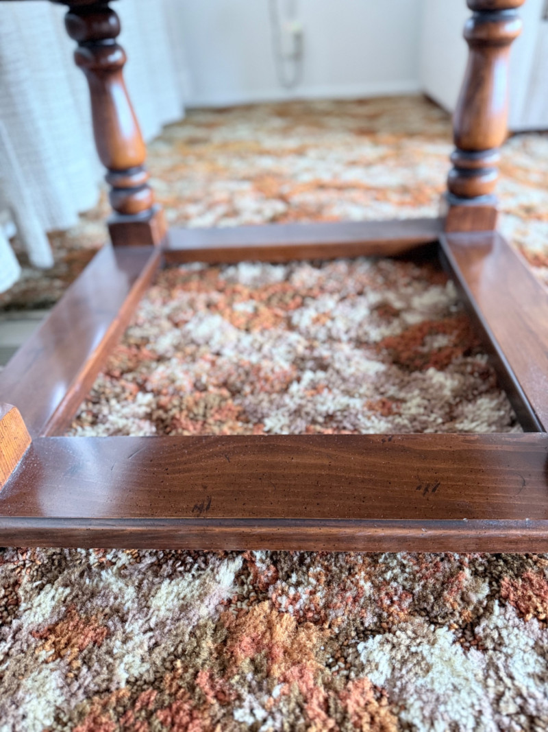 Crafted from solid wood, this square side table features a rich, warm finish and a sturdy frame supported by turned legs. The tabletop includes a framed design and shows some visible scratches and wear consistent with use. Base design provides added stability and a classic touch. Overall size: 30" W x 30" D x 20.5" H.