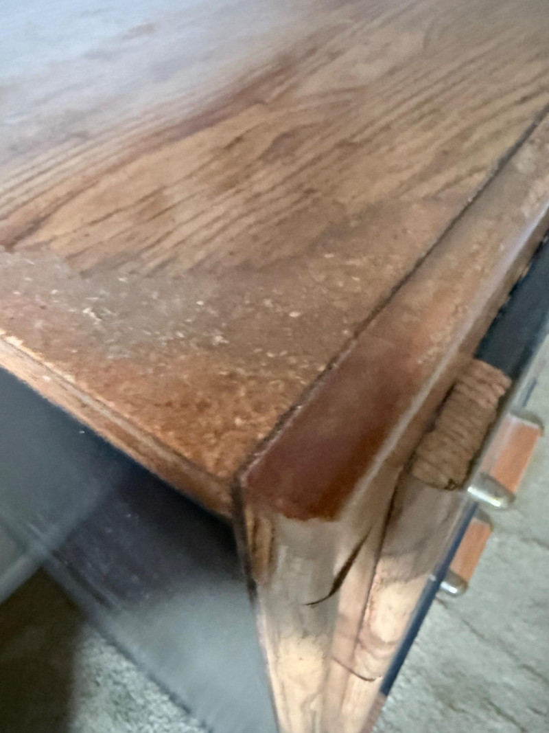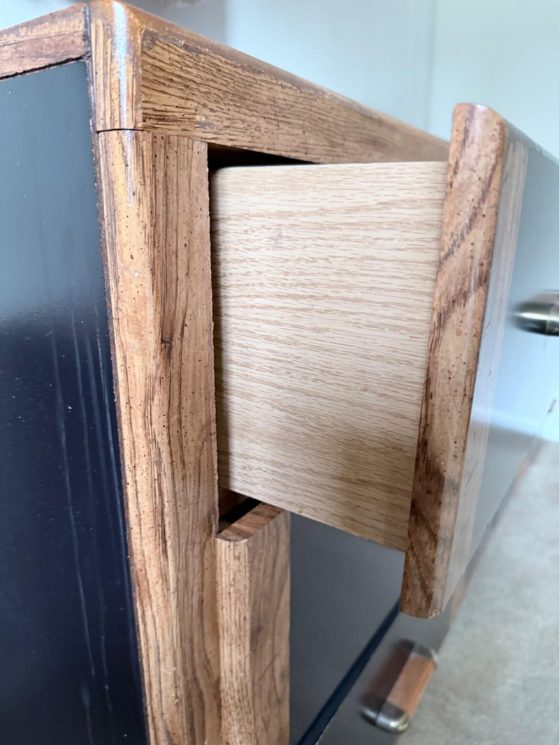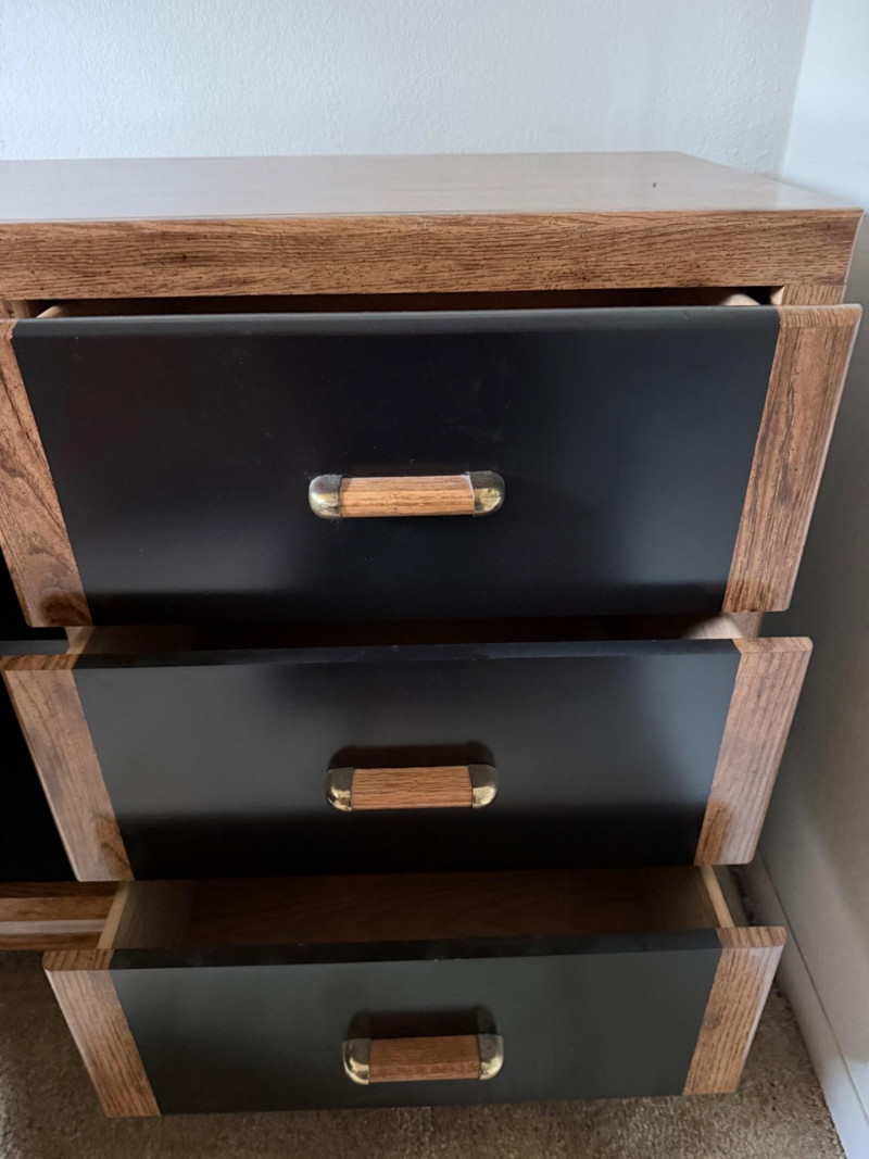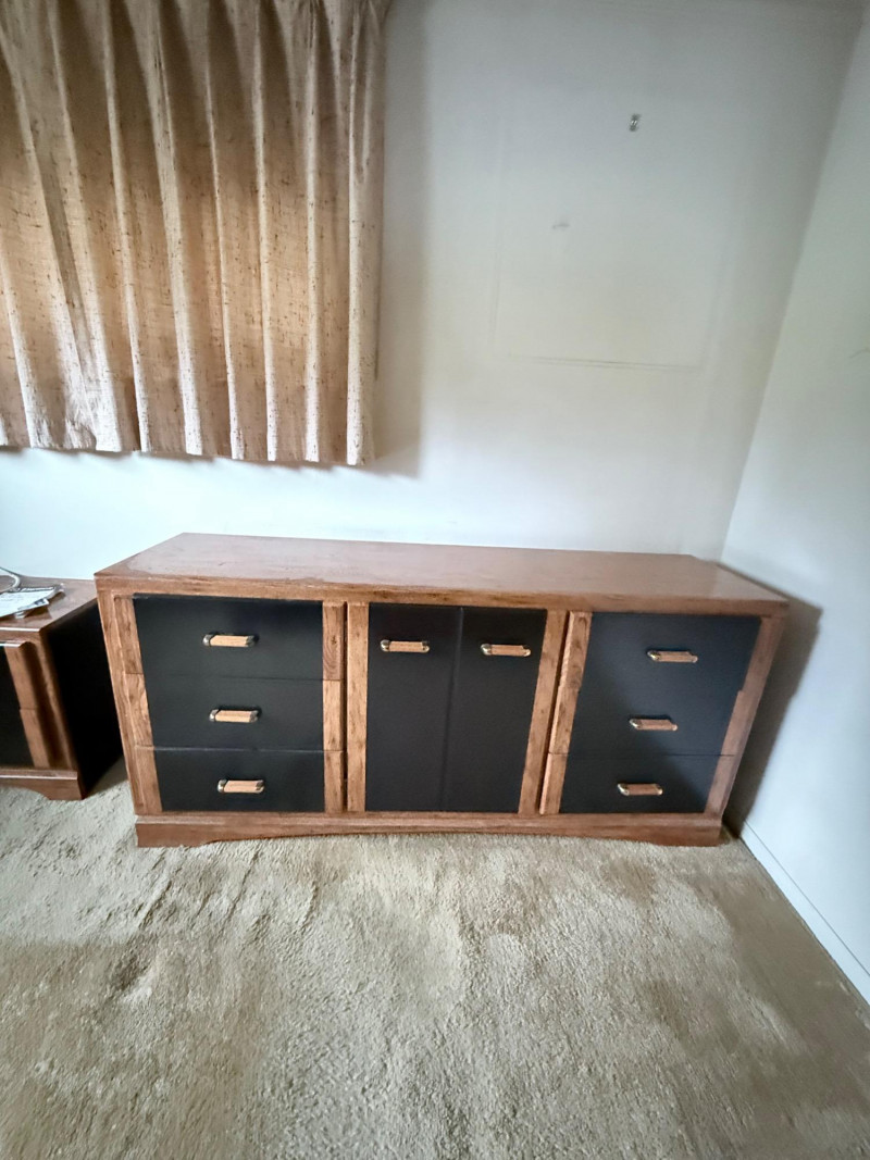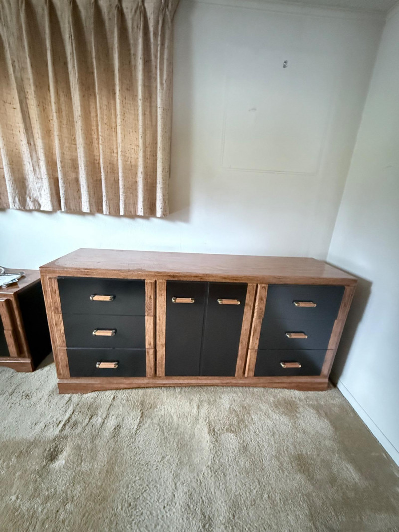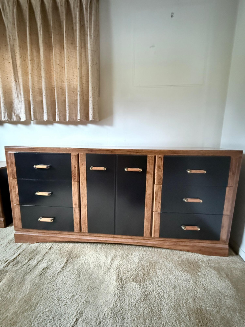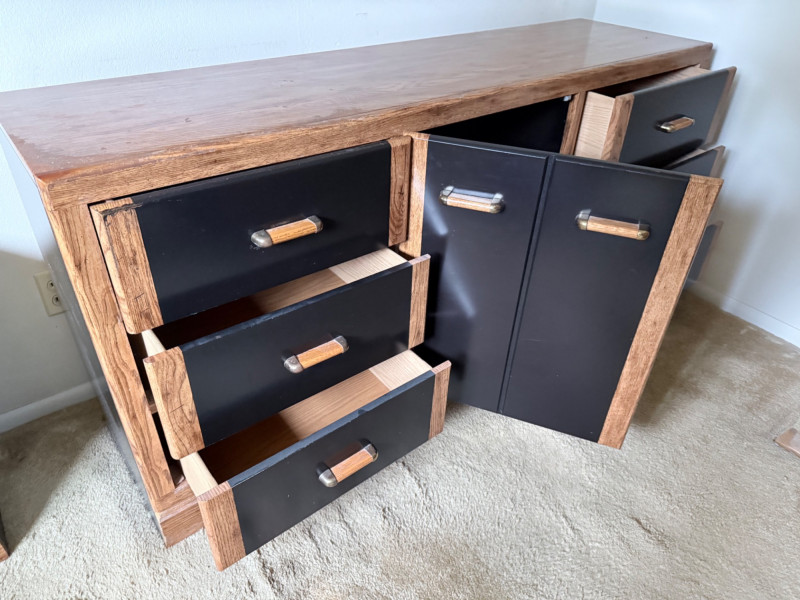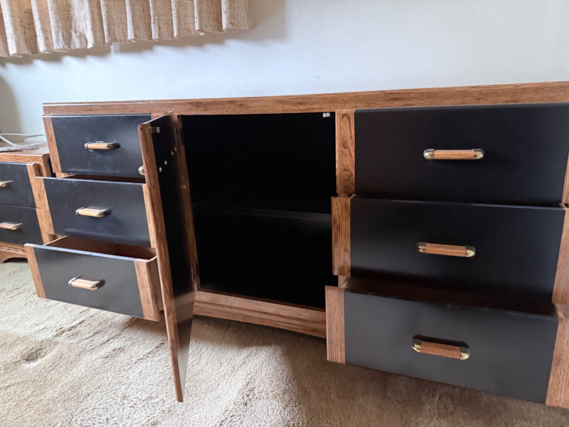 This large sideboard cabinet features a modern rustic design with a wood frame and matte black panel fronts. It includes three central drawers flanked by two double-door cabinets with interior shelves, offering versatile storage. Each drawer and door has matching wood-and-metal handles. .