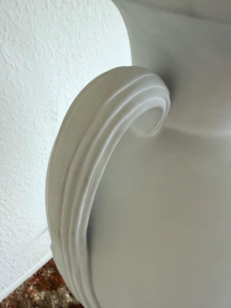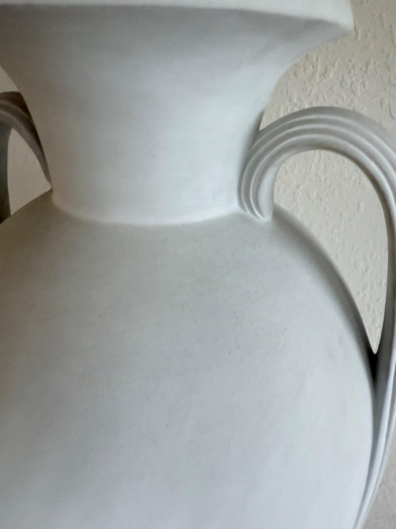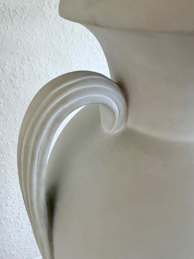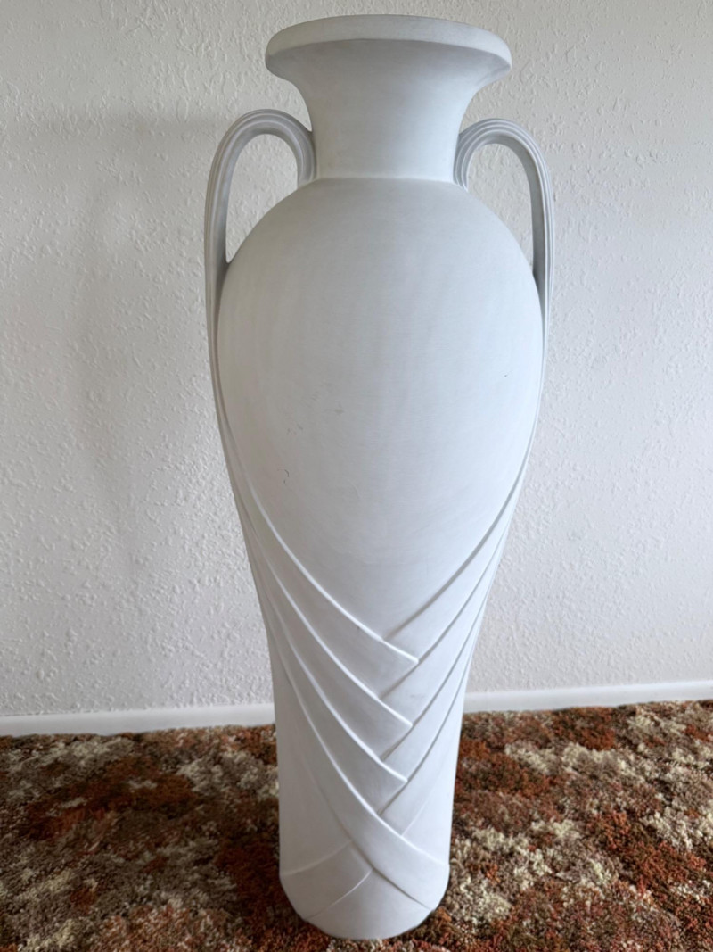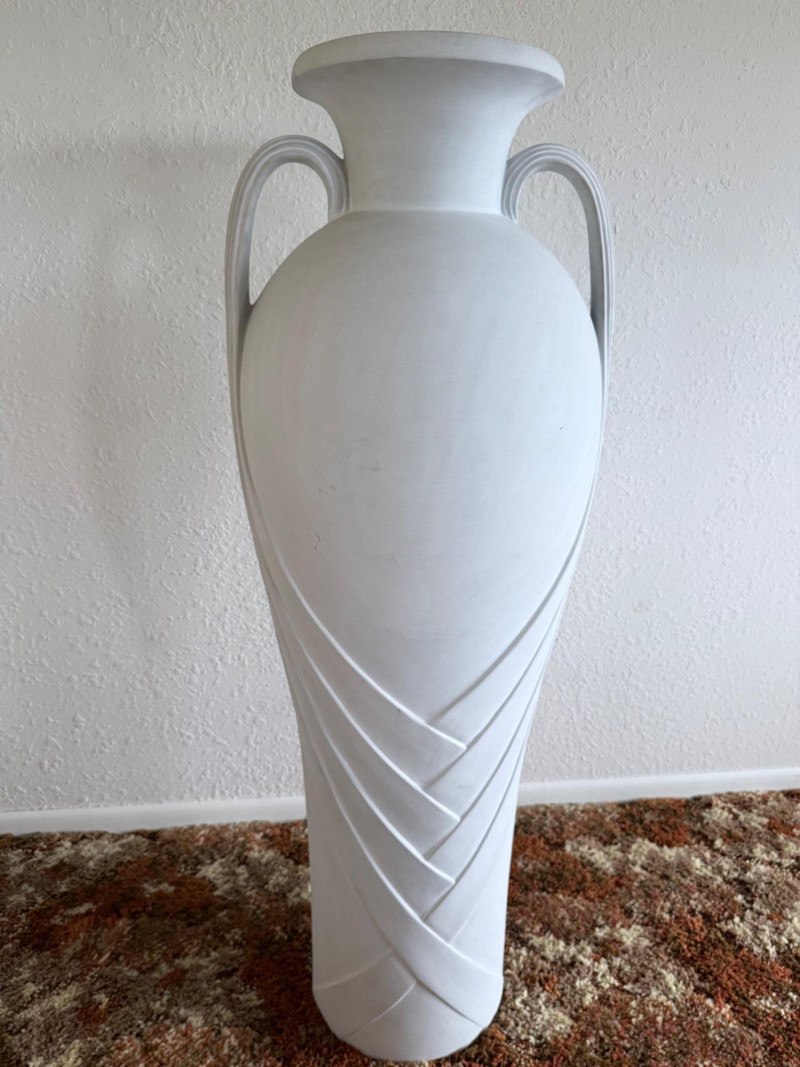 Elegant tall white ceramic vase featuring sculptural wrap-around detailing and dual curved handles. Marked "Made in Italy" on the base. Measures approximately 44" high with a 15" diameter. Matte finish with light surface marks consistent with age.