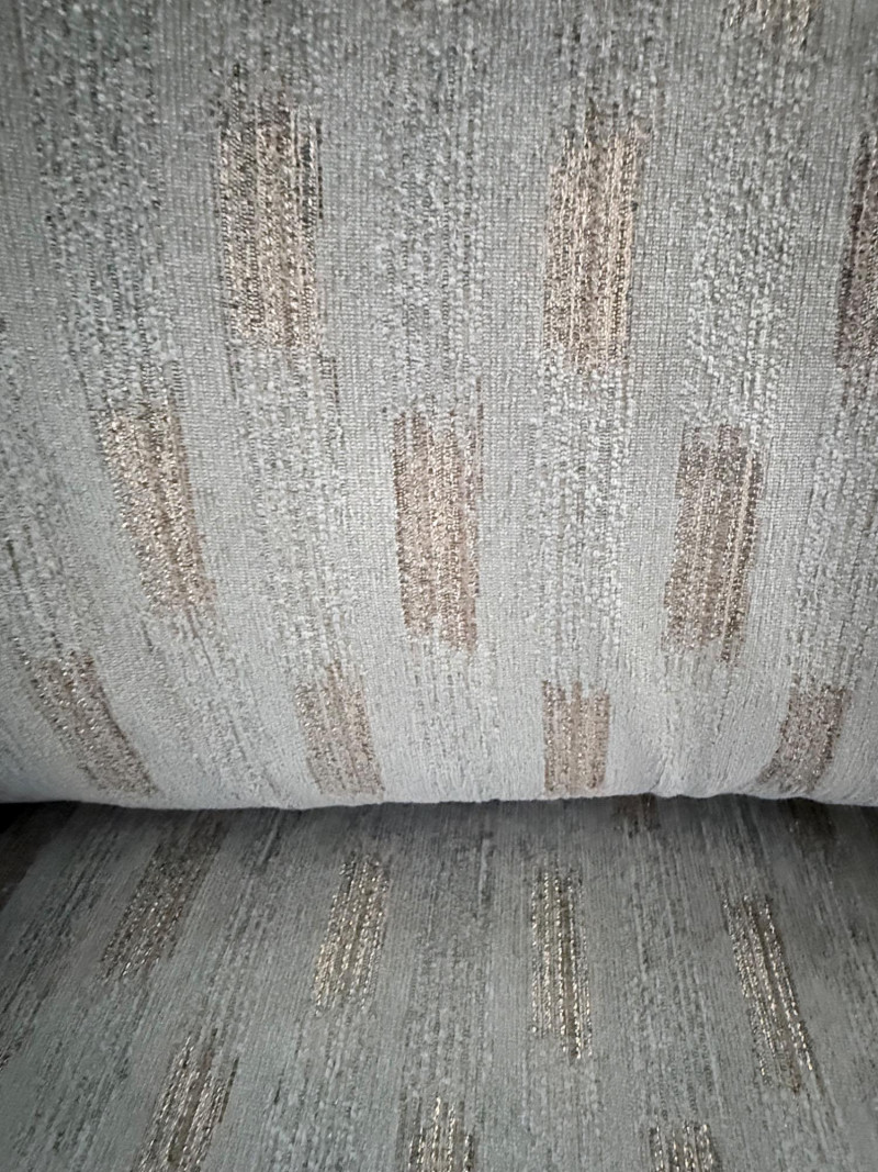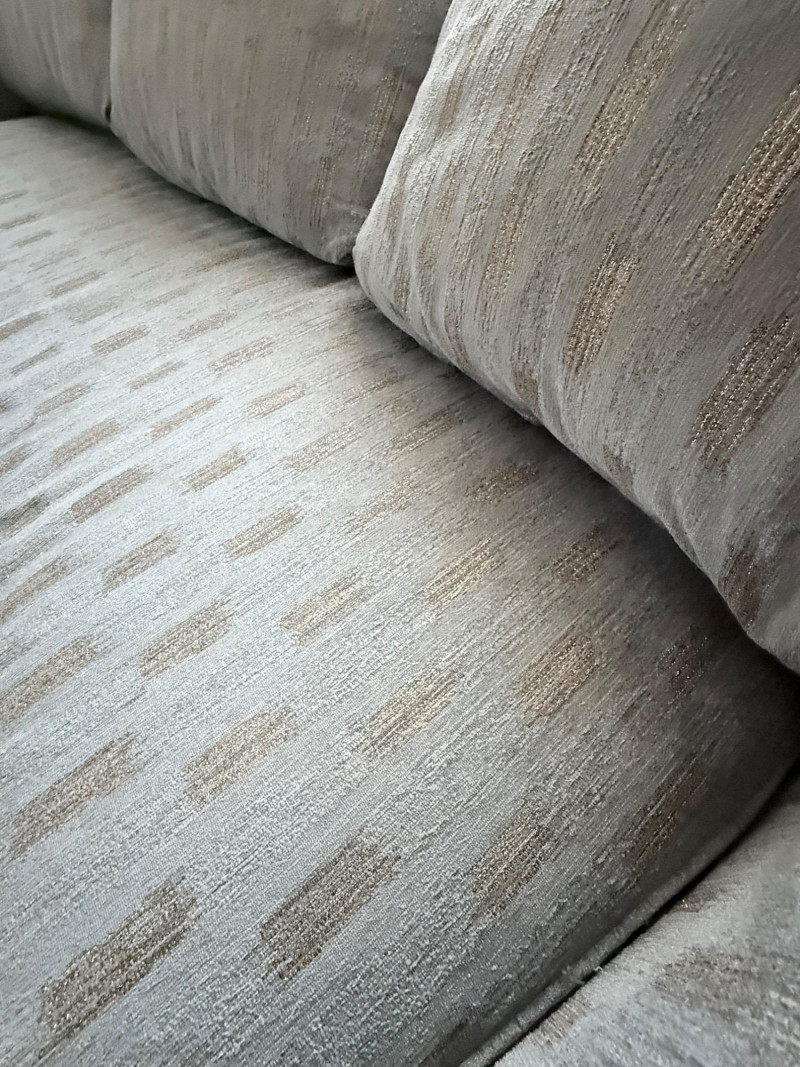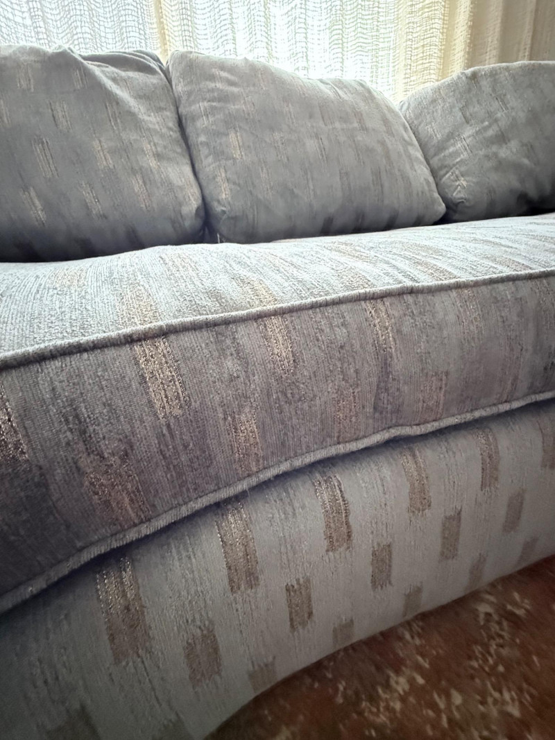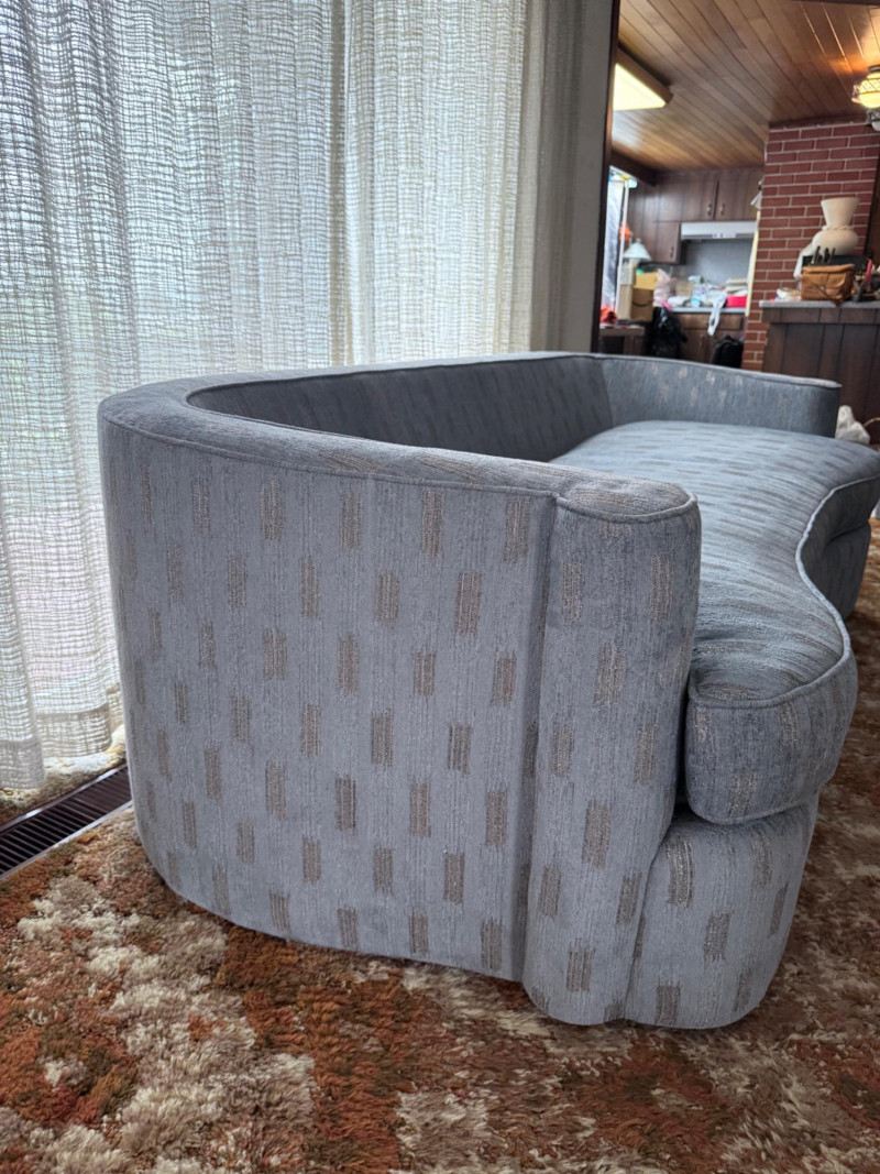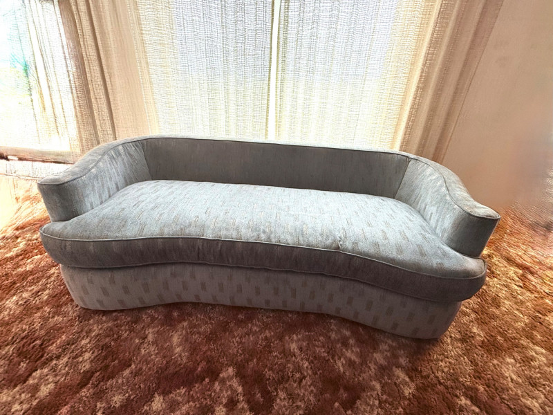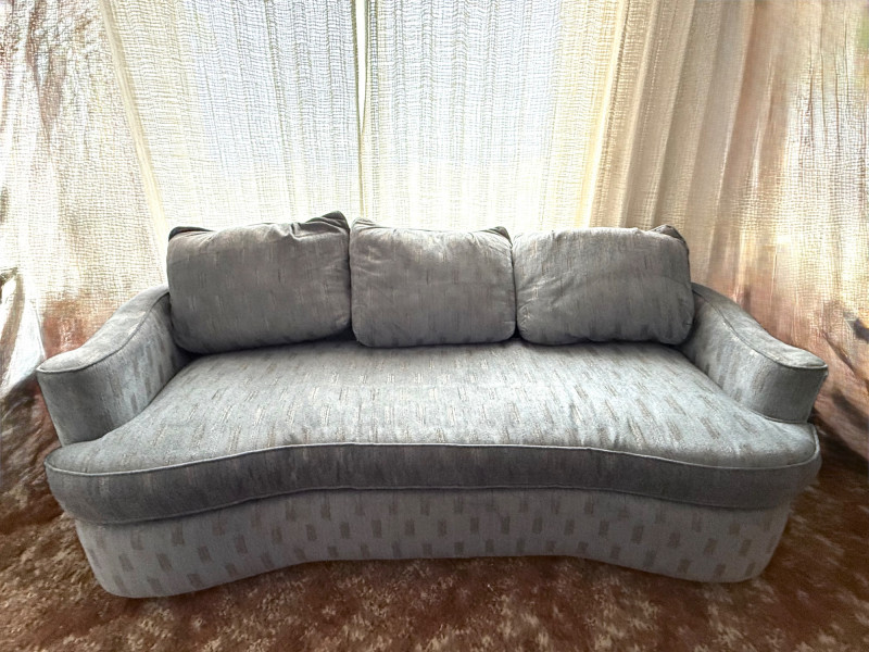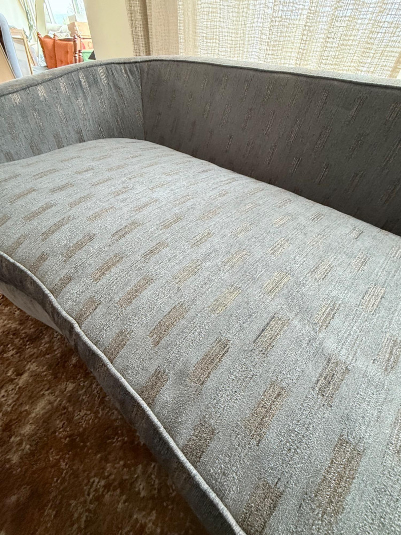 Contemporary Designer Sofa – Sculptural Silhouette with Textured Upholstery This unique designer sofa features an elegant sculptural silhouette with a gently curved front, tailored low profile arms, and a fully upholstered back for 360-degree appeal. The textured velvety fabric in a soft dove gray tone adds depth and a subtle geometric pattern for visual interest. The set includes three matching back cushions for added comfort and versatility. The piece evokes mid-century modern inspiration with a contemporary twist—ideal for statement seating in a formal living space or modern lounge. There are visible areas of wear and light discoloration on the arms and cushion edges (as shown), reflected in the price. Hard-to-find curved design makes this a standout furniture piece for collectors, interior designers, or those seeking high-end comfort and style.