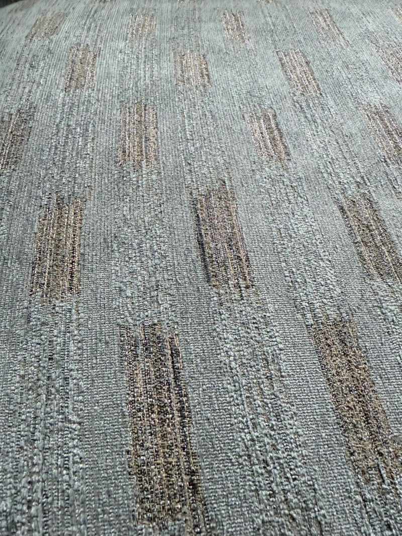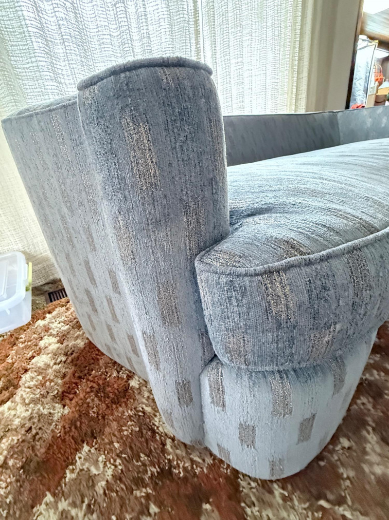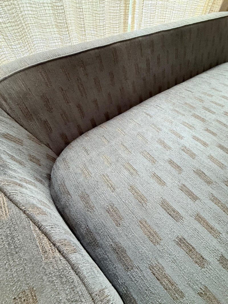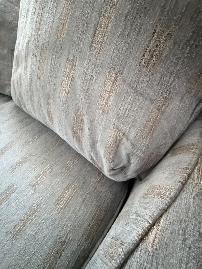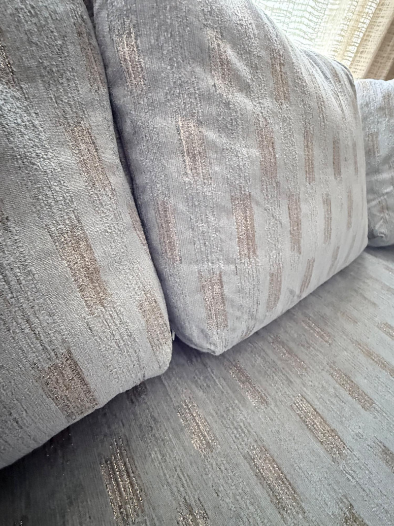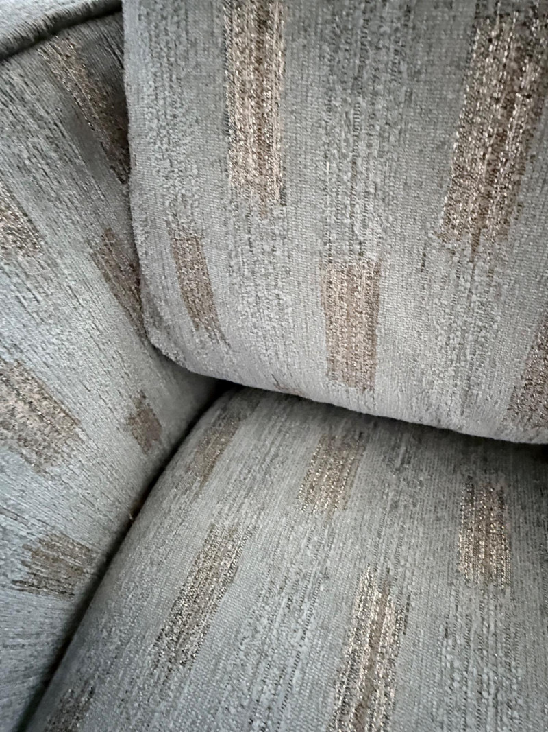 Contemporary Designer Sofa – Sculptural Silhouette with Textured Upholstery This unique designer sofa features an elegant sculptural silhouette with a gently curved front, tailored low profile arms, and a fully upholstered back for 360-degree appeal. The textured velvety fabric in a soft dove gray tone adds depth and a subtle geometric pattern for visual interest. The set includes three matching back cushions for added comfort and versatility. The piece evokes mid-century modern inspiration with a contemporary twist—ideal for statement seating in a formal living space or modern lounge. There are visible areas of wear and light discoloration on the arms and cushion edges (as shown), reflected in the price. Hard-to-find curved design makes this a standout furniture piece for collectors, interior designers, or those seeking high-end comfort and style.