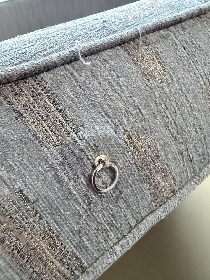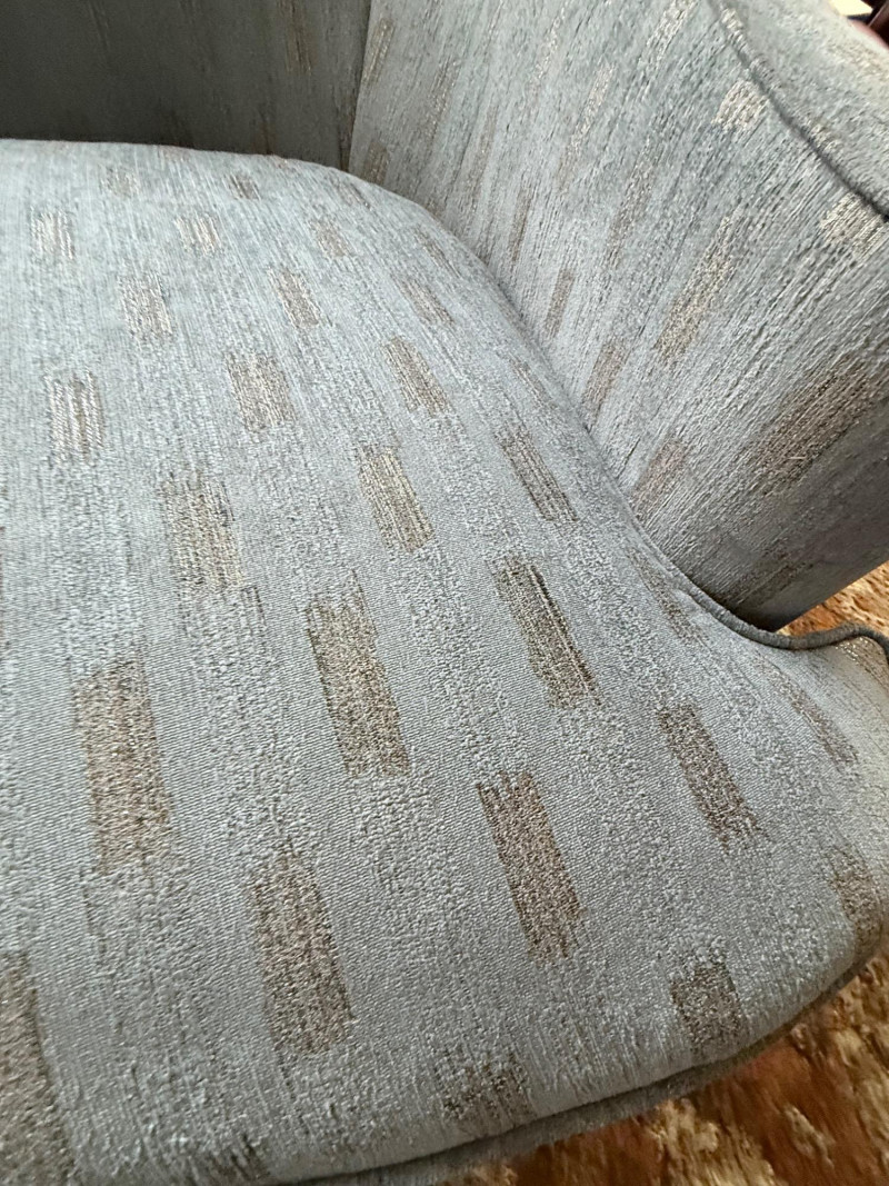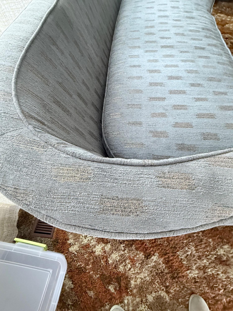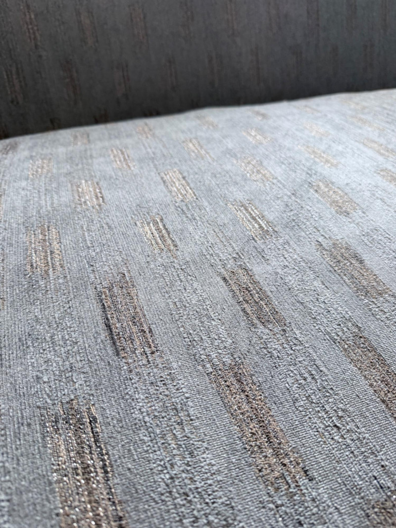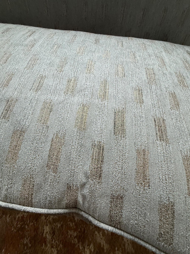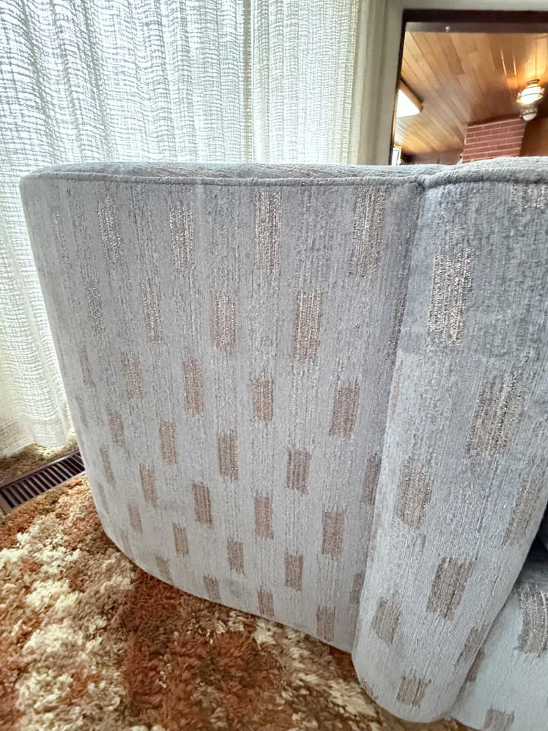Contemporary Designer Sofa – Sculptural Silhouette with Textured Upholstery This unique designer sofa features an elegant sculptural silhouette with a gently curved front, tailored low profile arms, and a fully upholstered back for 360-degree appeal. The textured velvety fabric in a soft dove gray tone adds depth and a subtle geometric pattern for visual interest. The set includes three matching back cushions for added comfort and versatility. The piece evokes mid-century modern inspiration with a contemporary twist—ideal for statement seating in a formal living space or modern lounge. There are visible areas of wear and light discoloration on the arms and cushion edges (as shown), reflected in the price. Hard-to-find curved design makes this a standout furniture piece for collectors, interior designers, or those seeking high-end comfort and style.