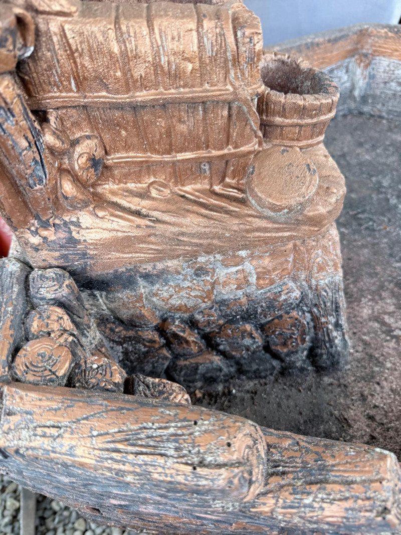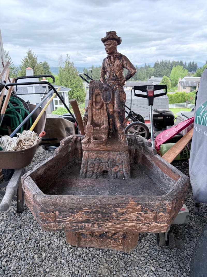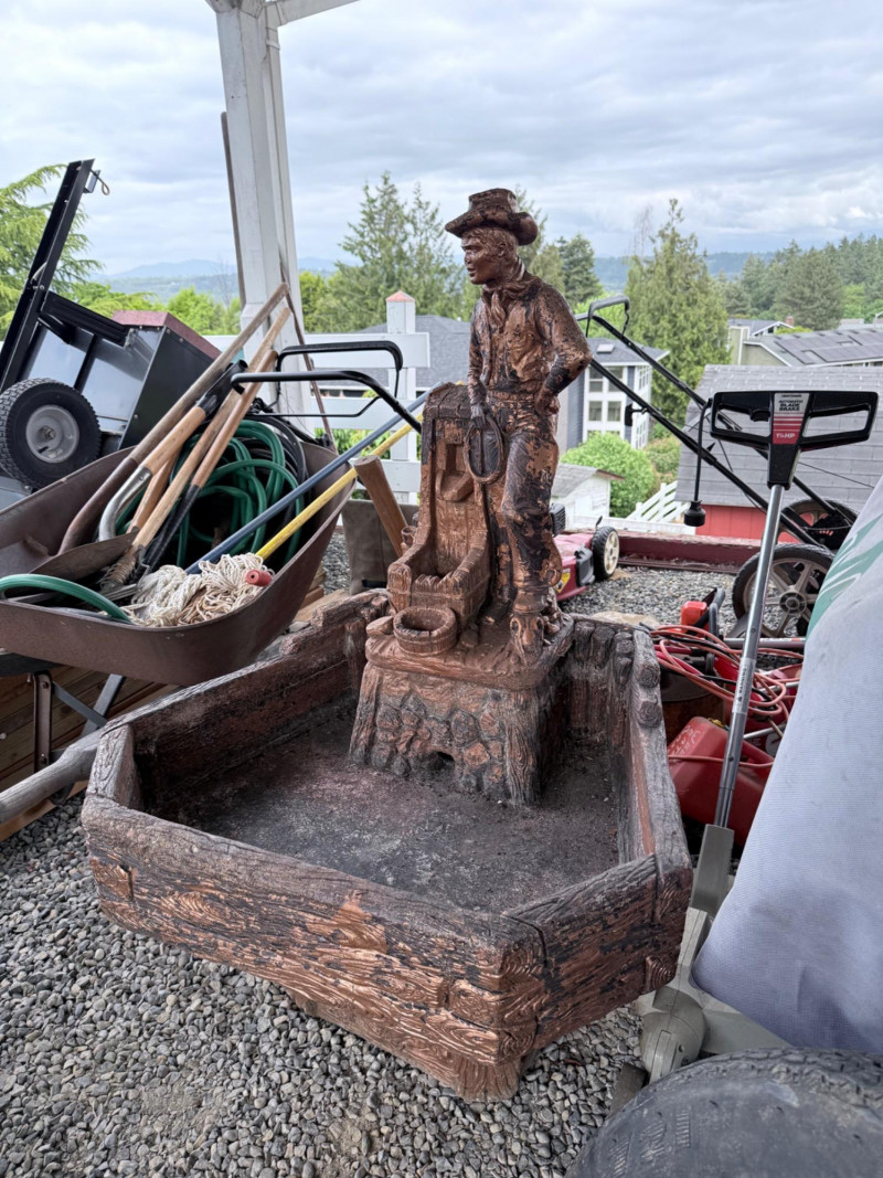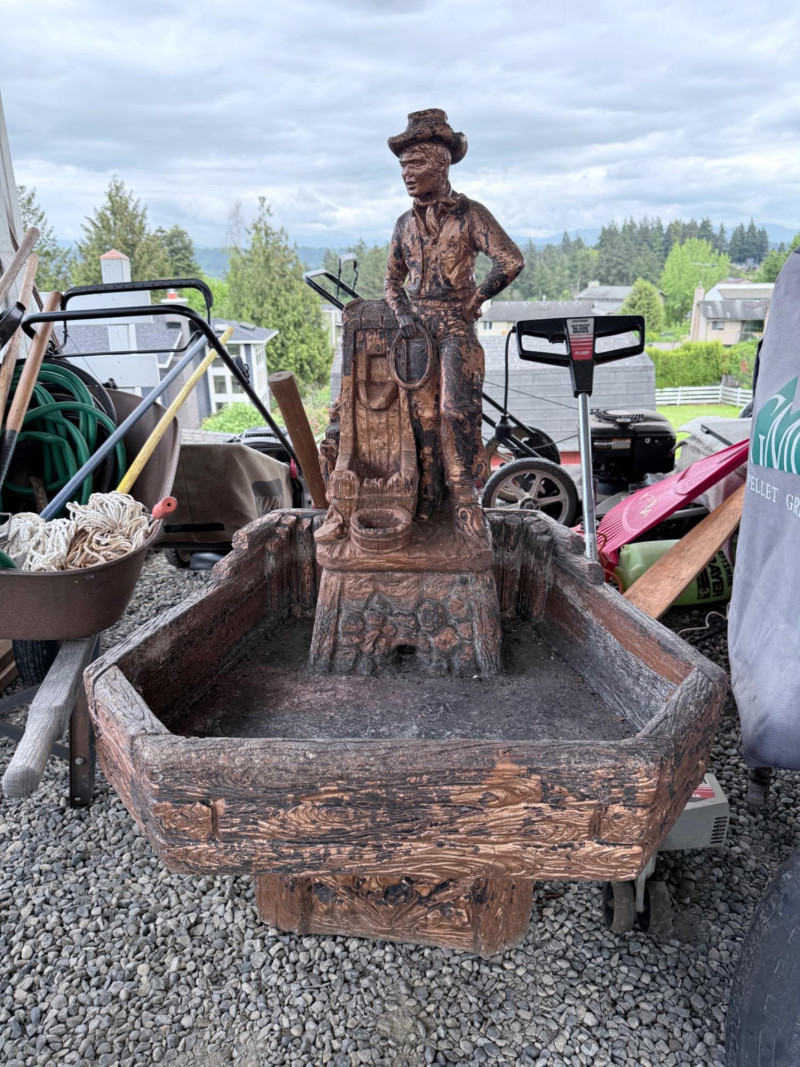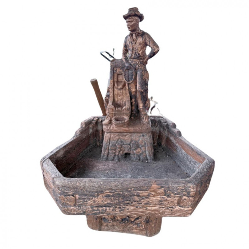 Rustic ceramic outdoor fountain featuring a detailed cowboy figure standing beside a saddle and rope motif. The base has a faux wood and stone texture with a wide hexagonal basin. Surface wear and weathering consistent with outdoor use. Fountain mechanism untested. Dimensions: 32” x 27” x 48” Tall