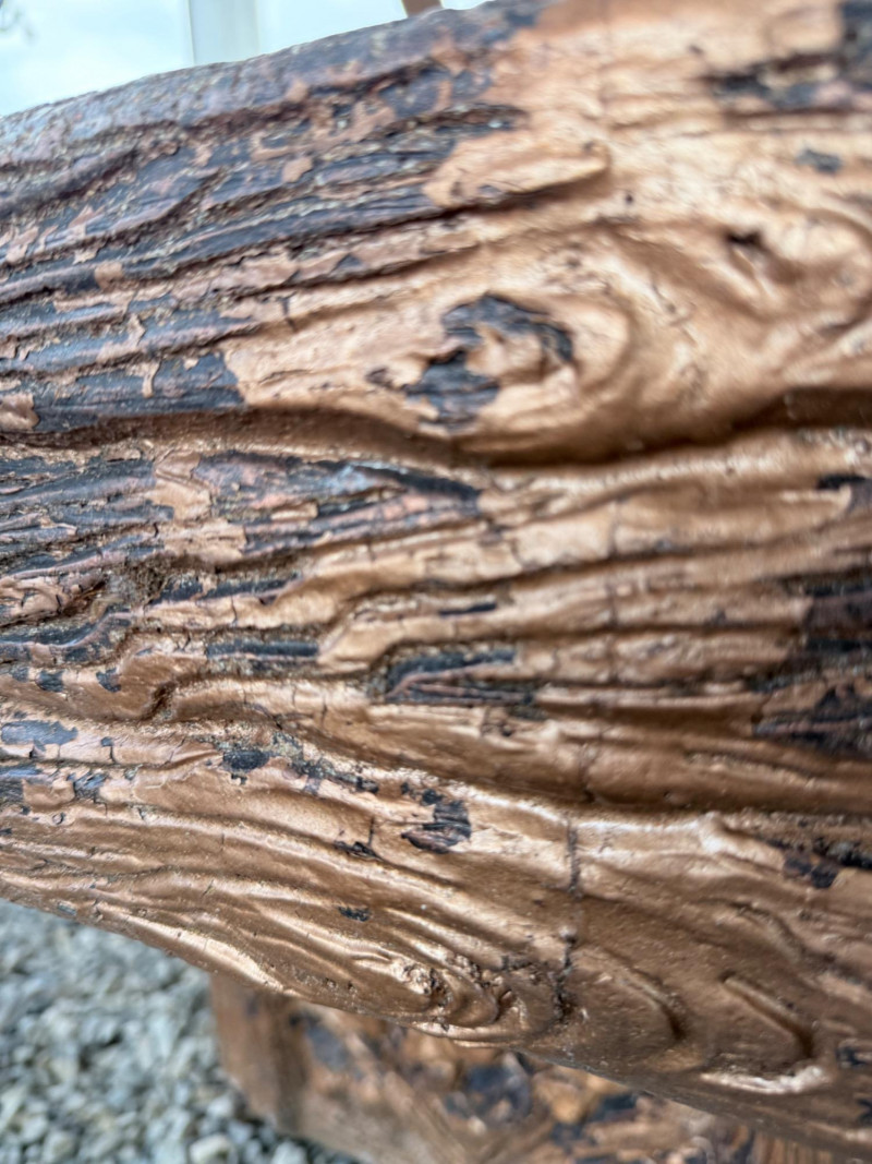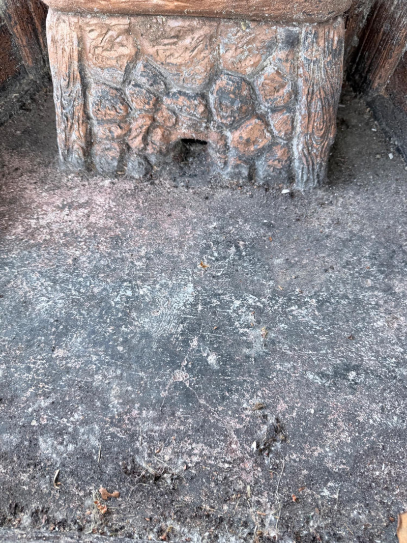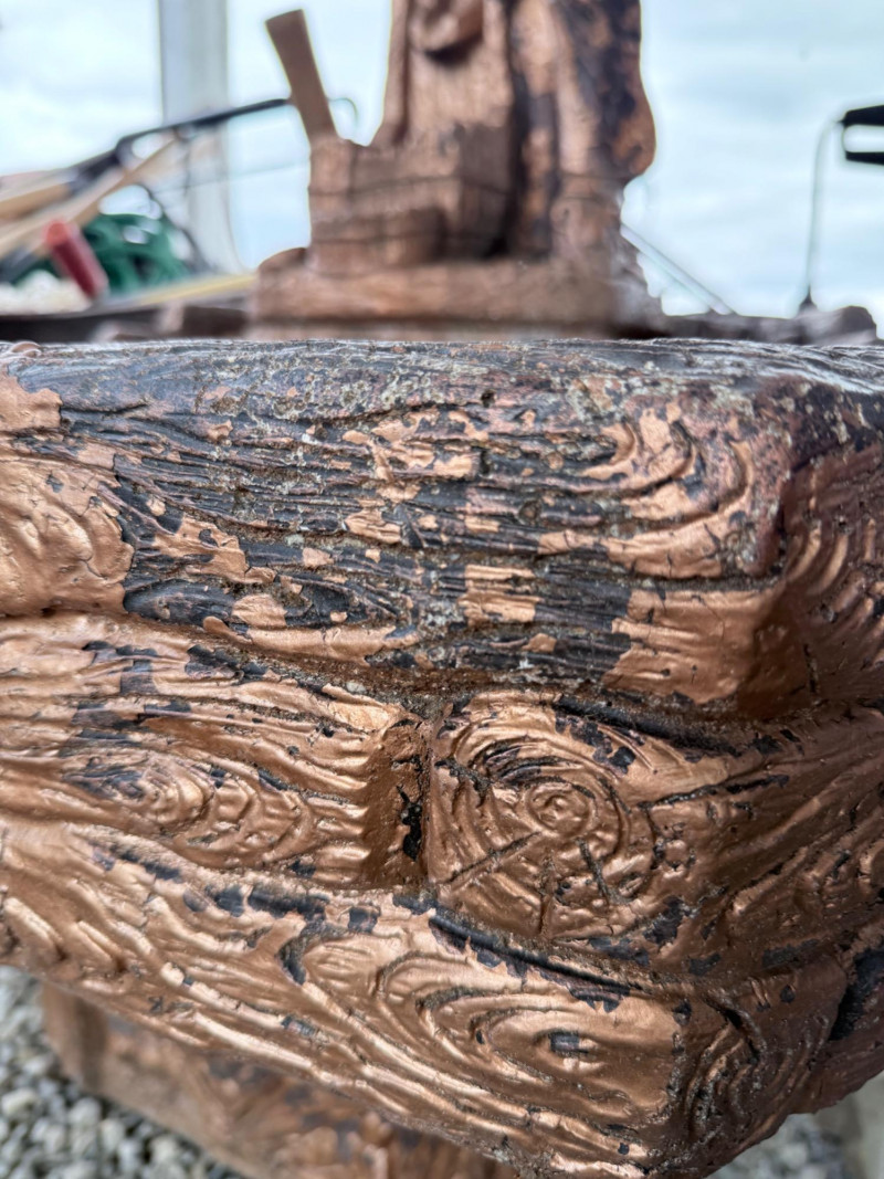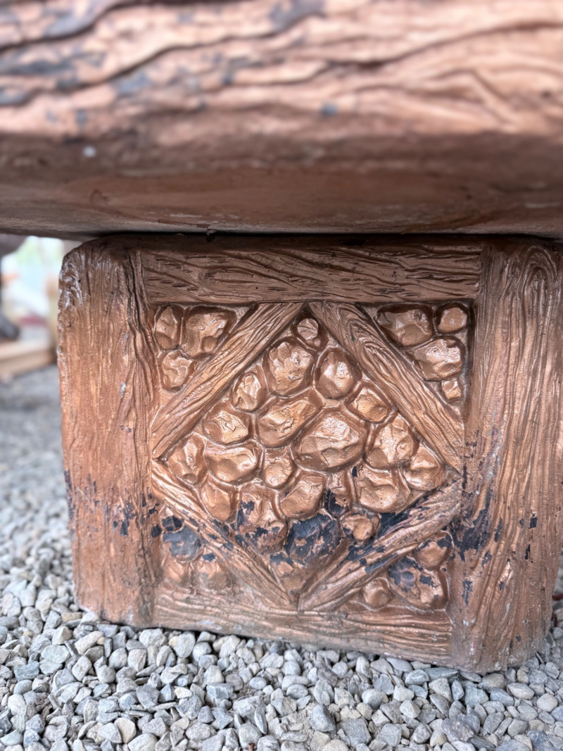 Rustic ceramic outdoor fountain featuring a detailed cowboy figure standing beside a saddle and rope motif. The base has a faux wood and stone texture with a wide hexagonal basin. Surface wear and weathering consistent with outdoor use. Fountain mechanism untested. Dimensions: 32” x 27” x 48” Tall