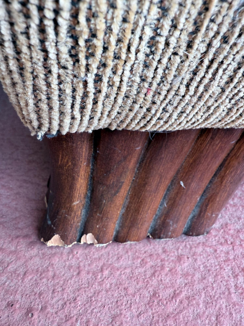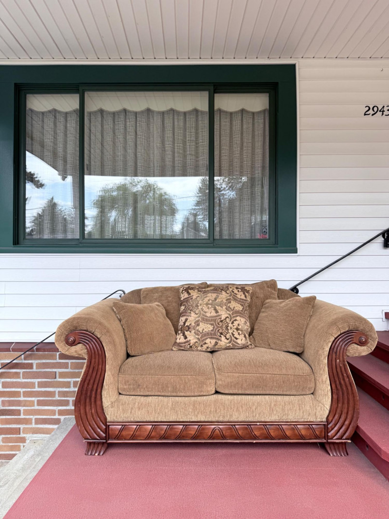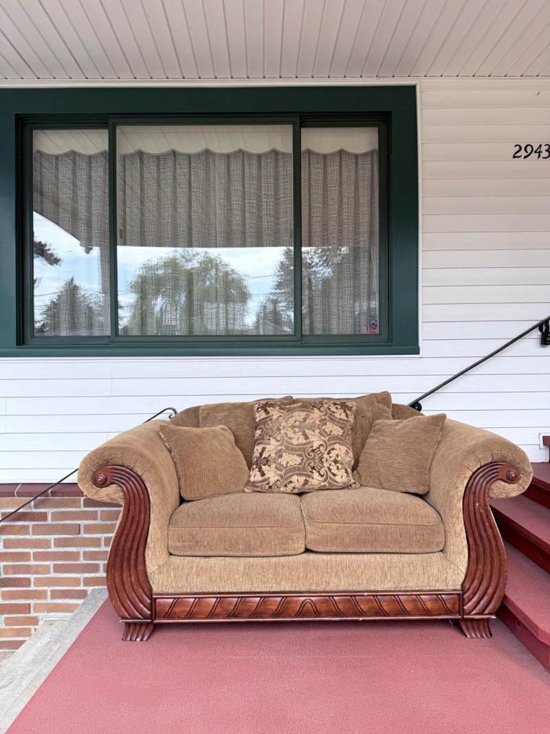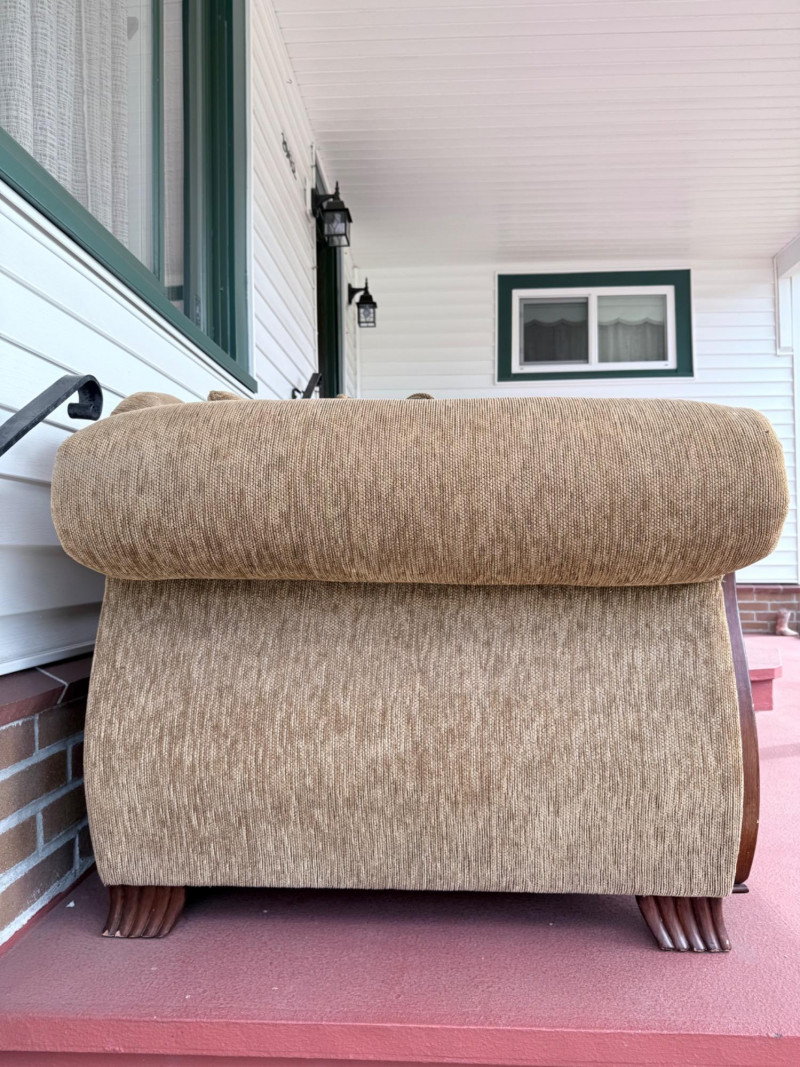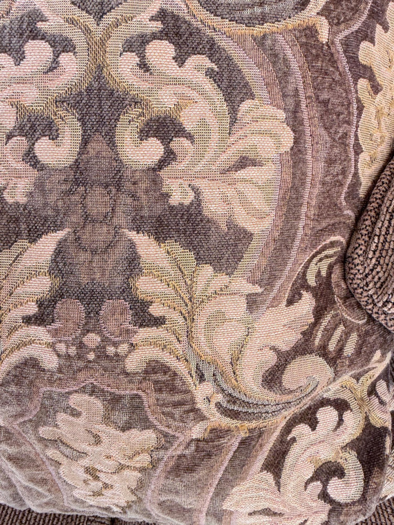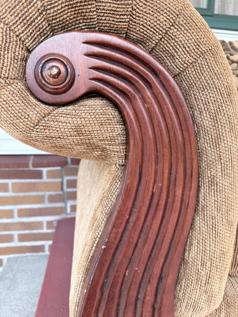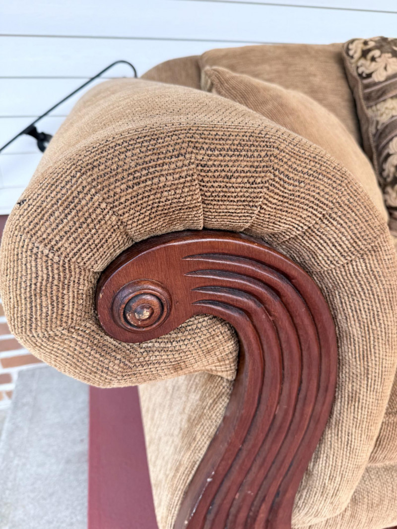 This plush indoor loveseat features rolled arms and ornate carved wood detailing along the base and sides. Upholstered in a neutral textured fabric, it includes five matching throw pillows for added comfort. Originally from another estate where it was kept indoors, the piece was relocated but could not be brought inside the pick-up location due to entryway limitations, so currently kept outside under cover until it is picked up. 72" length x 40.5" width x 36" Height