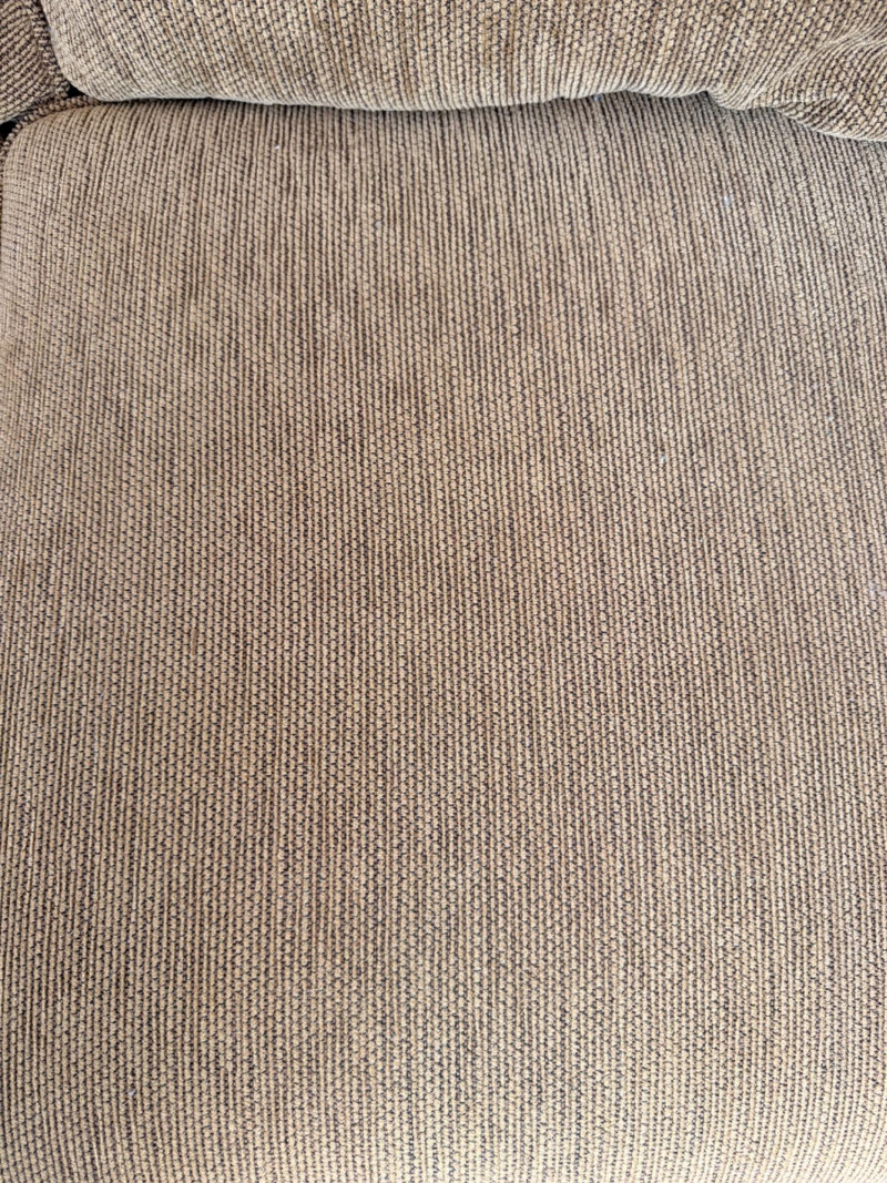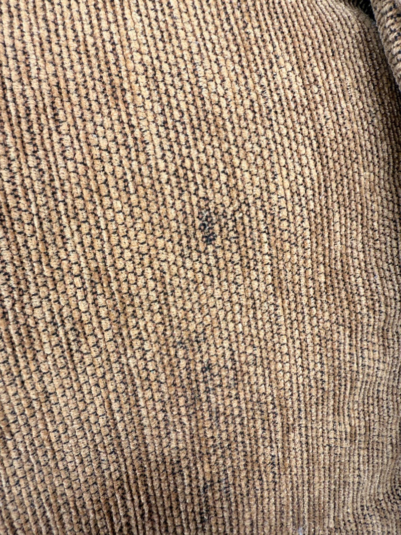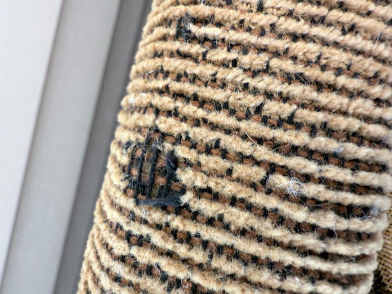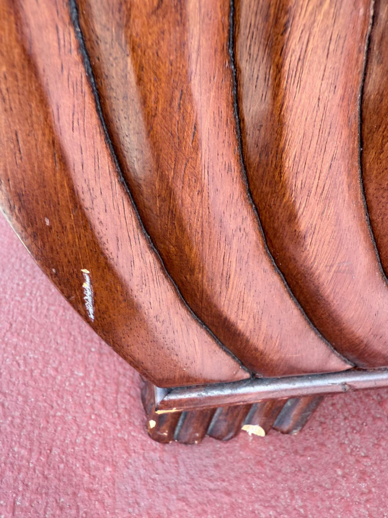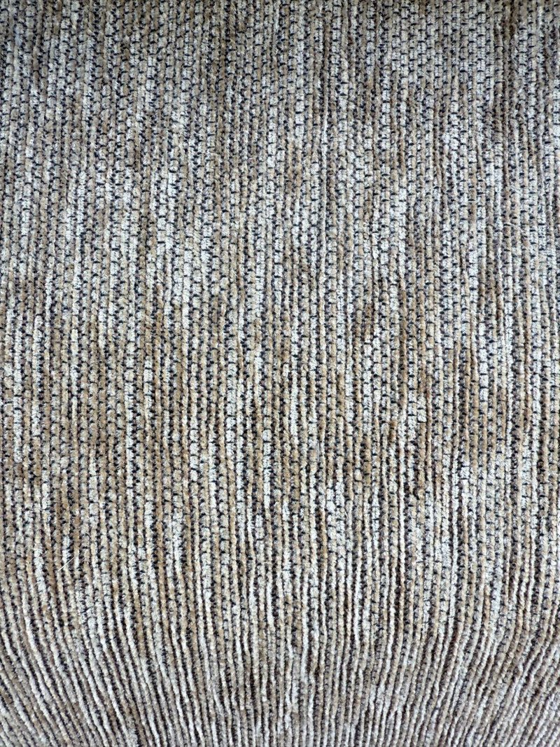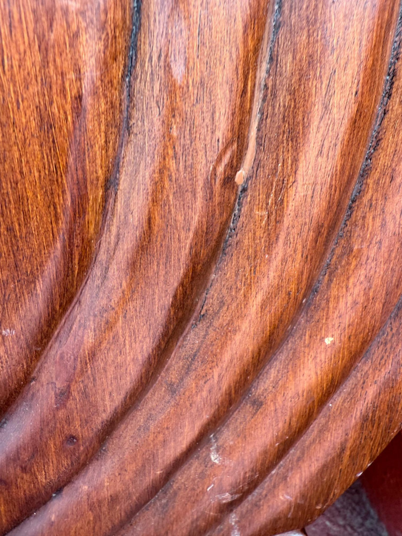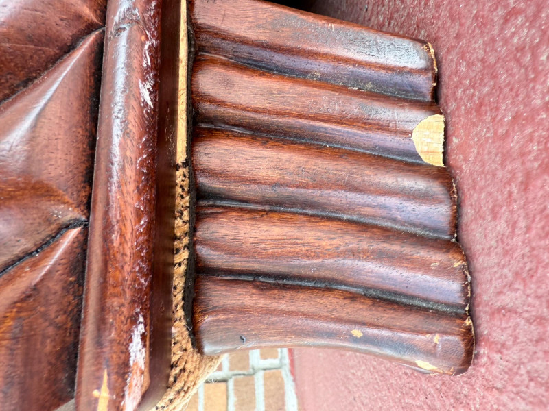 This plush indoor loveseat features rolled arms and ornate carved wood detailing along the base and sides. Upholstered in a neutral textured fabric, it includes five matching throw pillows for added comfort. Originally from another estate where it was kept indoors, the piece was relocated but could not be brought inside the pick-up location due to entryway limitations, so currently kept outside under cover until it is picked up. 72" length x 40.5" width x 36" Height