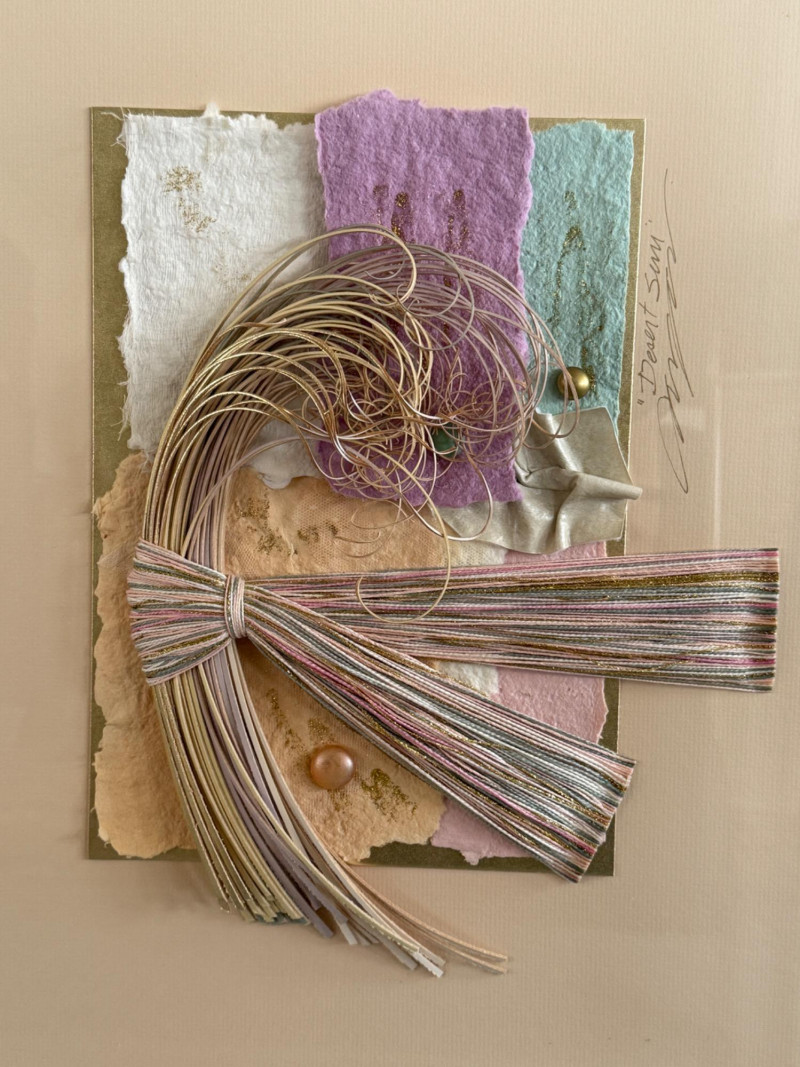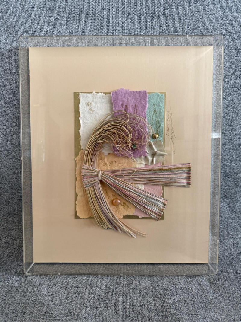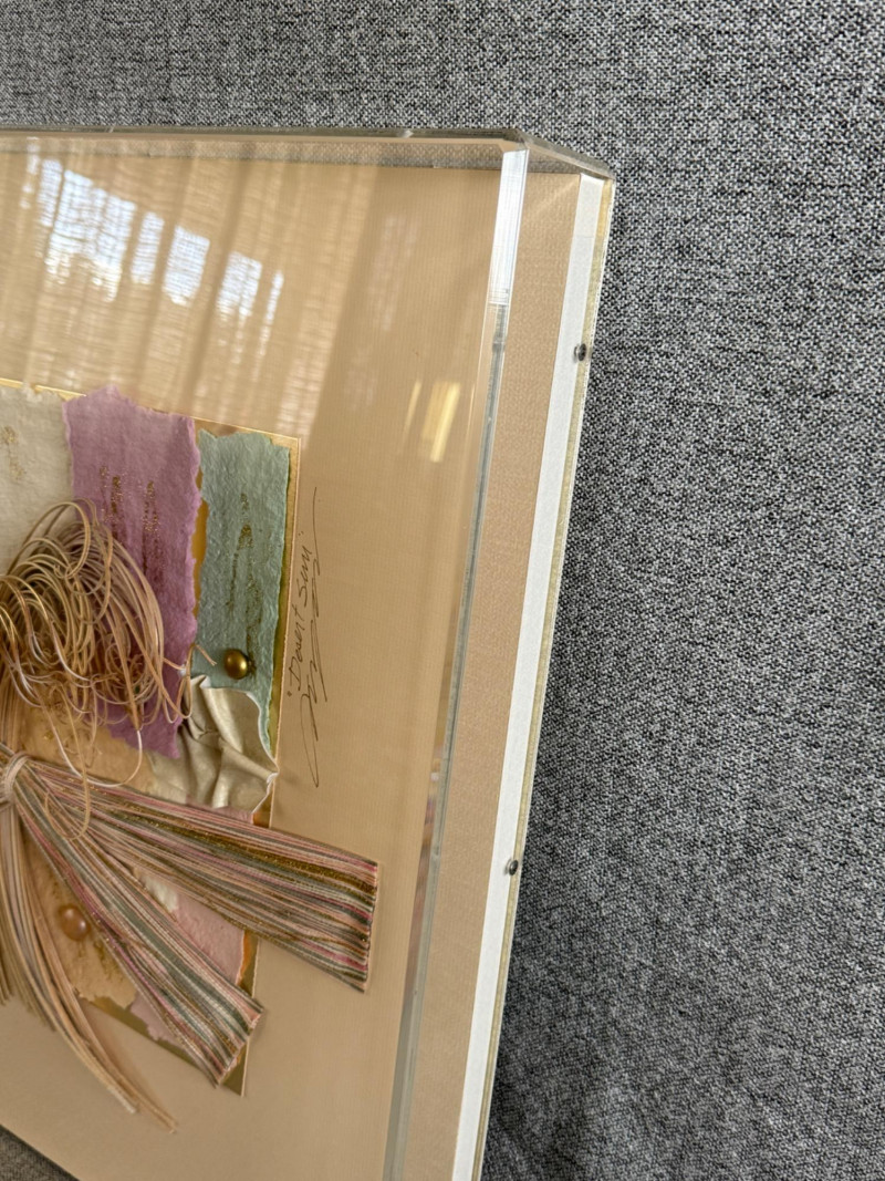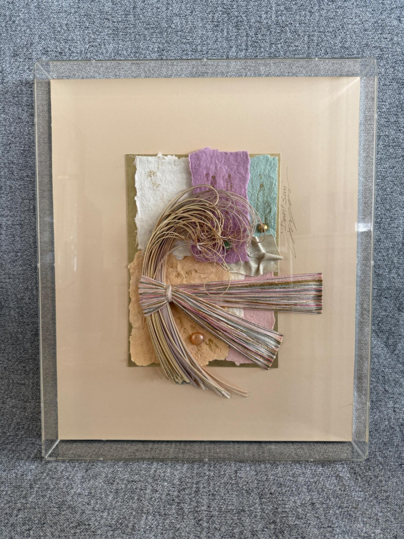 Unique shadow box wall art signed by David Shum, dated 11/9/1989. This dimensional mixed media piece features layered handmade papers in pastel tones, satin fabric, pearl and gold-tone accents, and meticulously coiled decorative wire elements. All elements are arranged in a harmonious, abstract composition and encased in a thick acrylic display frame. Signature and date are visible on the artwork's front. Dimensions: