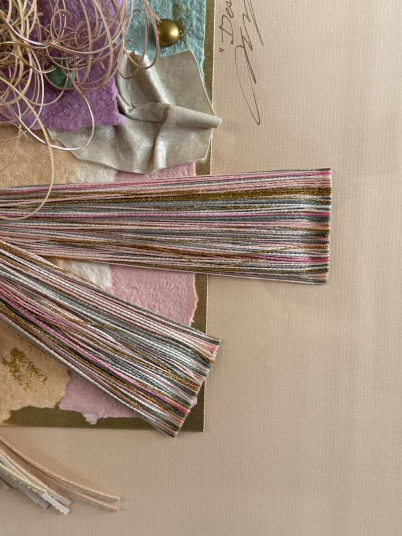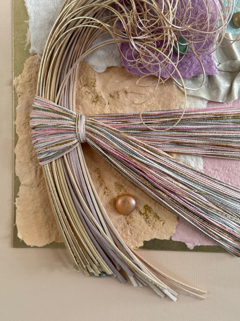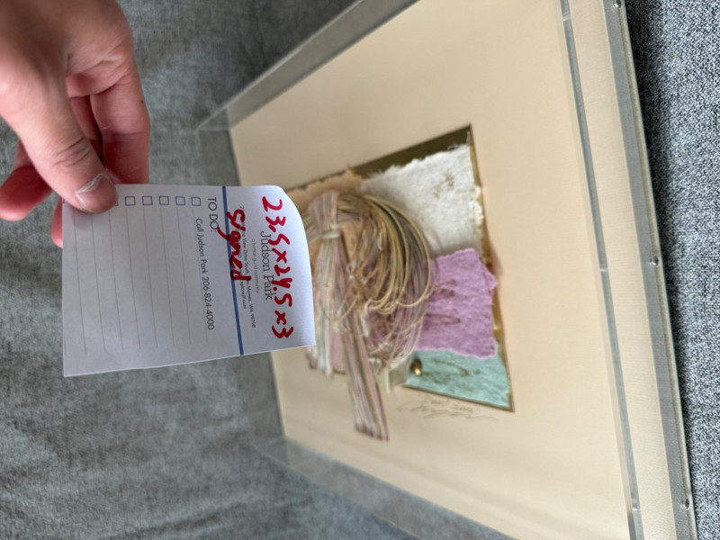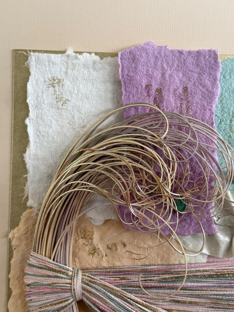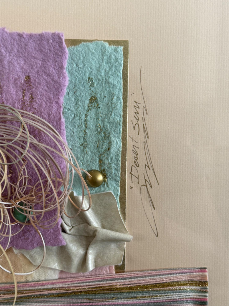 Unique shadow box wall art signed by David Shum, dated 11/9/1989. This dimensional mixed media piece features layered handmade papers in pastel tones, satin fabric, pearl and gold-tone accents, and meticulously coiled decorative wire elements. All elements are arranged in a harmonious, abstract composition and encased in a thick acrylic display frame. Signature and date are visible on the artwork's front. Dimensions: