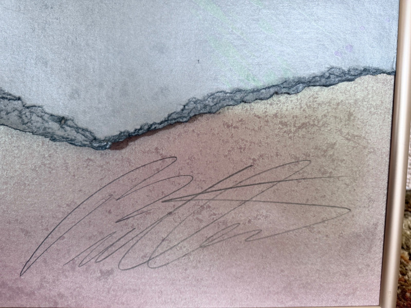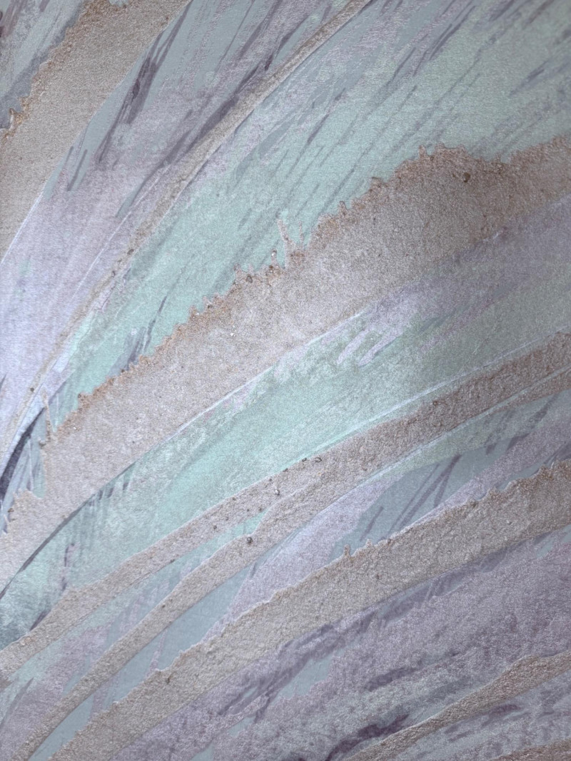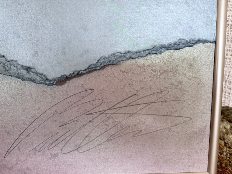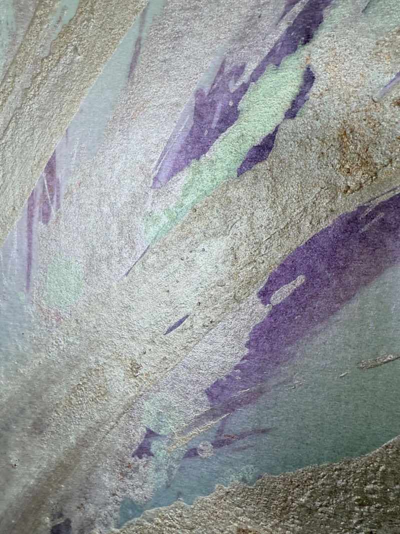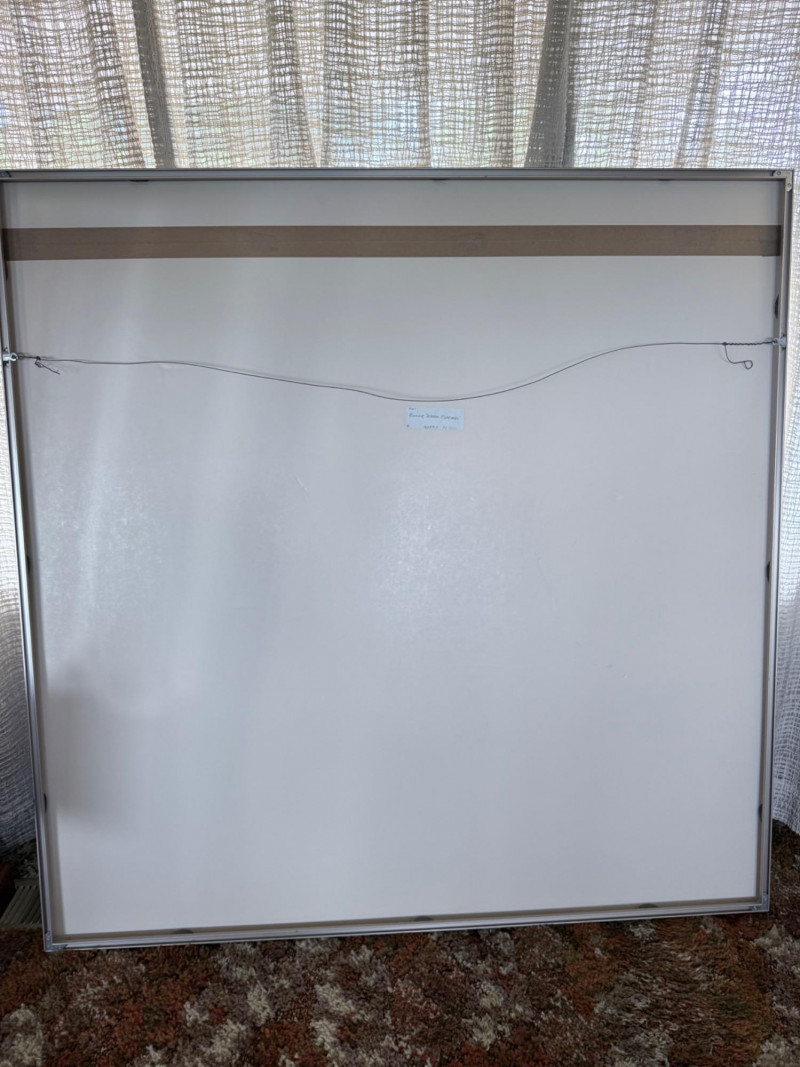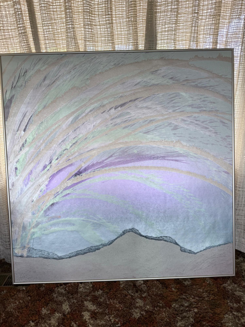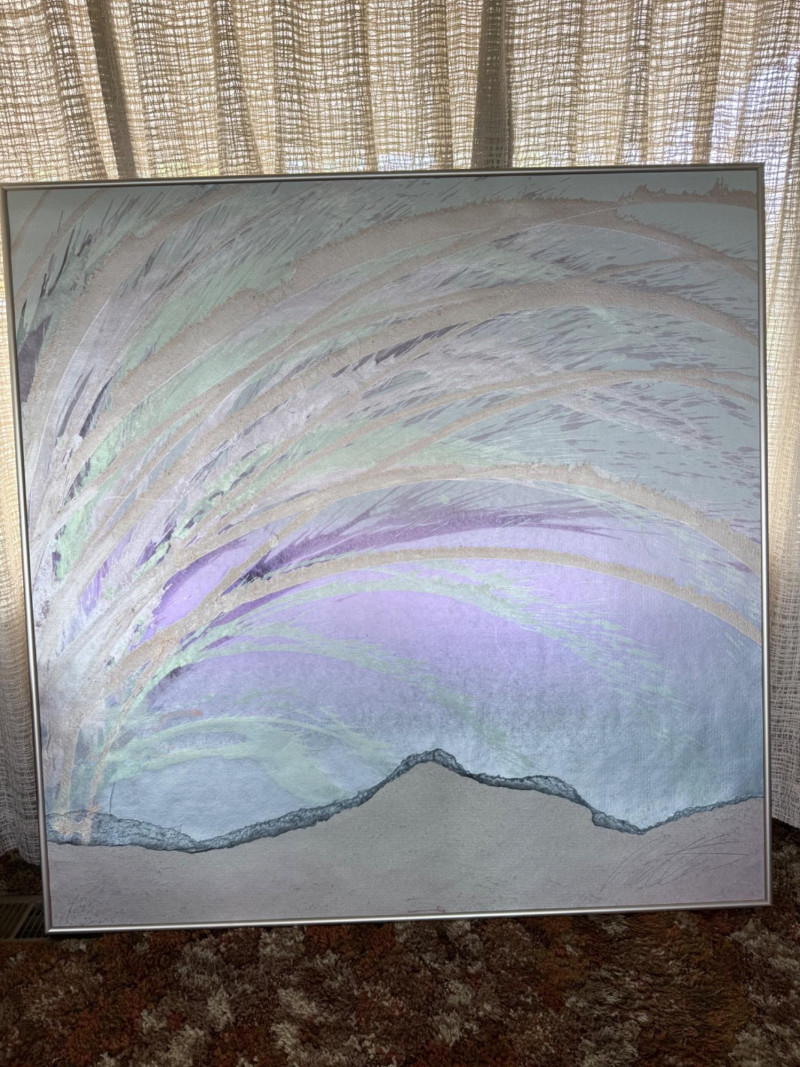 Large signed abstract painting titled "Warm Springs" by Butler, measuring 52 x 52 inches. This textured mixed media piece features soft lavender, silver, mint, and earth-toned sweeping brushwork, evoking a sense of motion and serenity. Signed by the artist in the lower left. Housed in a sleek metallic frame.