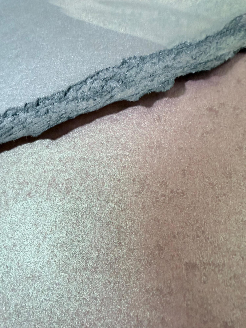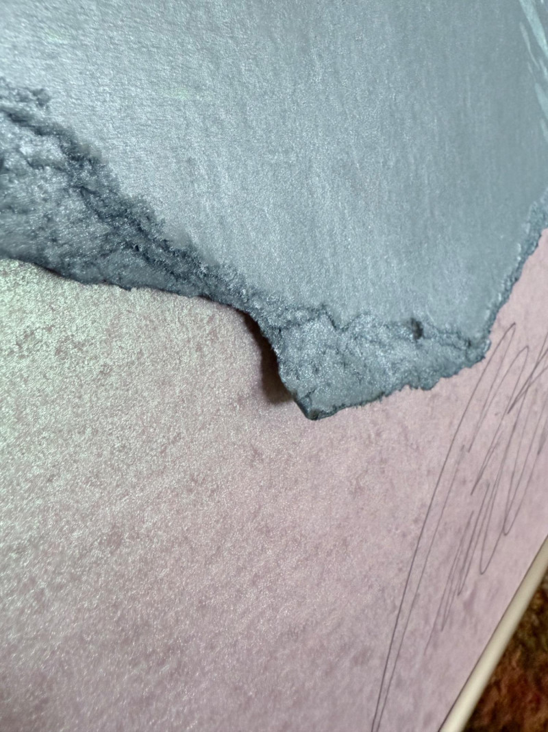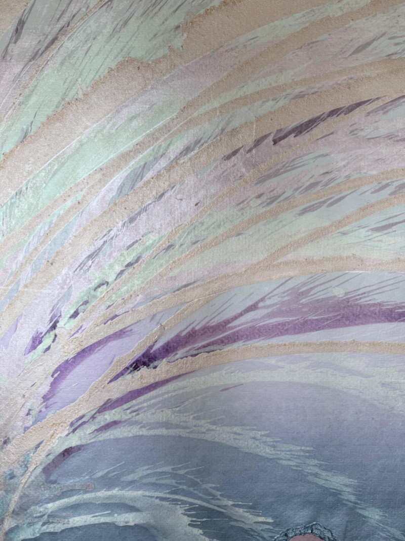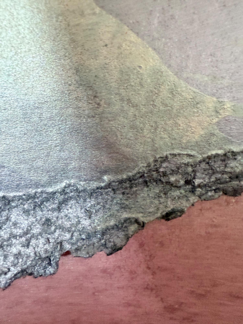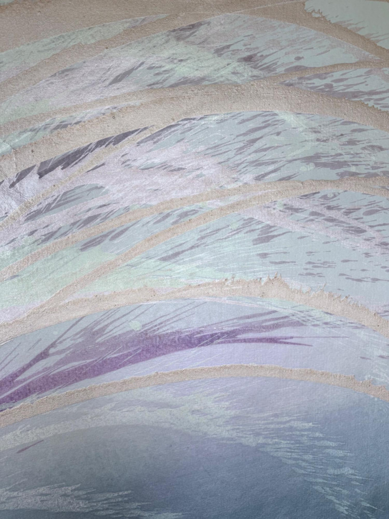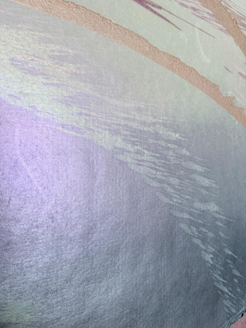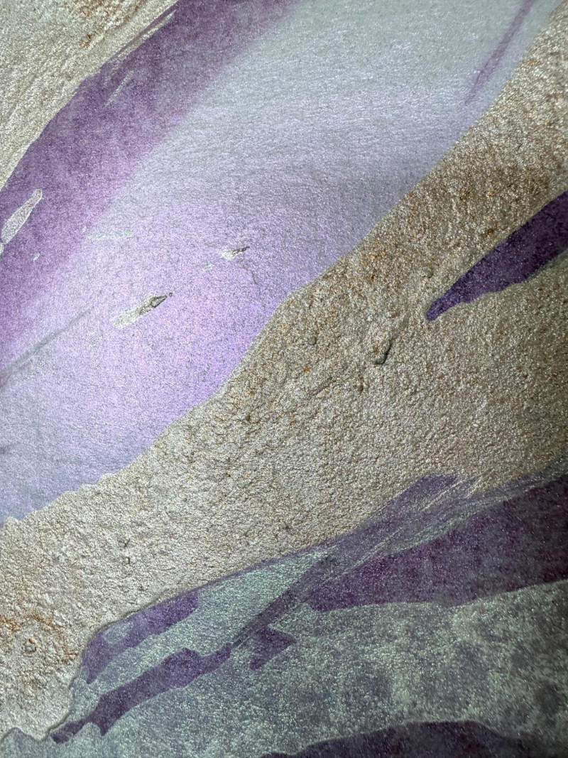 Large signed abstract painting titled "Warm Springs" by Butler, measuring 52 x 52 inches. This textured mixed media piece features soft lavender, silver, mint, and earth-toned sweeping brushwork, evoking a sense of motion and serenity. Signed by the artist in the lower left. Housed in a sleek metallic frame.