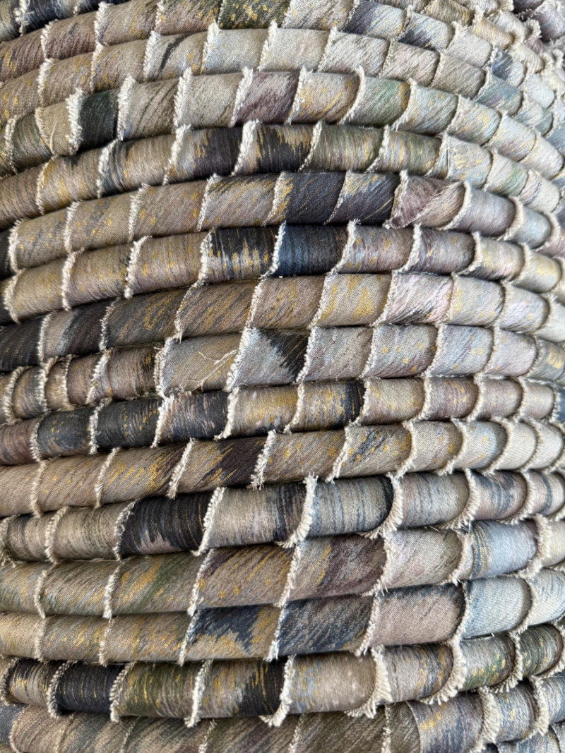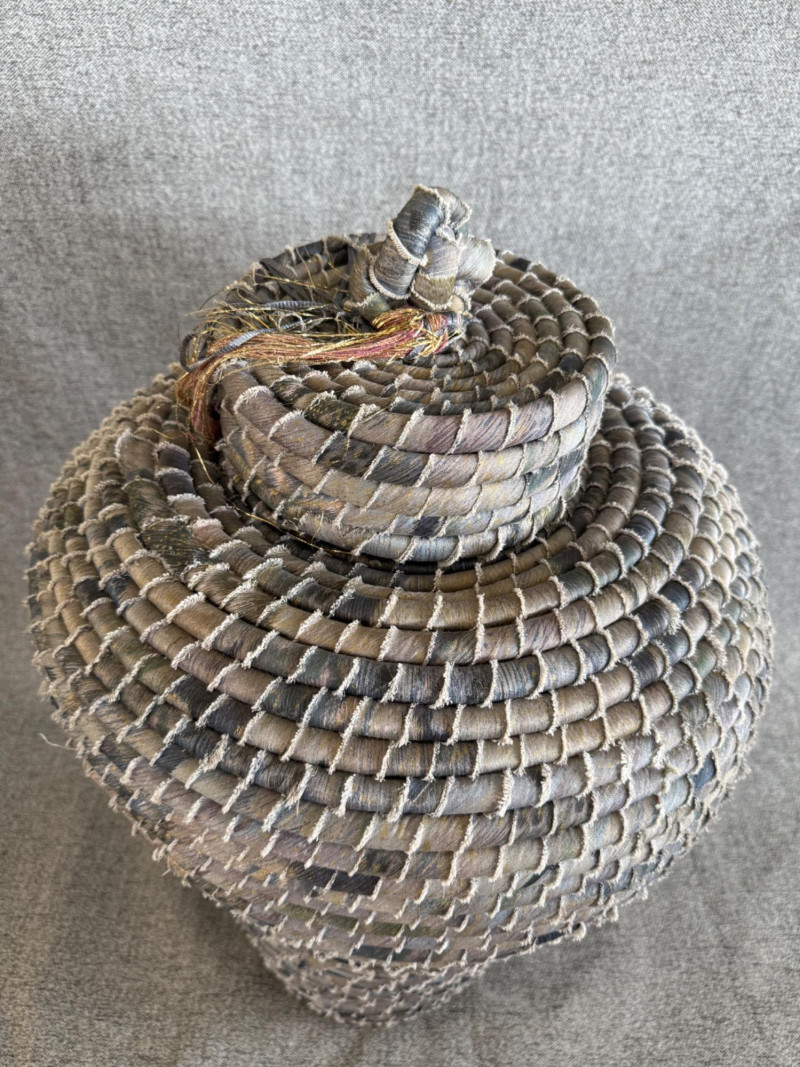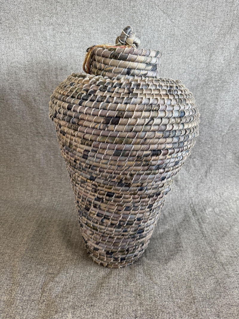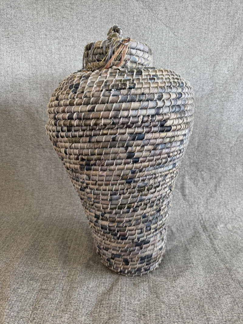 Handwoven Decorative Basket with Lid – 30” x 40” This striking handwoven basket is a beautiful blend of traditional craftsmanship and rustic elegance. Measuring approximately 30 inches wide by 40 inches tall, it features a tightly coiled construction using natural fibers in a rich mix of earthy tones, creating a visually captivating pattern throughout. The basket comes with a matching lid, enhancing its sculptural quality and functional appeal. Ideal as a statement piece for home décor, storage, or as an artistic collector’s item, this one-of-a-kind basket showcases skilled artisan weaving and a timeless design. Condition: vintage condition with minor signs of wear consistent with handcrafted items. Dimensions: Height: 40 inches Width: 30 inches