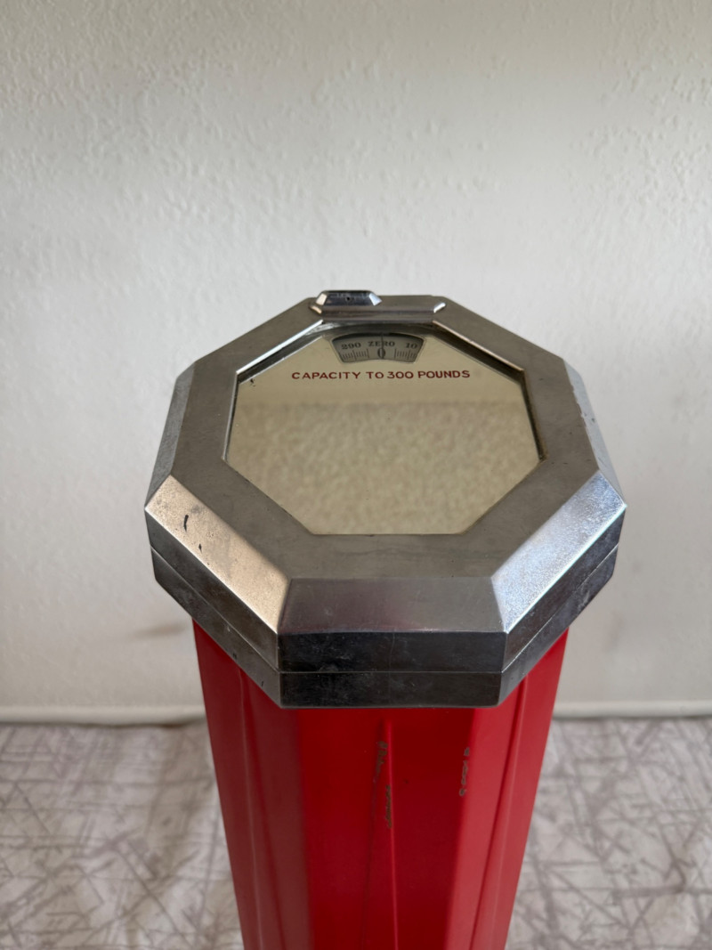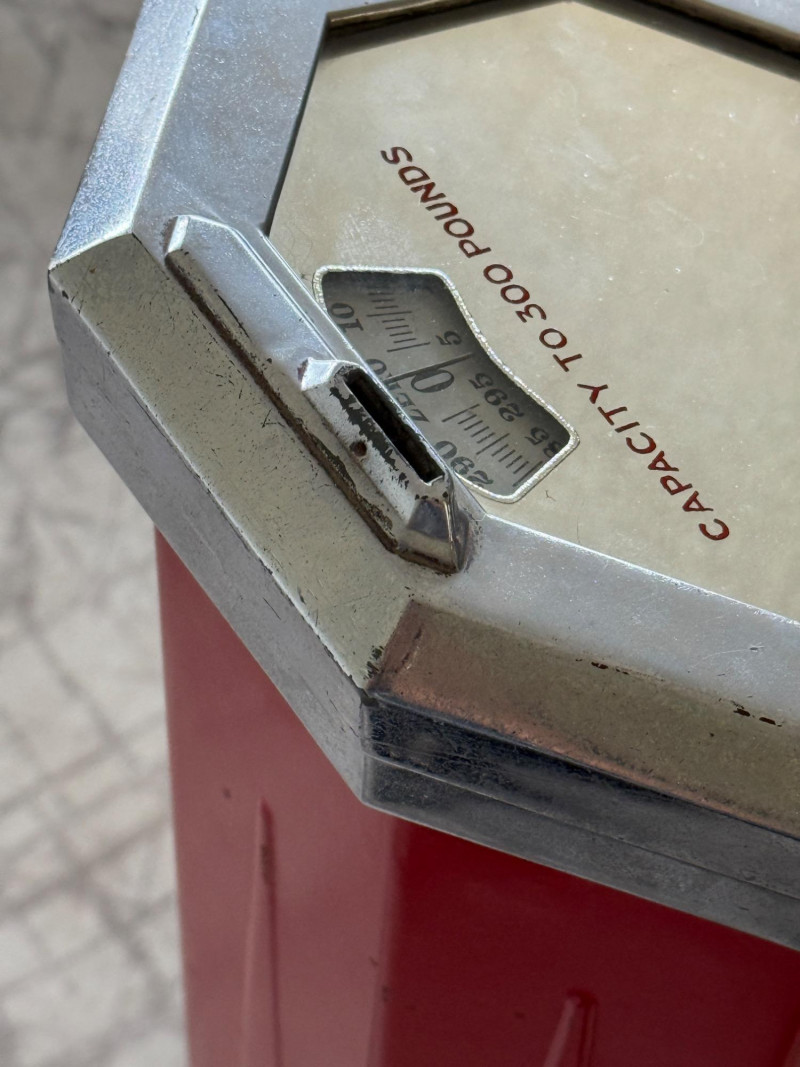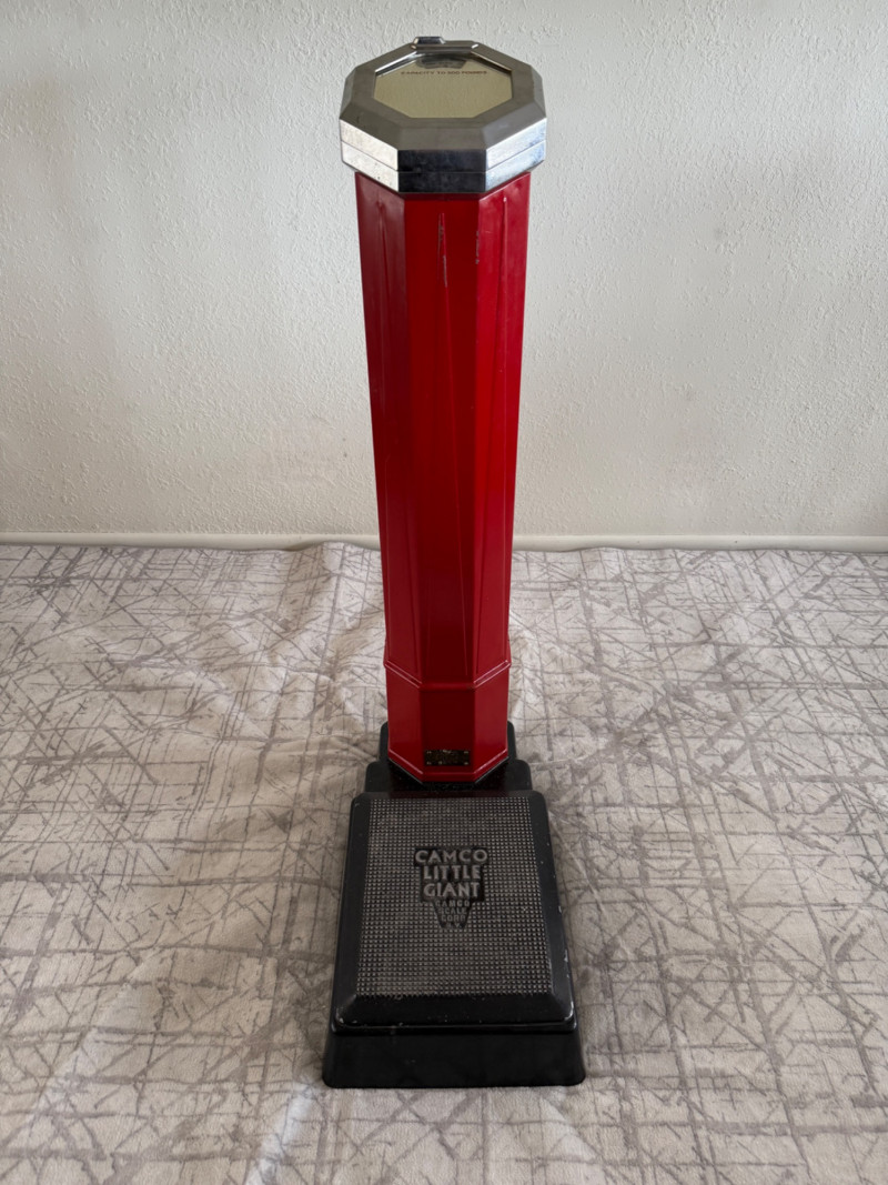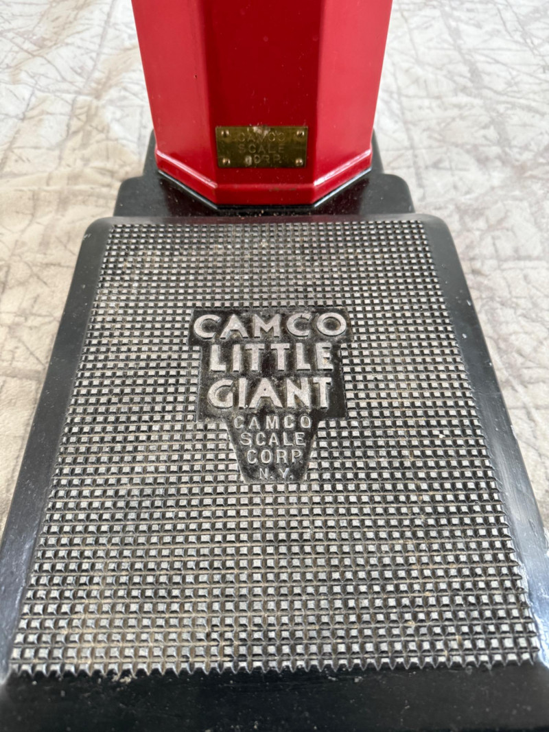 Vintage CAMCO “Little Giant” Penny Scale – Cast Iron with Red Column Offered here is a rare CAMCO Little Giant penny scale, manufactured by Camco Scale Corp., a company known for their durable commercial scales in the mid-20th century. This piece features a bold red octagonal column, chrome accents, and a cast iron base marked with the original raised CAMCO branding. Key Features: Manufacturer: CAMCO Scale Corp., U.S.A. Model: Little Giant Era: Likely 1930s–1950s Construction: Cast iron base and column, metal dial, and chrome details Function: Originally used in public places like pharmacies and bus stations; operated with a penny to display weight Condition: Displays very well with bright red paint and readable faceplate; some wear and patina consistent with age. Untested for functionality. Dimensions: Approximately 13" W x 21" D x 42" Rarity & Value: Estimated value (based on market comps): $300–$600, depending on working condition and local demand. Collectors value them for both nostalgic charm and industrial design appeal—often used as decorative statement pieces in vintage-themed interiors or businesses. A standout piece of Americana and functional industrial art