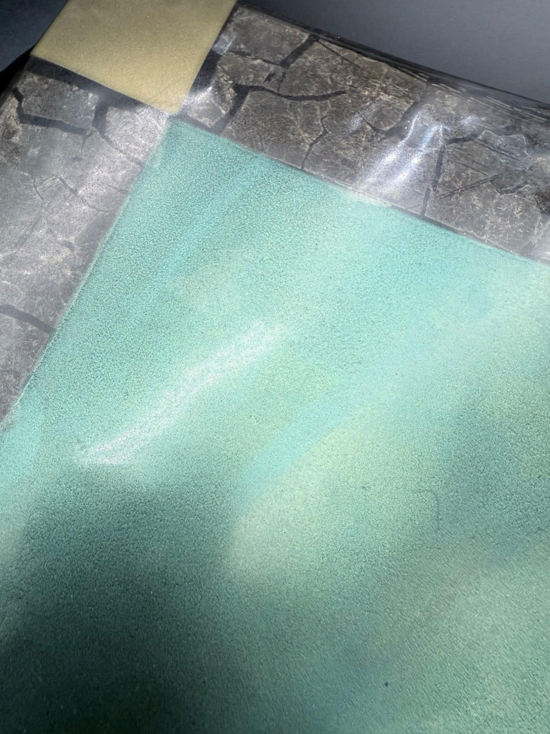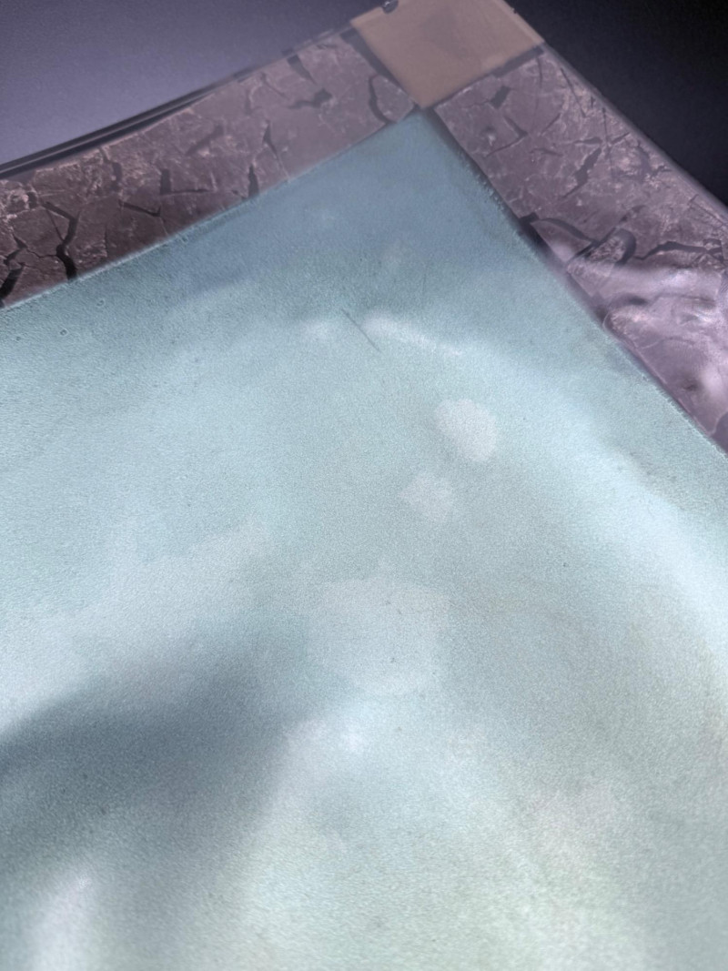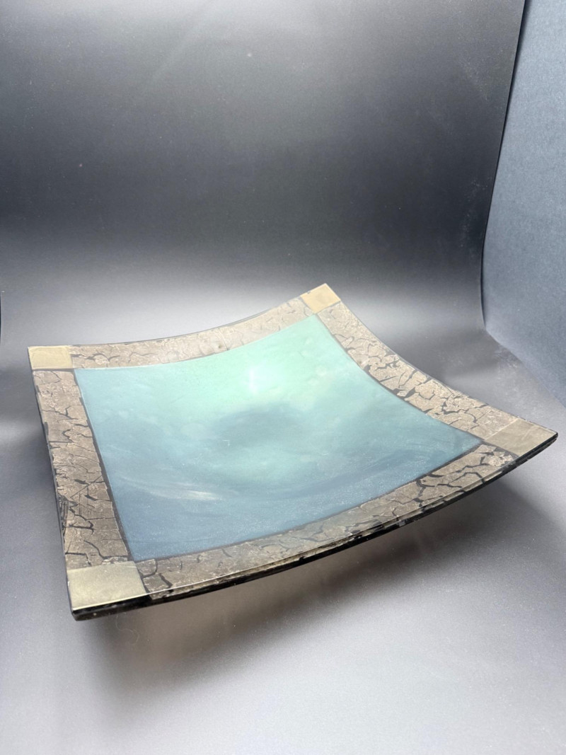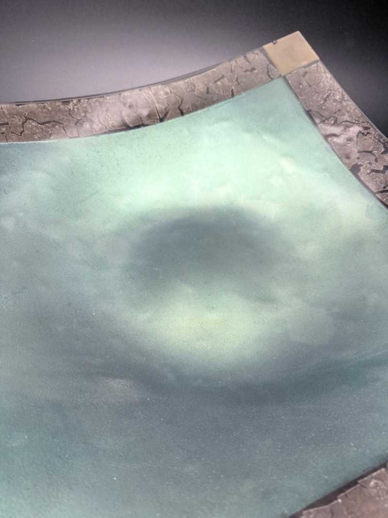 Large square art glass bowl with a softly sloped center and gently flared, upturned corners. The interior showcases a frosted seafoam green surface with a subtle crater-like indent, while the outer edges are bordered by a textured crackle design in earthy gray and beige tones. The contrast between the smooth glass and rugged border adds depth and visual interest. Dimensions: 18.5" x 18.5" and 4" tall