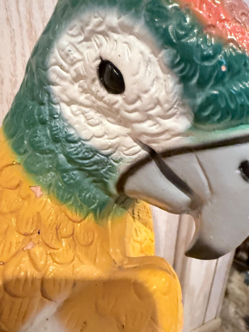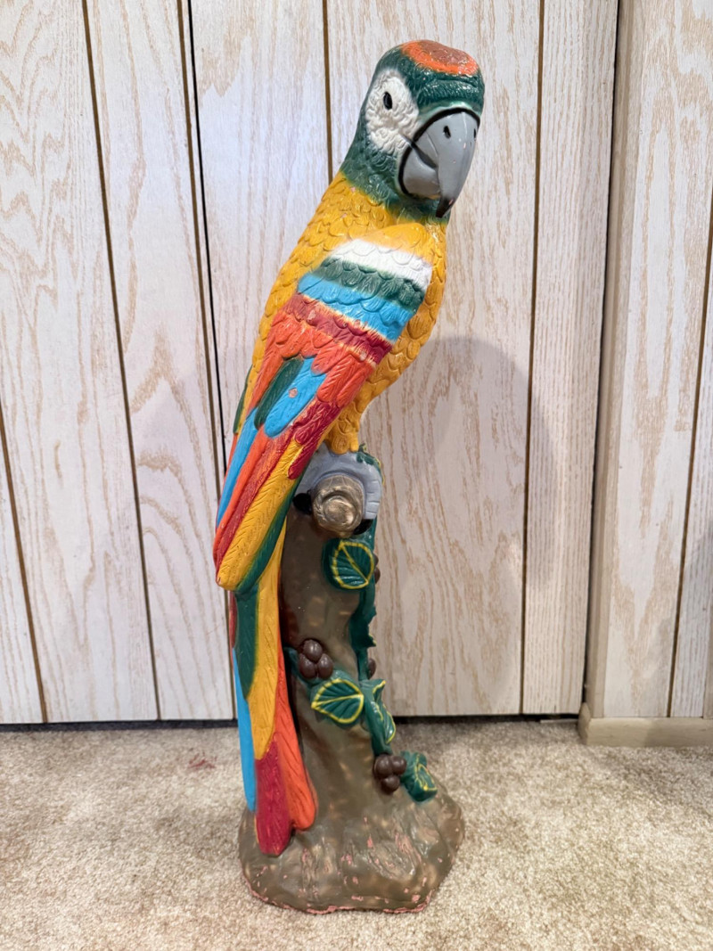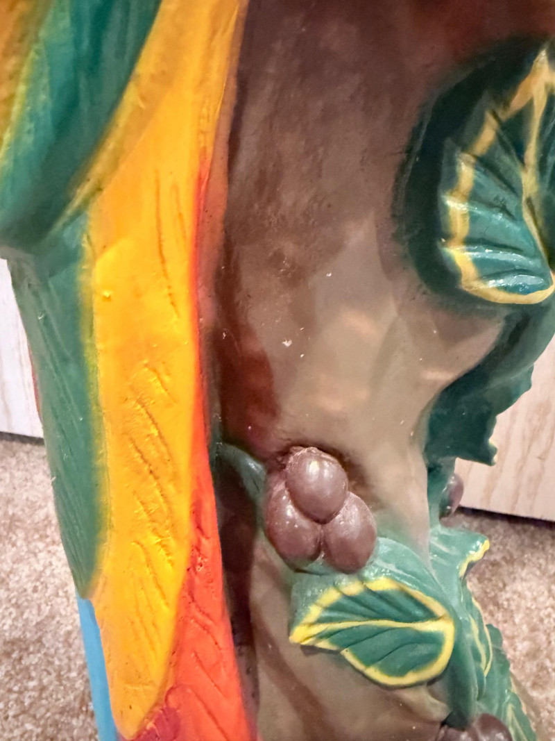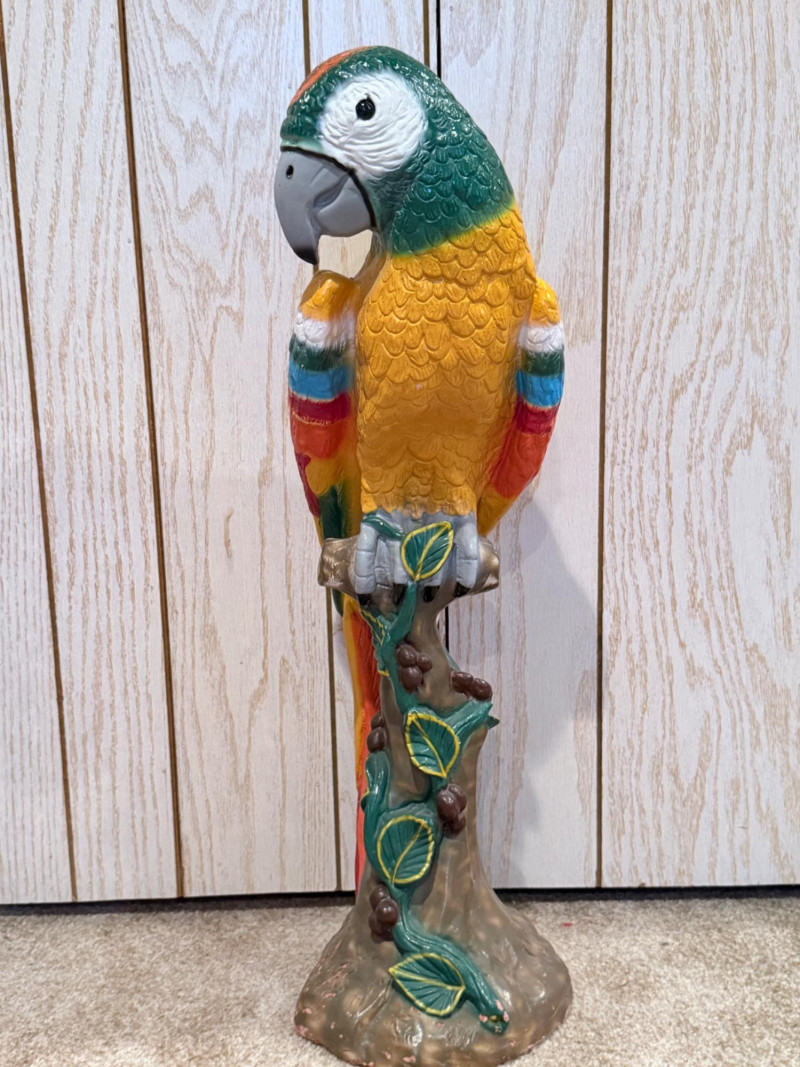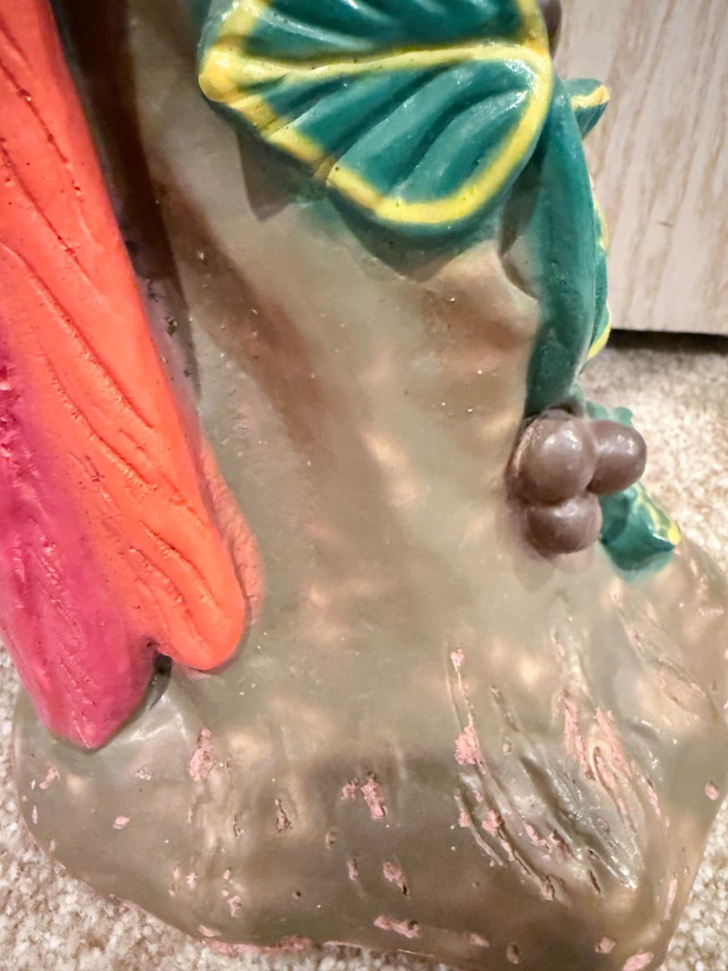 Large Painted Ceramic Parrot Statue – 30” Tall Add a bold tropical flair to your space with this large hand-painted ceramic parrot statue. Perched on a tree-style base, the parrot features vibrant colors—yellow, green, red, and blue—with detailed feather texturing and a glossy finish. Details: Material: Ceramic Dimensions: Approx. 30" tall x 10" wide Design: Painted in bright tropical hues with sculpted feathers and vine-wrapped perch Base: Hollow with a central hole, possibly for drainage or mounting Condition: Displays well overall. There is a visible hairline crack near the beak and some minor paint chipping and scuffs (see photos). Sold as-is. Perfect as a whimsical garden accent, porch statement piece, or indoor decor for bird lovers and tropical themes