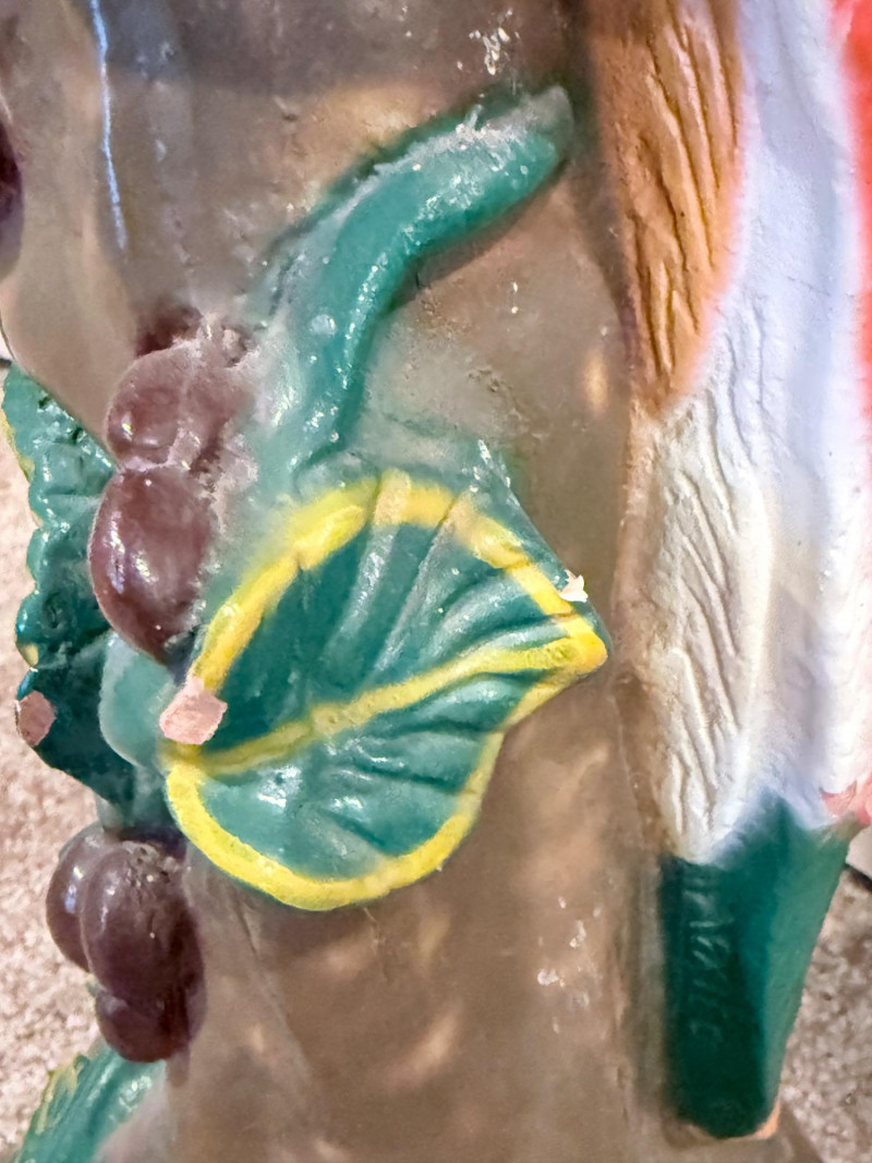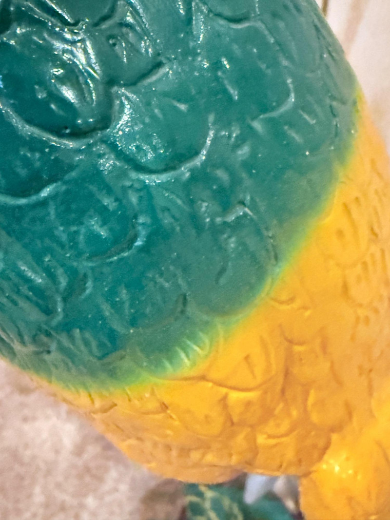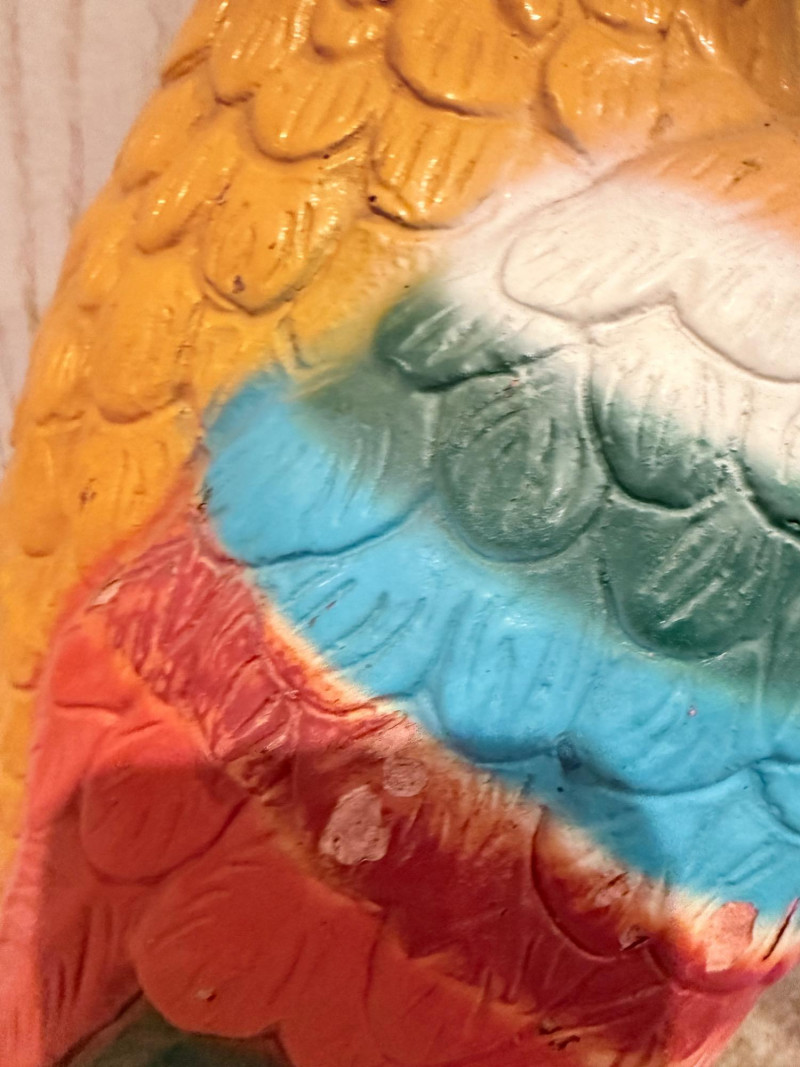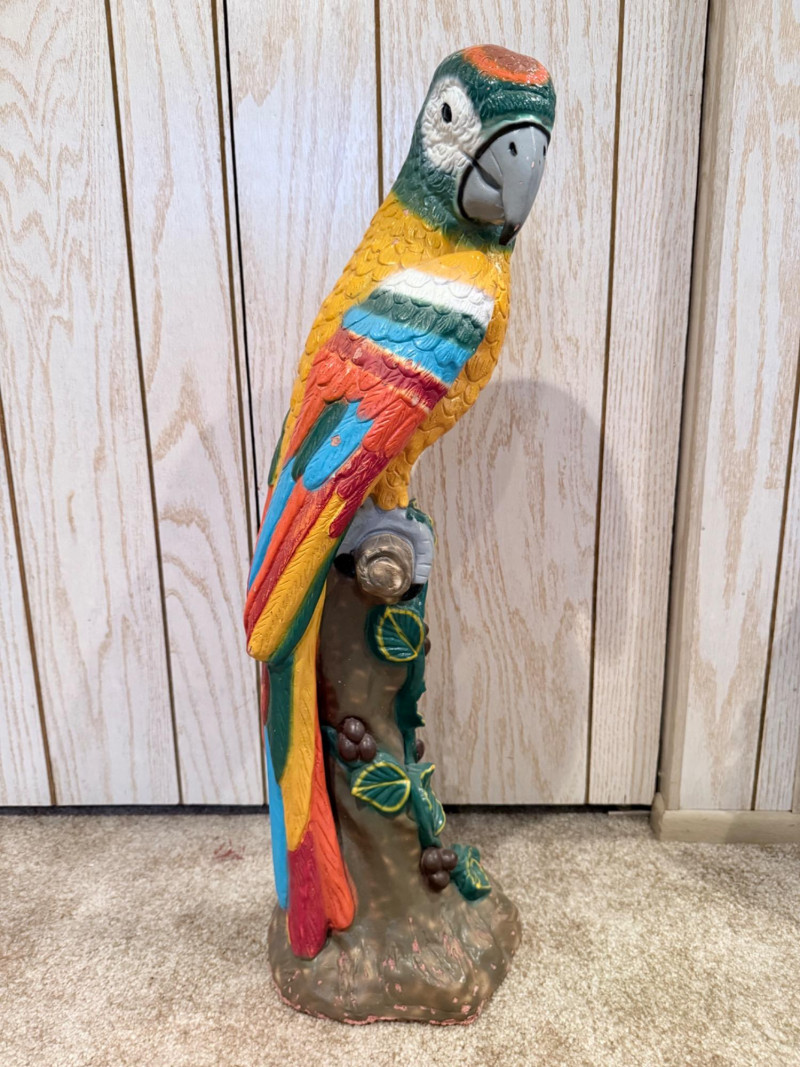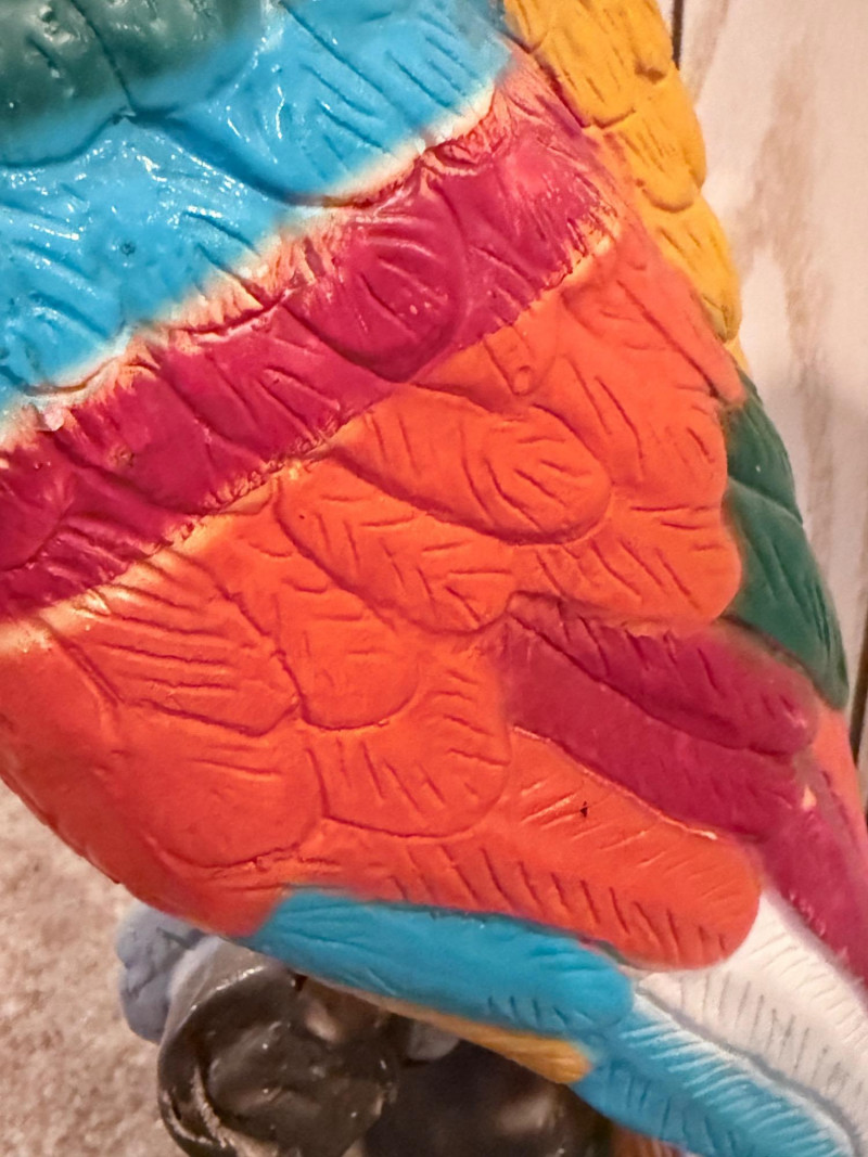 Large Painted Ceramic Parrot Statue – 30” Tall Add a bold tropical flair to your space with this large hand-painted ceramic parrot statue. Perched on a tree-style base, the parrot features vibrant colors—yellow, green, red, and blue—with detailed feather texturing and a glossy finish. Details: Material: Ceramic Dimensions: Approx. 30" tall x 10" wide Design: Painted in bright tropical hues with sculpted feathers and vine-wrapped perch Base: Hollow with a central hole, possibly for drainage or mounting Condition: Displays well overall. There is a visible hairline crack near the beak and some minor paint chipping and scuffs (see photos). Sold as-is. Perfect as a whimsical garden accent, porch statement piece, or indoor decor for bird lovers and tropical themes