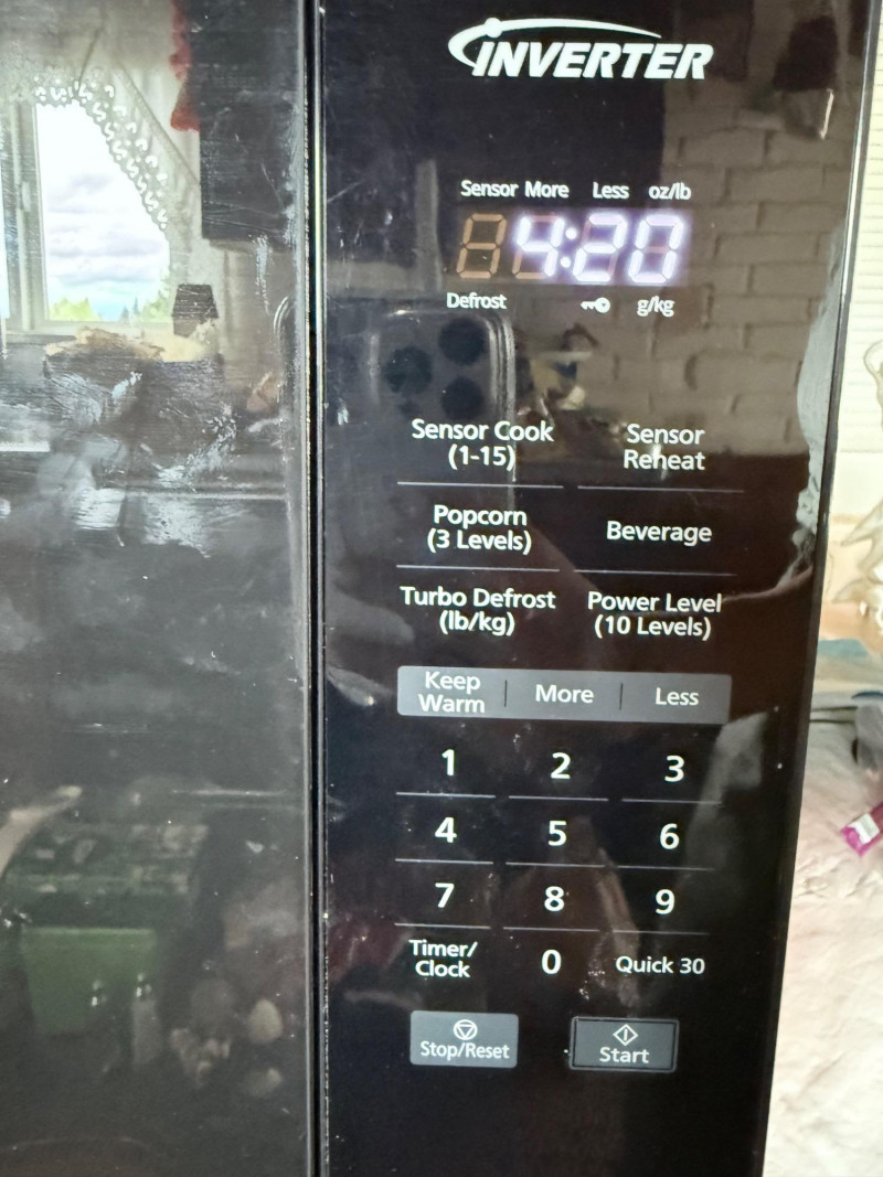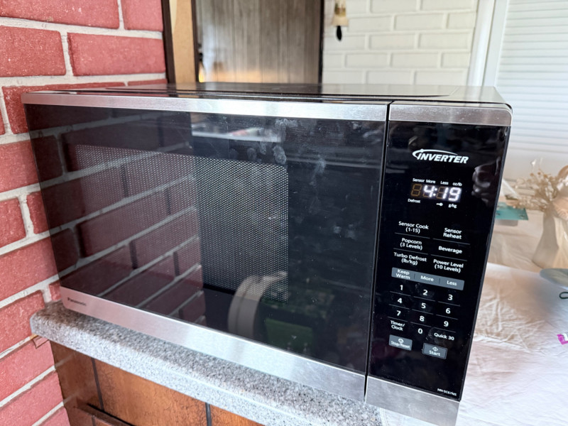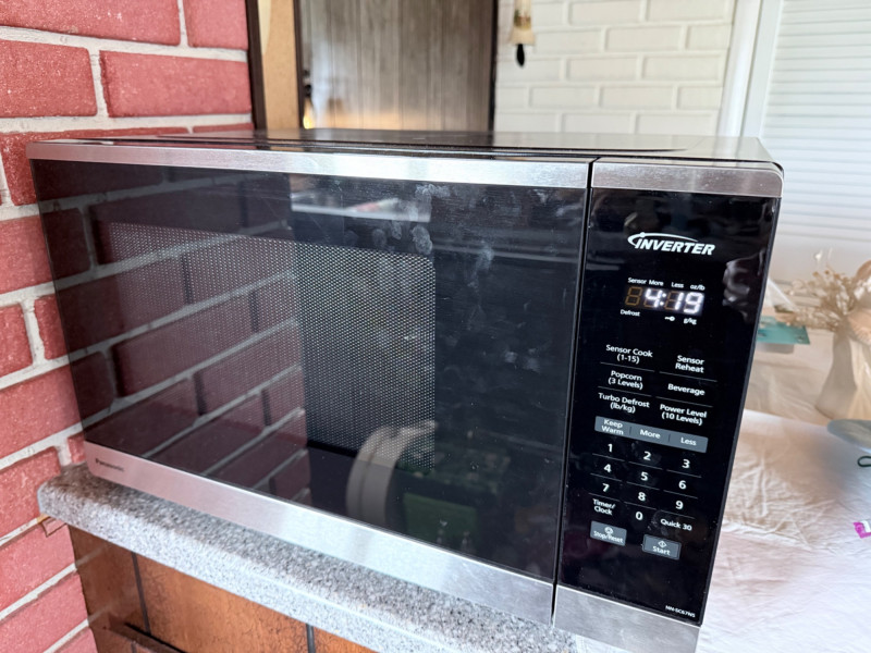 Panasonic Inverter Microwave – 1200W, Sensor Cook, Stainless Finish This Panasonic Inverter microwave combines powerful performance with sleek styling. With 1200 watts of cooking power and Inverter Technology, it ensures even heating and consistent results. Features a sensor cook and reheat function, turbo defrost, and a digital keypad with multiple power levels. Details: Brand: Panasonic Model: Inverter Series Power: 1200 watts Exterior Dimensions: Approx. 20" W x 15" D x 12" H Features: Sensor Cook and Reheat Popcorn and Beverage presets Turbo Defrost 10 Power Levels Keep Warm function Digital display and touchpad controls Finish: Black with stainless steel trim Condition: Powers on and appears to be in good working condition with minor cosmetic wear