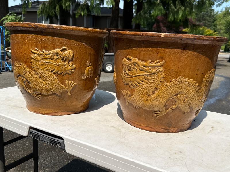 Two vintage plant pots with gold and brown color. Raised relief dragon carving. One of the dragons has some wear. Could use a cleaning