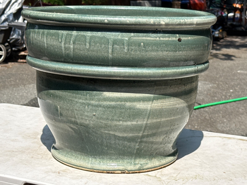 Beautiful, heavy glazed plant pot. Great color variations and quality. Some stripe/wave effect No drip pan.