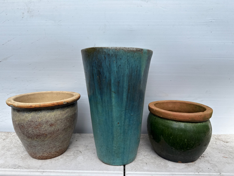 Variety of glazed ceramic plant pots. Green, Teal and brown color. Tapered pot is 14in tall, 9in wide Brown pot is 8in tall, 9.5in wide Green pot is 6.5in tall, 8.5in wide. Has 2 small chips