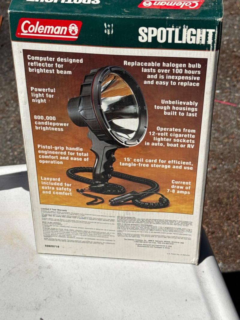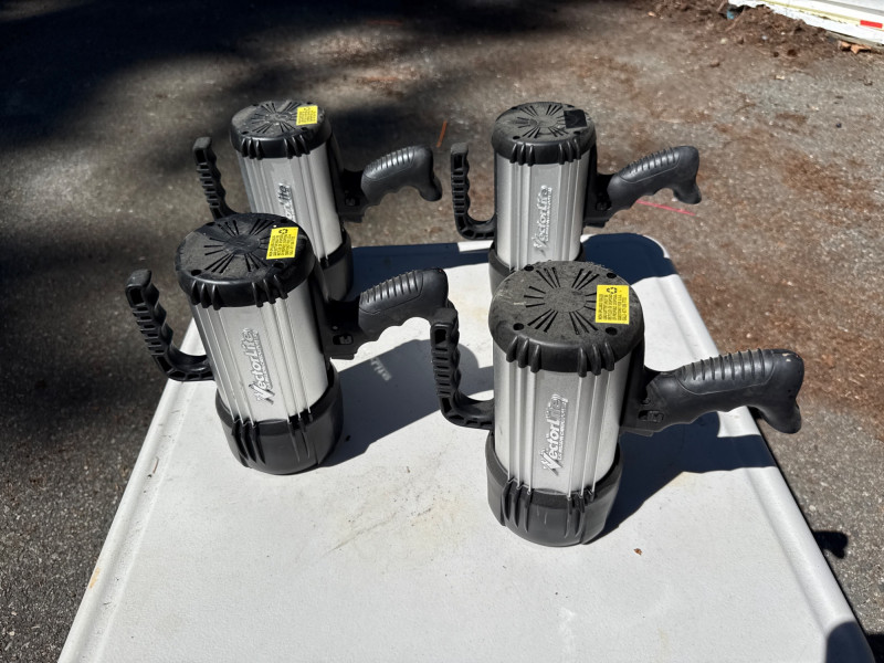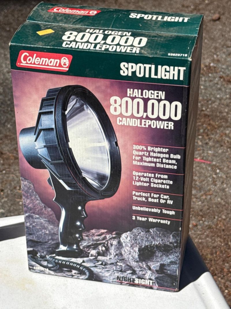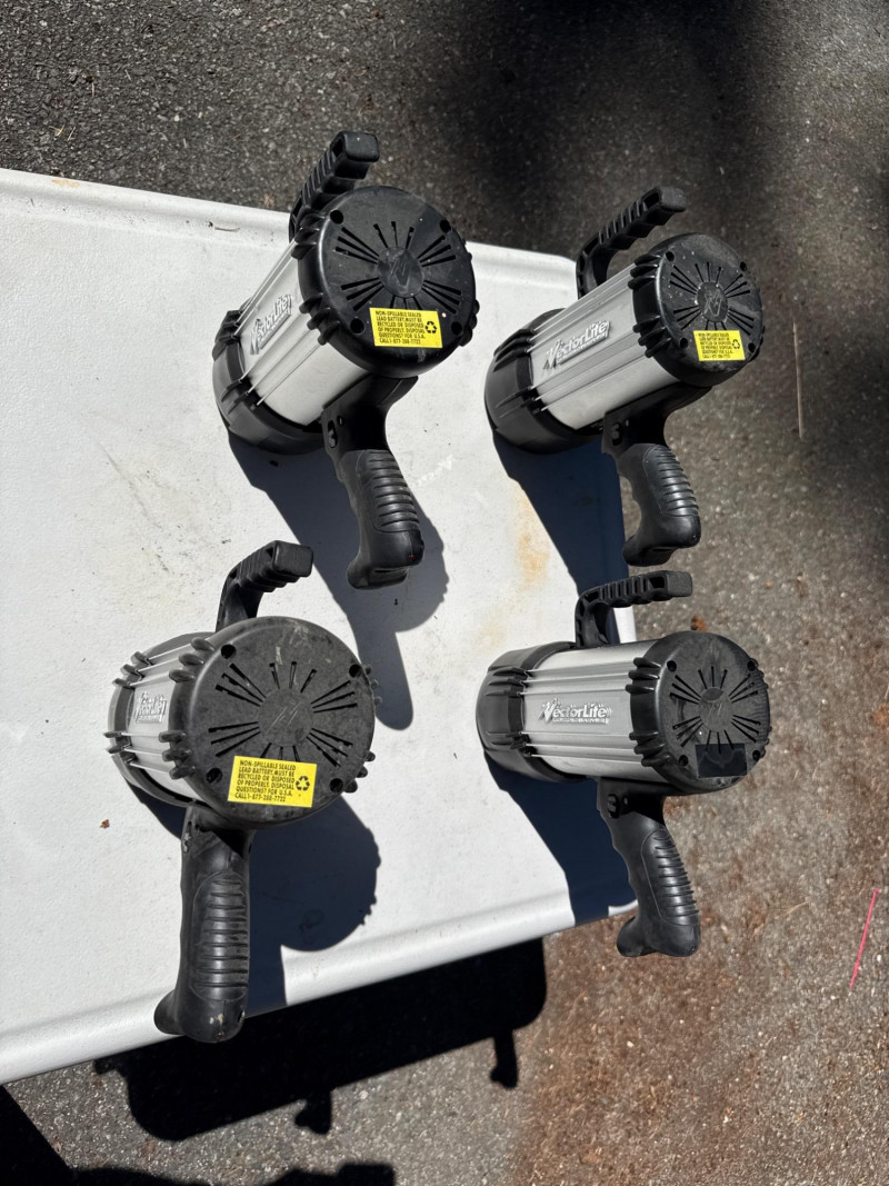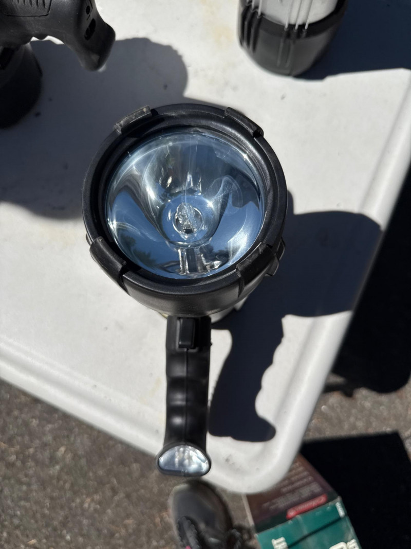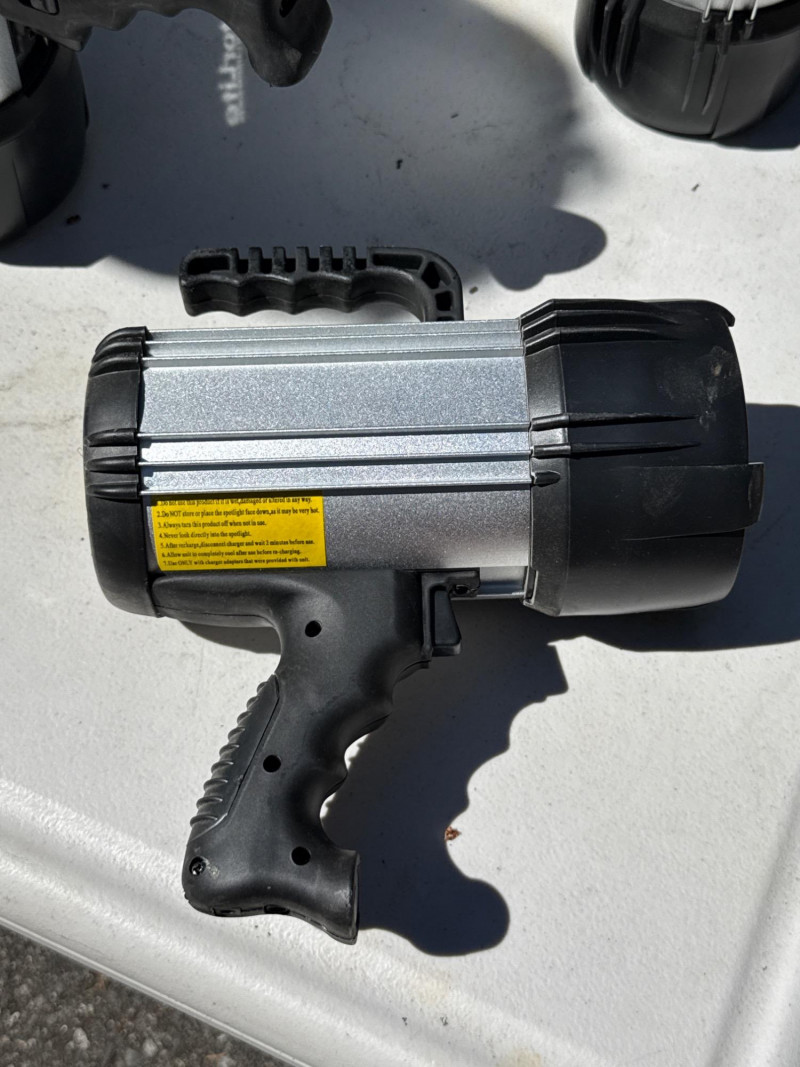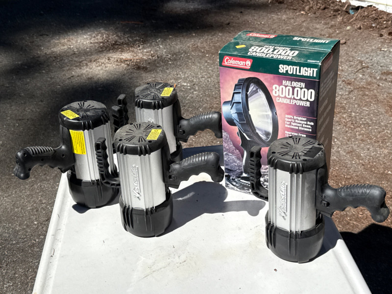 Heavy duty handheld spotlights. Batteries need charged. Have not located power cords at this time. Coleman spotlight is NIB 4 matching spotlights have two lights in one.