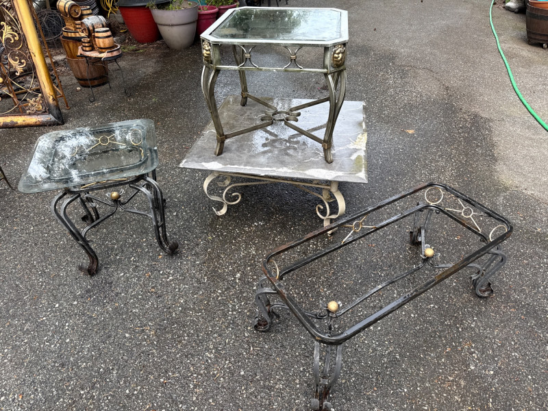 Four ornate tables with metal frames and glass/marble tops. Glass is beveled and in good condition. Needs cleaned. Large square table includes very heavy marble top. Will need two people to load. All need cleaned and have been used outdoors. Two are matching styles.