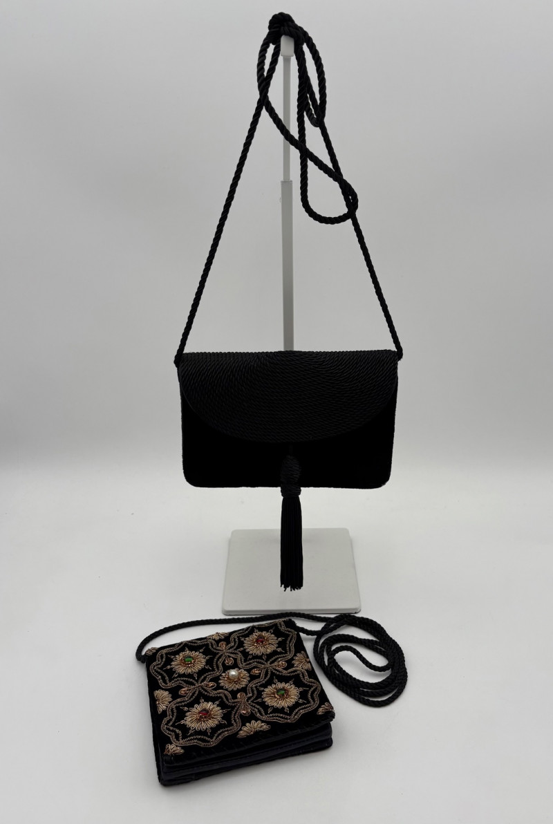 Two lovely velvet purses just large enough for a compact and other essentials. Classic black velvet purse from Ann Taylor has twisted cord shoulder strap, snap front closure with long tassel, and front flap with same twisted cord as strap. Interior has small pocket. In excellent condition. Measures 5" x 7" with a 23" drop from the top of the strap to the top of the purse. Square black velvet purse has embroidery & sparkle gems on the from with twisted cord shoulder strap. Interior has small pocket. In good condition (some pressed nap on the velvet back). Measures 5" square with a 24" drop from the top of the strap to the top of the purse. No maker label.