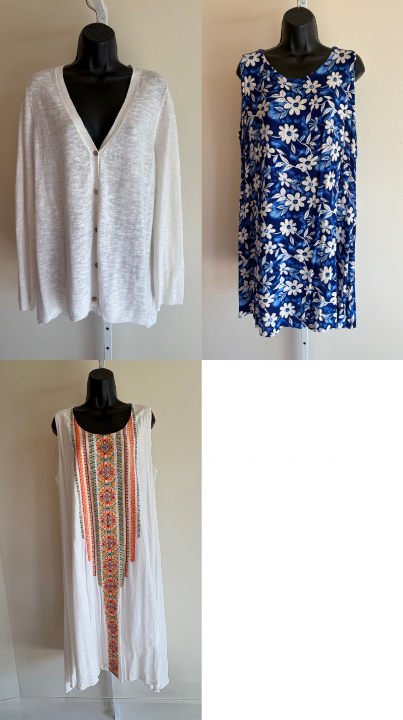 Two great summer dresses with a pure white cardigan for cooler evenings that will work with either dress. White gauze dress from Chico's has center front embroidery in cheery colors, curved pull-over neckline, and is fully lined. In excellent condition. Outer dress is 100% rayon with 100% cotton lining. Measures 22.5" pit to pit and 47" from back neckline to hem - note that hem is slightly longer & curved in back. Size tag says 3. Blue and white Hawaiian print floral from Hibiscus Collection of Hawaii has curved neckline, single back button closure, and A-line design. In excellent condition. 100% rayon. Measures 22" pit to pit and 32" from back neckline to hem. Size tag says OSFA (so NOT true!!!!) White lightweight open weave cardigan from Eileen Fisher has V-neck with 5 button front closure and ribbed cuffs & hem. Contrast white on white weave on sleeves and center back to add interest. In excellent condition. 56% organic linen with 44% organic cotton. Measures 23" pit to pit and 29" from back neckline to hem. Size tag says XL.