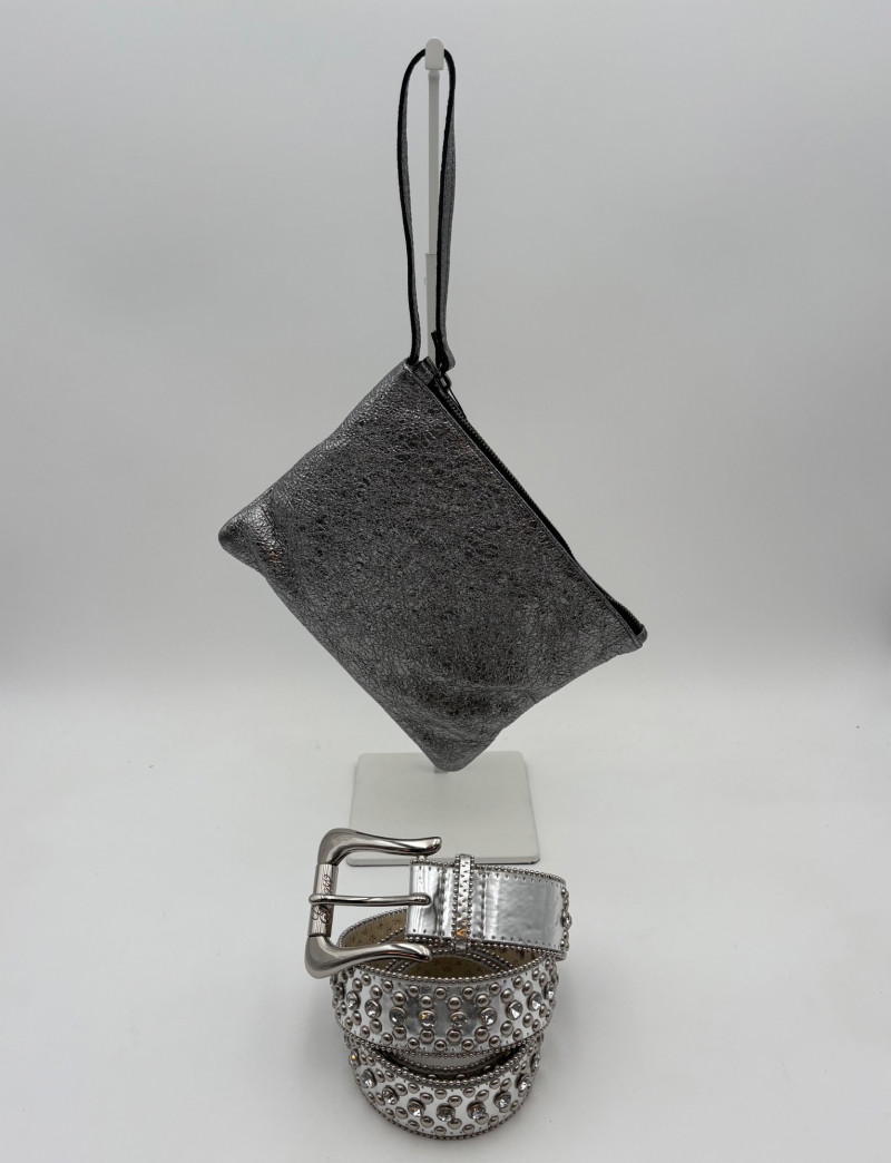 Shiny silver duo would go terrifically with anything black! Wrist purse from Eileen Fisher in a bit larger size than most - easily holds a phone & comb with lots of room left. Silver crackled leather exterior, metal zip top, 1/2" wide zip/wrist strap, and interior lining with card pockets. New with tag. Measures 6.5" x 8.5". Silver studded belt from Guess has rhinestones and a large buckle. Can accommodate waists from 39" to 43" In very good used condition - no content tag, but appears to be leather.