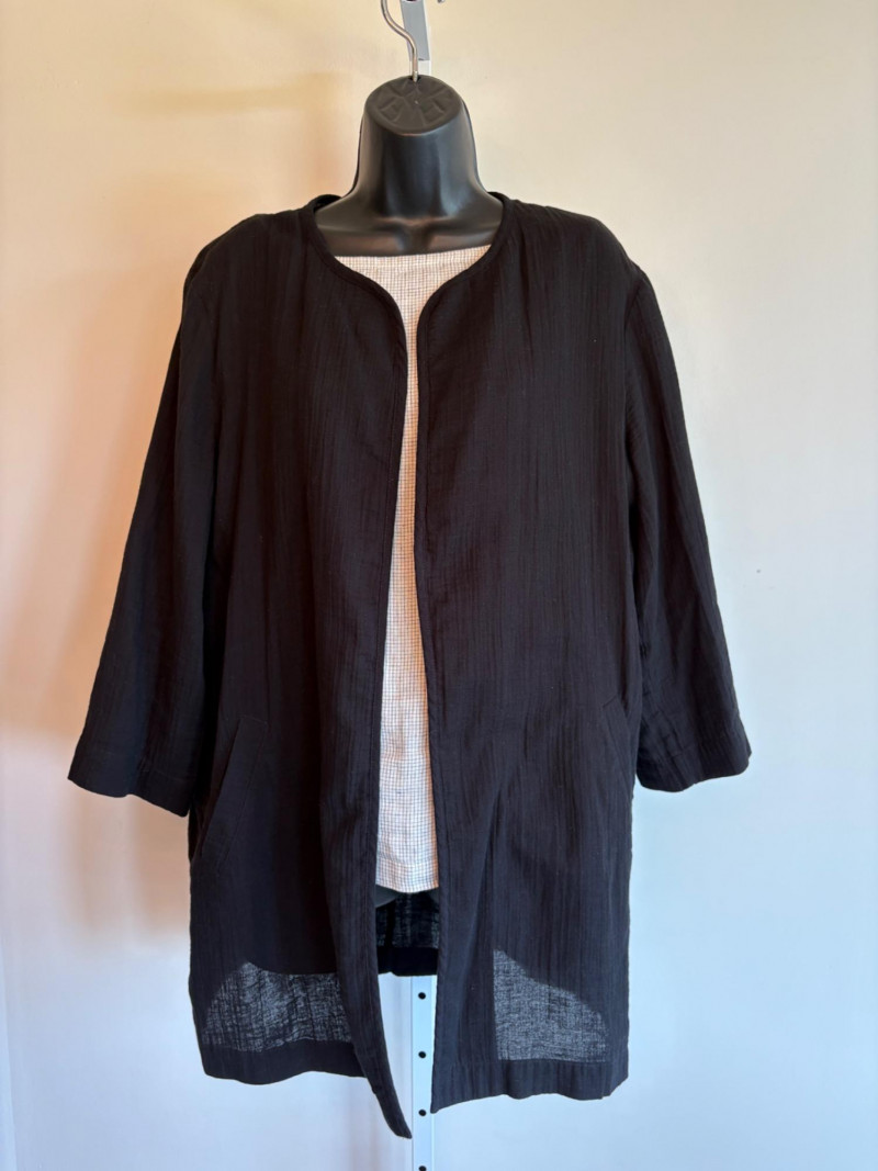 Great duo in black & white from Eileen Fisher. Gridded black on white shell has rounded neck and a slightly flared cut. in excellent condition. 100% organic linen. Measures 22.5" pit to pit and 23" from back neckline to hem. Size tag says L/G. Black gauze jacket has open front with banded edge along with angled front slash pockets with welts. In excellent condition. 100% organic cotton. Measures 24" pit to pit and 32" from back neckline to hem. Size tag says L/G.