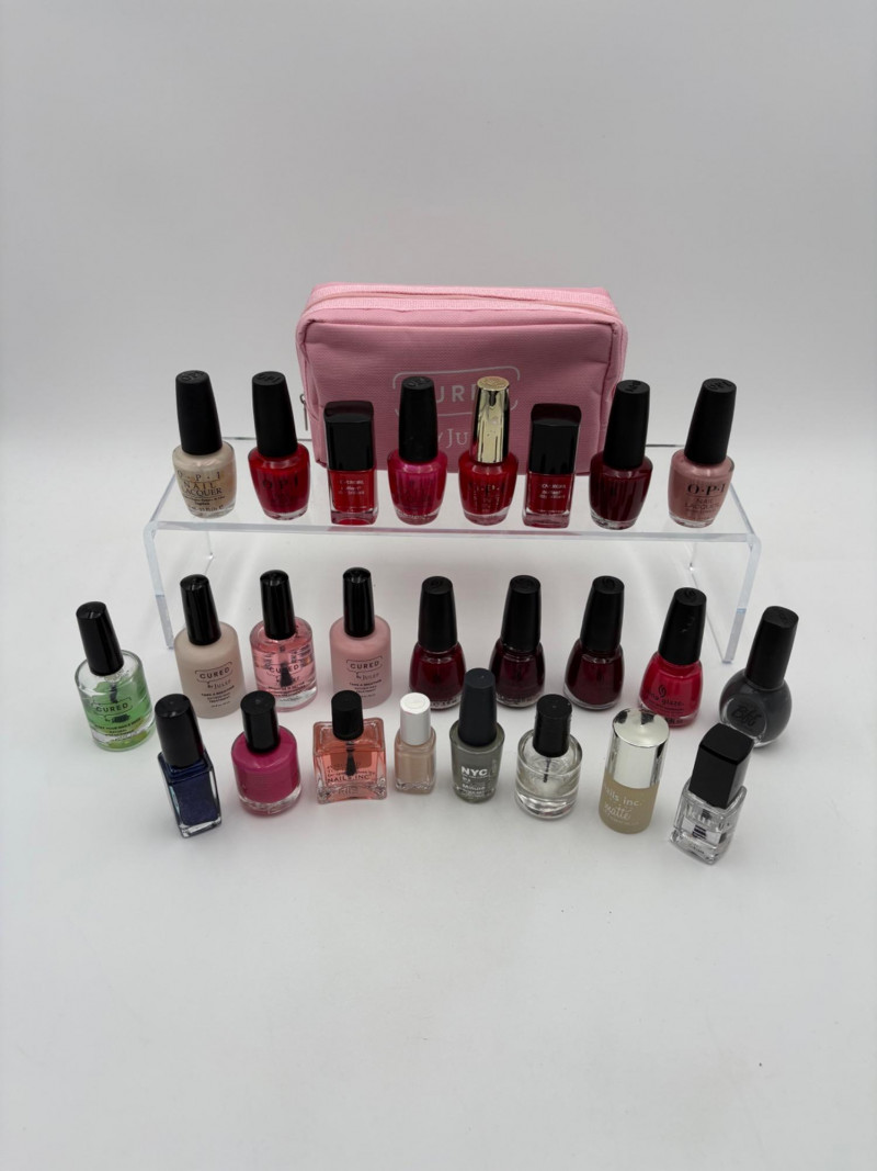 25 bottles of nail polish or nail product. Some have been used a bit, but most are full/nearly full and colors still vivid. (While we normally don't sell open items, nail polish has enough chemicals in it that we aren't worried about any contamination transfer to the new owner.) See photos for details.