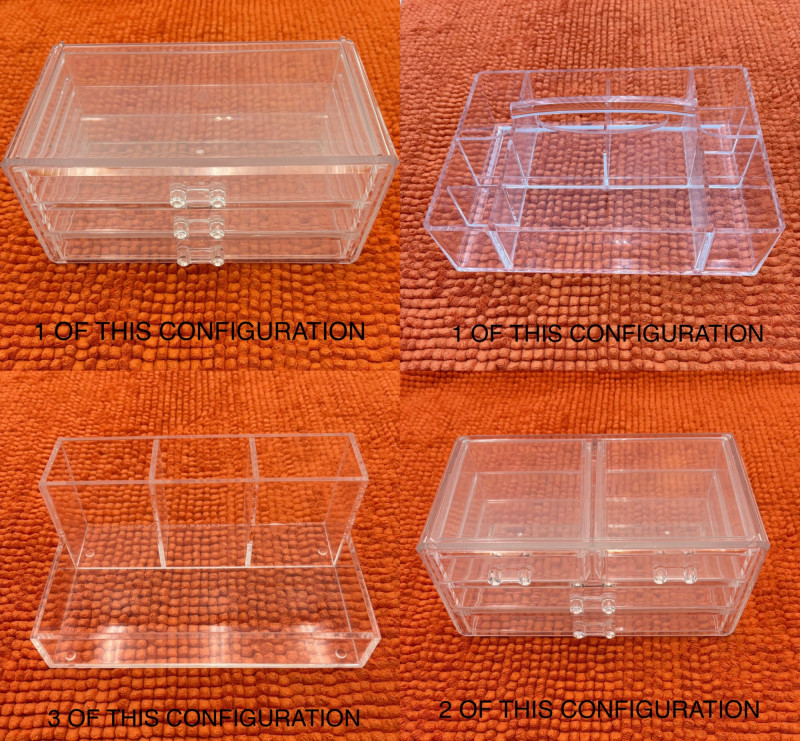 Wonderful group of acrylic storage for your makeup, skincare, jewelry or other needs. You can see what you have without opening anything up! All pieces could use a good wash. 3 open trays with tripartite holders in the rear. Measure 3.5" H x 9" W x 6" D. 1 handled tray with various size compartments. Measures 4" H at handle x 10" W x 7.5" D. 2 four-drawer chests with two wide lower drawers below 2 small drawers. Measures 4.5" H x 9.25" W x 6" D. 1 three-drawer chest with wide drawers. This chest measures the same as the two above, but has cracks on the lowest drawer handle. Doesn't affect the function of the drawer/drawer handle and not really very noticeable, but we wanted to mention.
