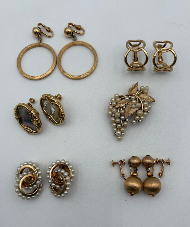 Vintage clip-on earrings from Napier and a pin from Trifari. See photos for details & maker marks.
